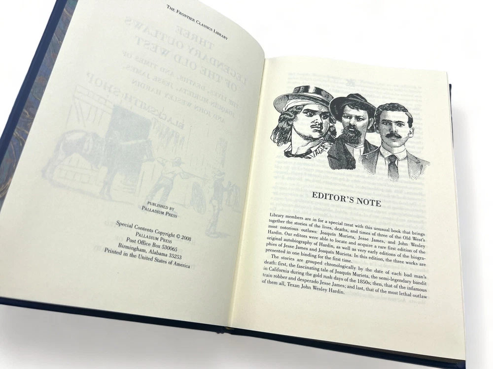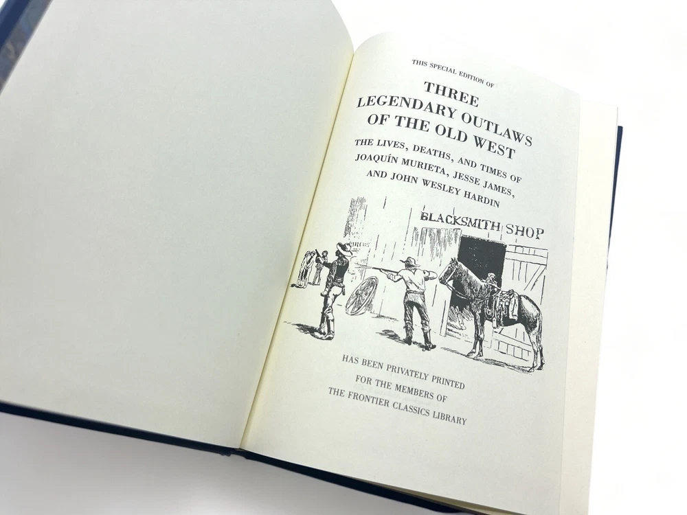 Birmingham, Alabama: Palladium Press, 2008. Full Leather. 22.5 x 15.5 cm. Octavo. Bound into full blue leather with gilt design, lettering, and foredges.4 raised bands to spine, marble endpapers. Printed for members of "The Frontier Classics Library". Contains reprints of three works "Murieta" by Grabhorn Press published 1932, 116pp, "Jesse James", by Barclay, published 1883, 96pp, and "The Life of John Wesley Hardin", by Smith & Moore, published 1896 Book is in great condition! Contains The lives, Desths, and times of Joaquin Marieta, Jesse James, and John Wesley Hardin