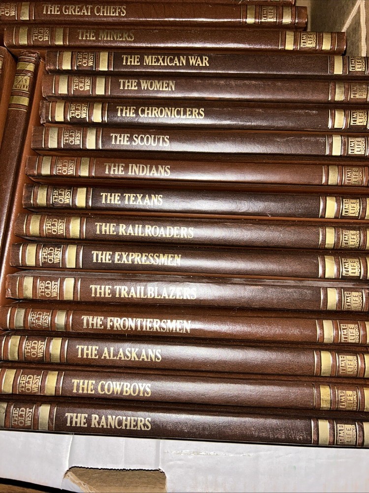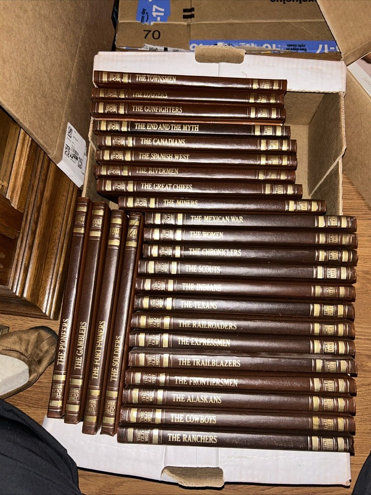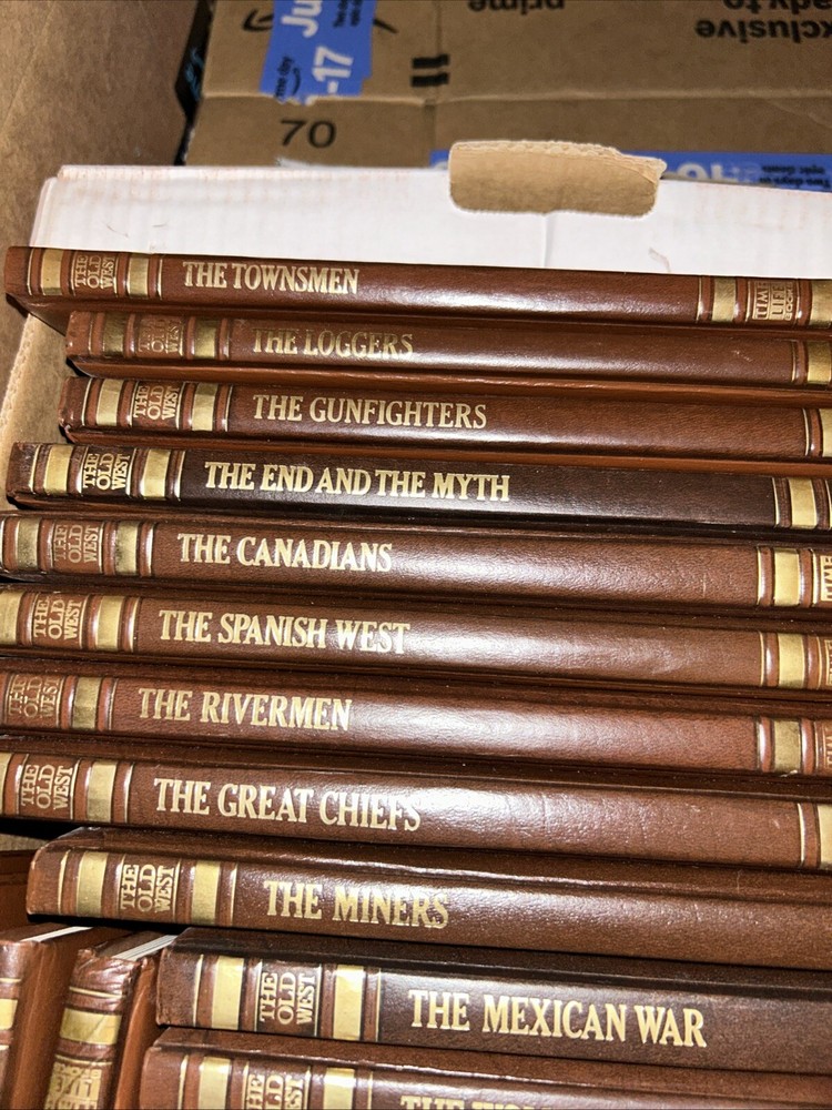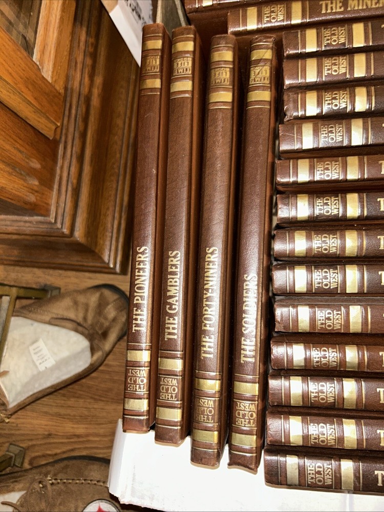 The product is a vintage 26-volume set of Time-Life Books titled "The Old West." The set features leatherette hardcover editions focusing on Cowboys, Pioneers, and other aspects of American history. It is a nonfiction picture book series with illustrations, intended for young adults and adults. Published by Time Life Books in 1973 in the United States, the set covers topics in Western history and is part of the Time-Life The Old West series.