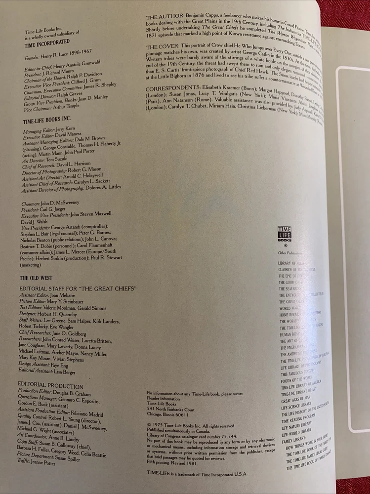 Time Life Old West Series The Great Chiefs Hardcover Embossed Leather-look Gently used. No markings, folds, tears, or other damage. Some small dents in the back cover. Please see photos for full description and condition. Inventory #032422