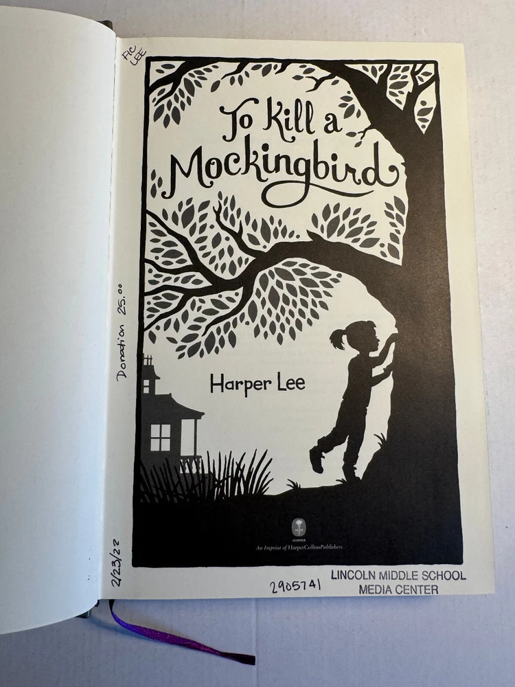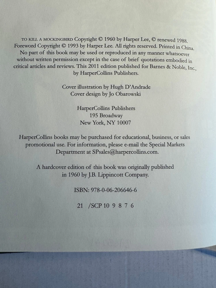 A nice hardcover copy of To Kill a Mockingbird by Harper Lee (Barnes & Noble, 2011, 6th Printing). Leather binding. Gold gilded page edges. Cloth bookmark. This is an ex-library copy that does not appear to have ever been checked out (or read). Condition Notes: “Good” condition: Ex-library copy with checkout date paper and small library marks/stamps, looks and feels unread, all pages are crisp and unmarked with no writing/highlighting/underlining, clean page blocks, spine and page block still feel very tight, very light wear to board edges/corners, glossy boards with a faint bit of scuffing toward bottom of spine (looks like a library spine sticker may have been removed) - All books ship from a nonsmoking home - The books you see are the books you will receive Shipping - Shipping will be via USPS Media Mail. I usually ship with books wrapped in bubble wrap inside padded envelopes or small boxes. - I am happy to combine shipments. Please contact me for a shipping quote if you are interested in multiple items. If you win more than one auction, please wait for a new invoice with a shipping adjustment before paying.