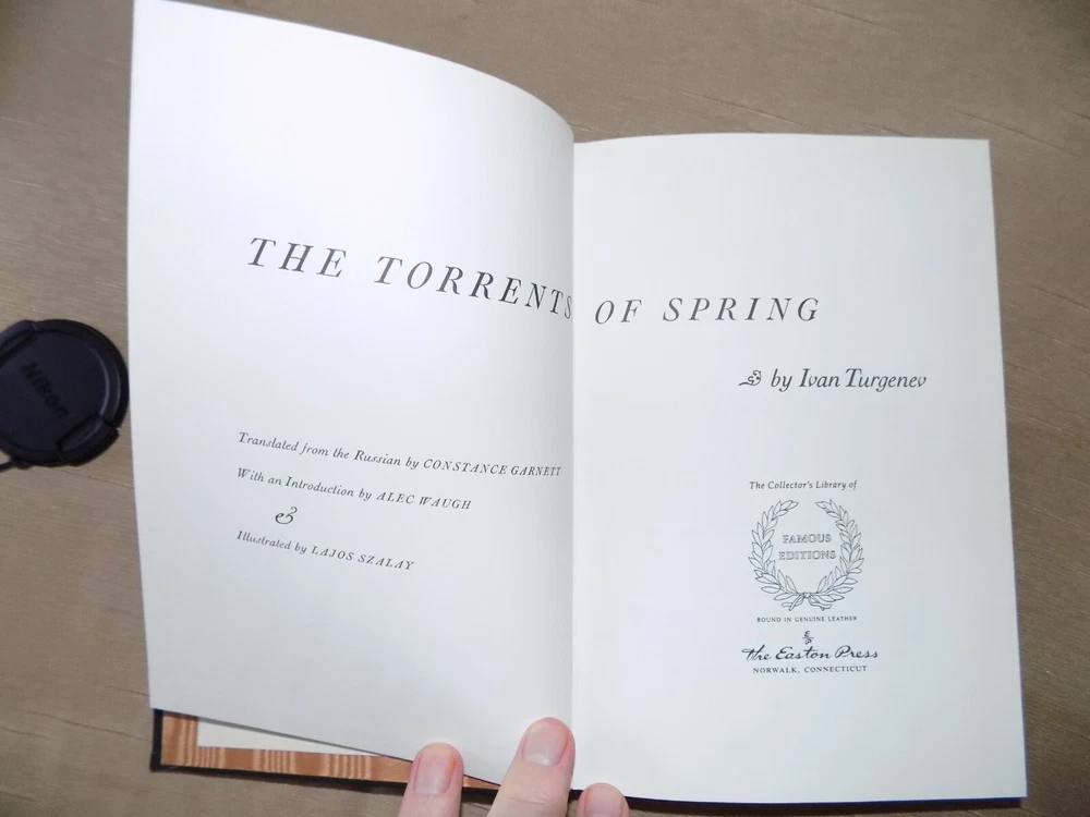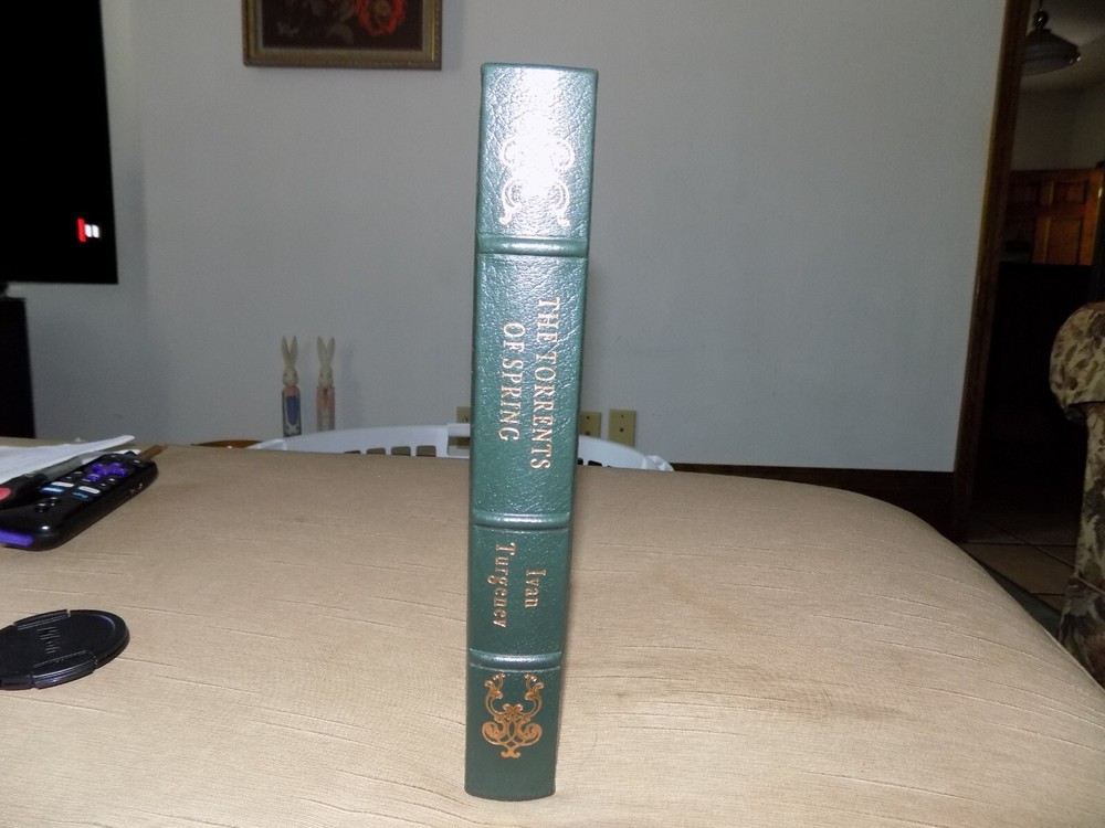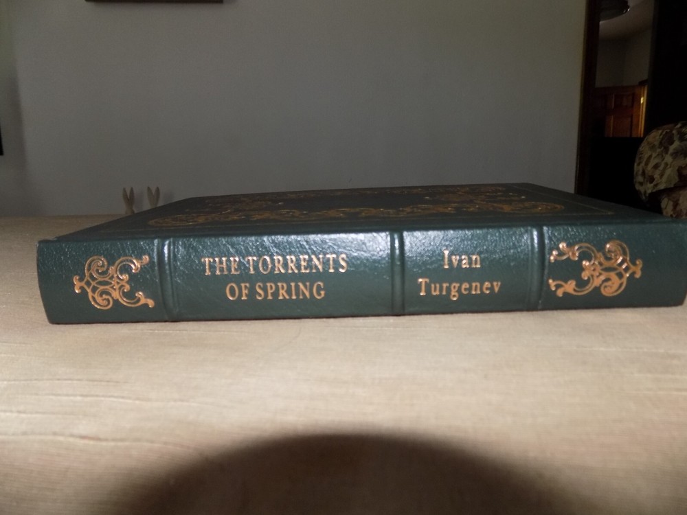 Easton Press...Full Leather...Gold Gilding...Sewn in silk book mark...Famous Editions This book is in Very Good Condition except there is a black mark on the back cover (see photo)...the pages are clean and crisp...there is no writing or highlighting...there is no previous owners book plate...the binding is tight and secure... 9 1/2" x 6 3/4" x 1 1/2", 187 pages. I will package it so it remains in the same condition when it gets to you, it will not be shipped in a padded envelope. Multiple purchases will be shipped together at a cost of $1.50 for each additional book purchased. This is a beautiful leather-bound copy of "Torrents of Spring" by Ivan Turgenev, published by Easton Press. It is a wonderful addition to any book collection. Torrents of Spring , also known as Spring Torrents is an 1872 novella. It is highly autobiographical in nature, and centers on a young Russian landowner, Dimitry Sanin, who falls deliriously in love for the first time while visiting the German city of Frankfurt. Written during 1870 and 1871, when Turgenev was in his fifties, the novel is widely held as one of his greatest. Despite its fictional overlay, Torrents of Spring is inspired by the events of Turgenev's life during his 1838-1841 tour of the German States. Torrents of Spring is significant in its revealing of the author's life, thoughts, and most intimate. T he character of Gemma Roselli was inspired by an incident which took place while the future novelist was visiting Frankfurt in 1840. A young woman "of extraordinary beauty suddenly emerged from a tea-room to plead for help in reviving her brother, who had fainted." But, unlike Gemma, the young woman was Jewish rather than Italian and, unlike Sanin, Turgenev left Frankfurt that same night without getting to know her further.