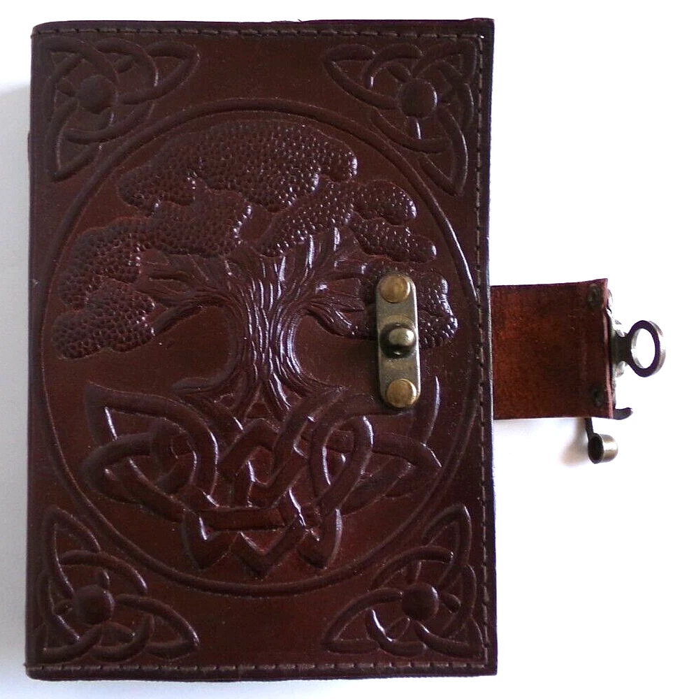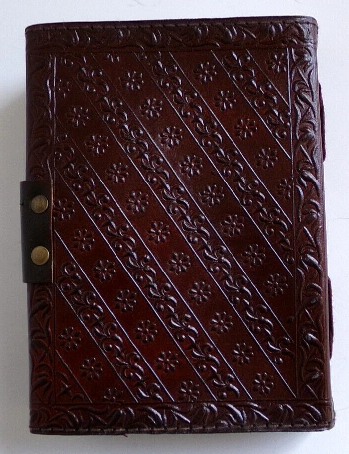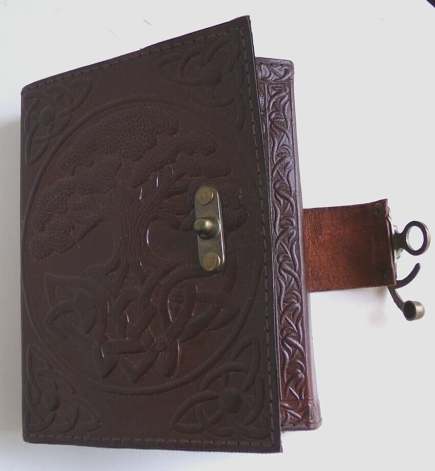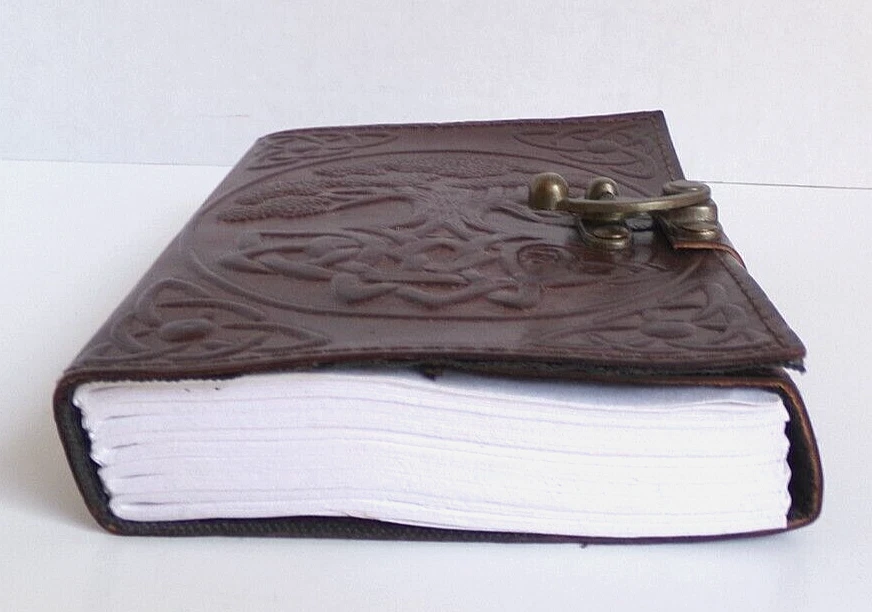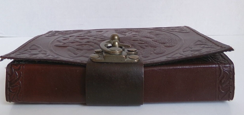 This is a Tree of Life embossed vintage leather bound journal, handmade in India. It features a collector's edition design, with no signatures or personalization.Height 7" x Width 5" x Length 1 1/4". Weight 11.4 oz. The clasp is made of brass and locks shut by sliding it across. The journal contains blank pages, suitable as a diary or notebook. Thank you for looking.