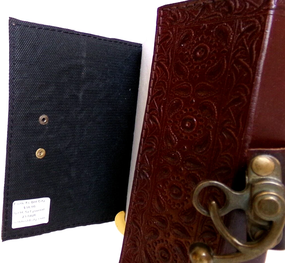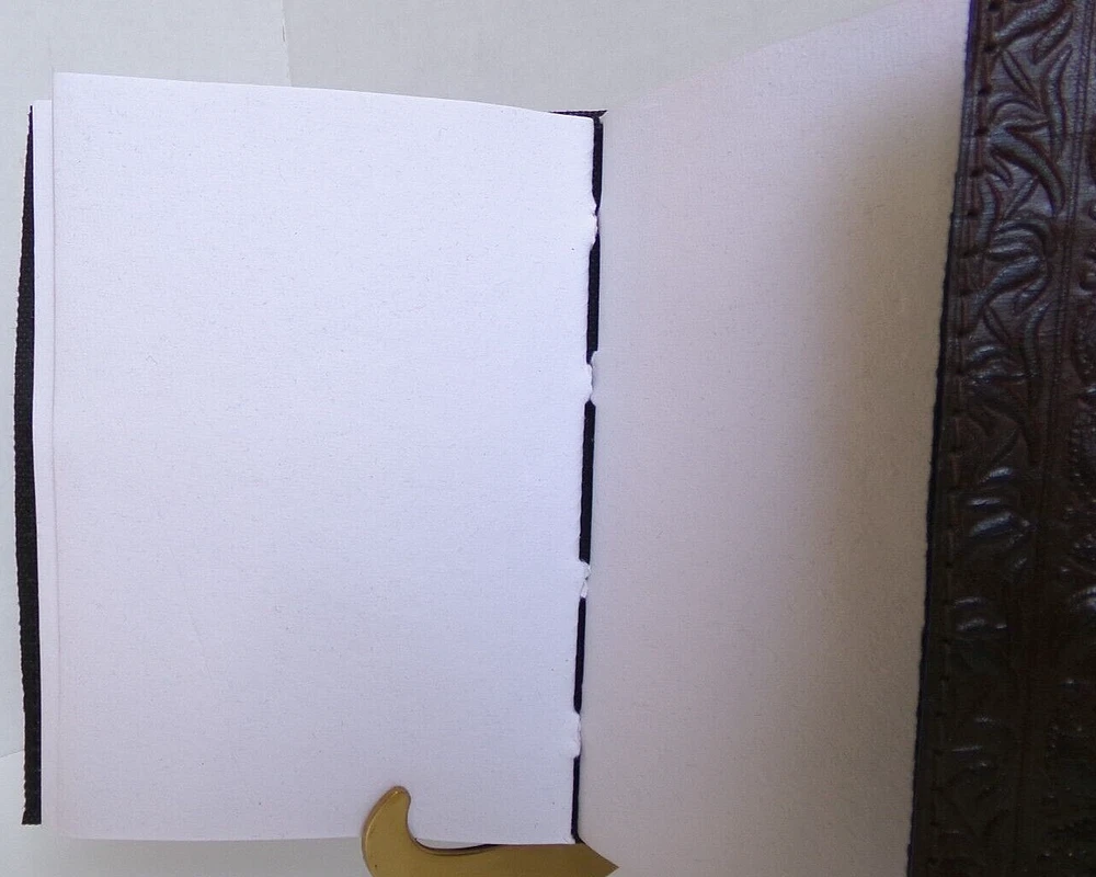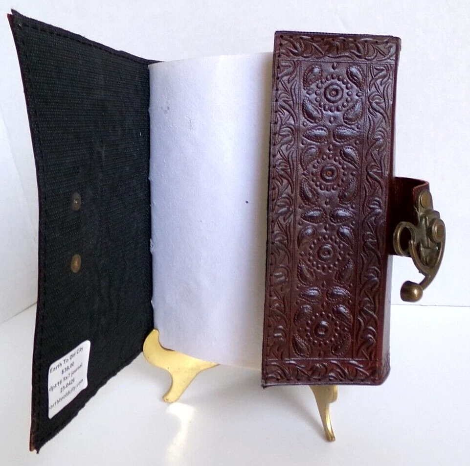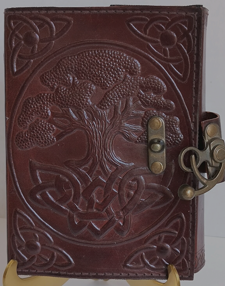 This is a Tree of Life embossed vintage leather bound journal, handmade in India. It features a collector's edition design, with no signatures or personalization.Height 7" x Width 5" x Length 1 1/4". Weight 11.4 oz. The clasp is made of brass and locks shut by sliding it across. The journal contains blank pages, suitable as a diary or notebook. Thank you for looking.