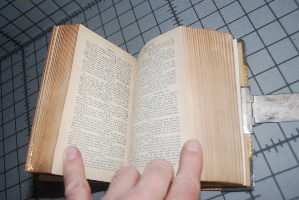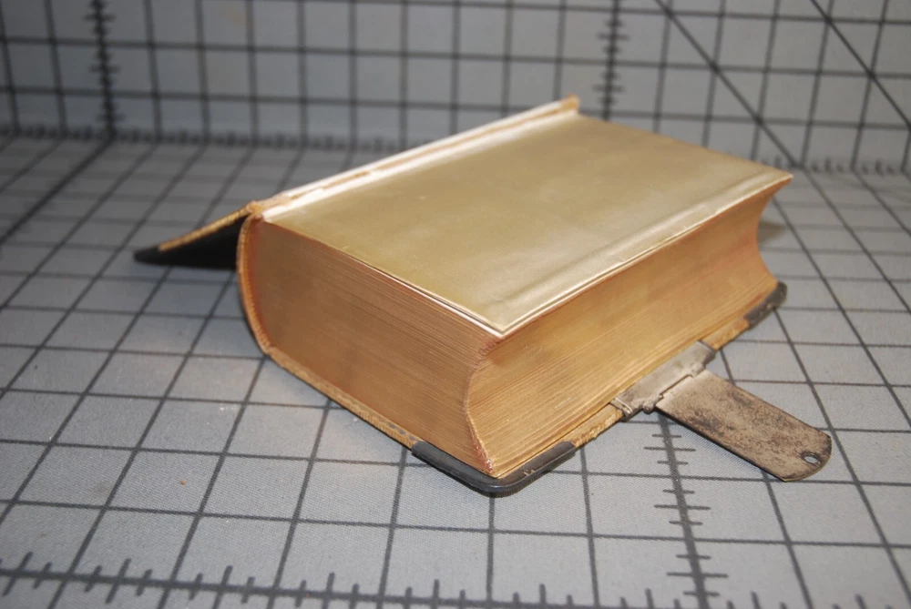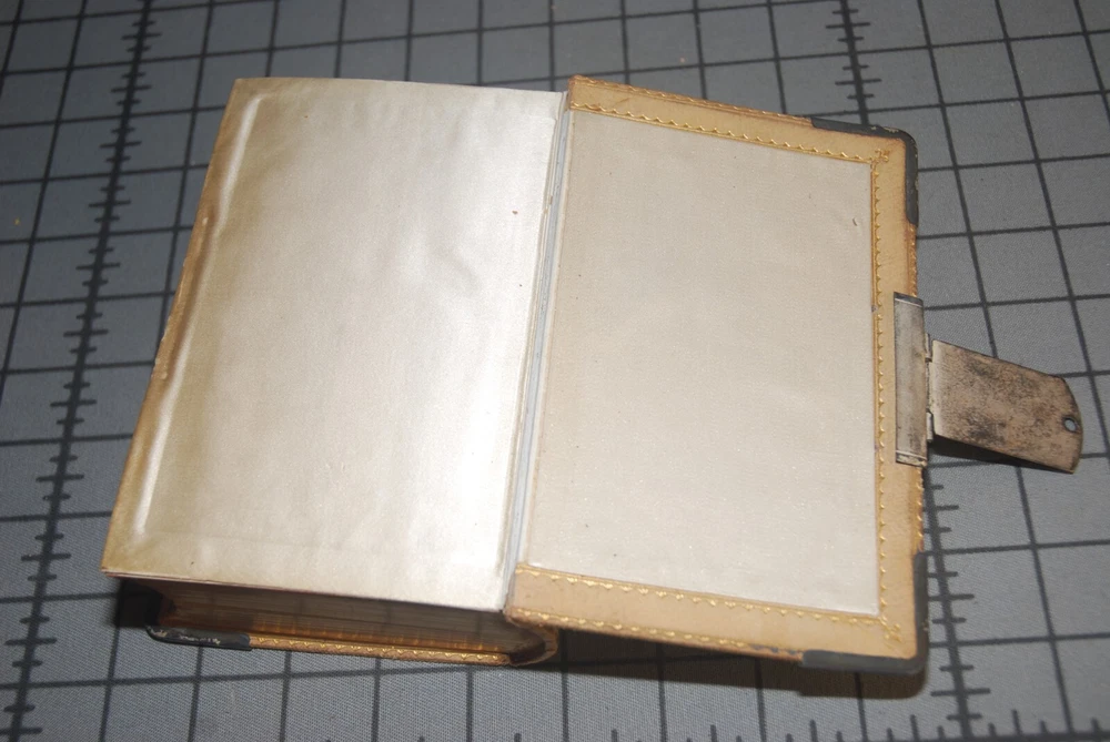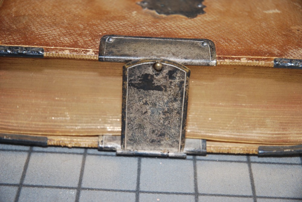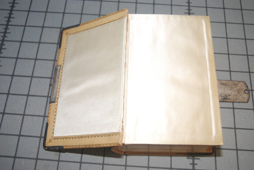 Have a look at the photos for condition and for what’s included.The book is adorned with marked sterling silver corner protectors, an engraved plaque on the cover and clasp. The page edges are gilt gold. The whole book is in very nice condition as seen in my photos above. Measurements are about 4 ½” by 6 ¼” by about 2” thick.