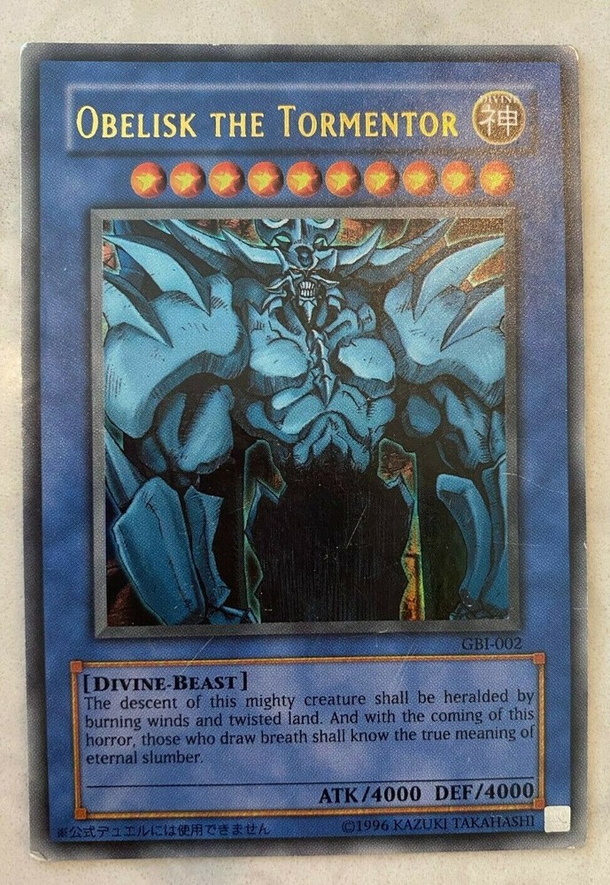 Collectible Blue Yugi-oh Card: Obelisk the Tormentor, GBI-002. Used card with some wear around corners (as shown by pictures). You will be receiving the actual card pictured. Includes a plastic UltraP...