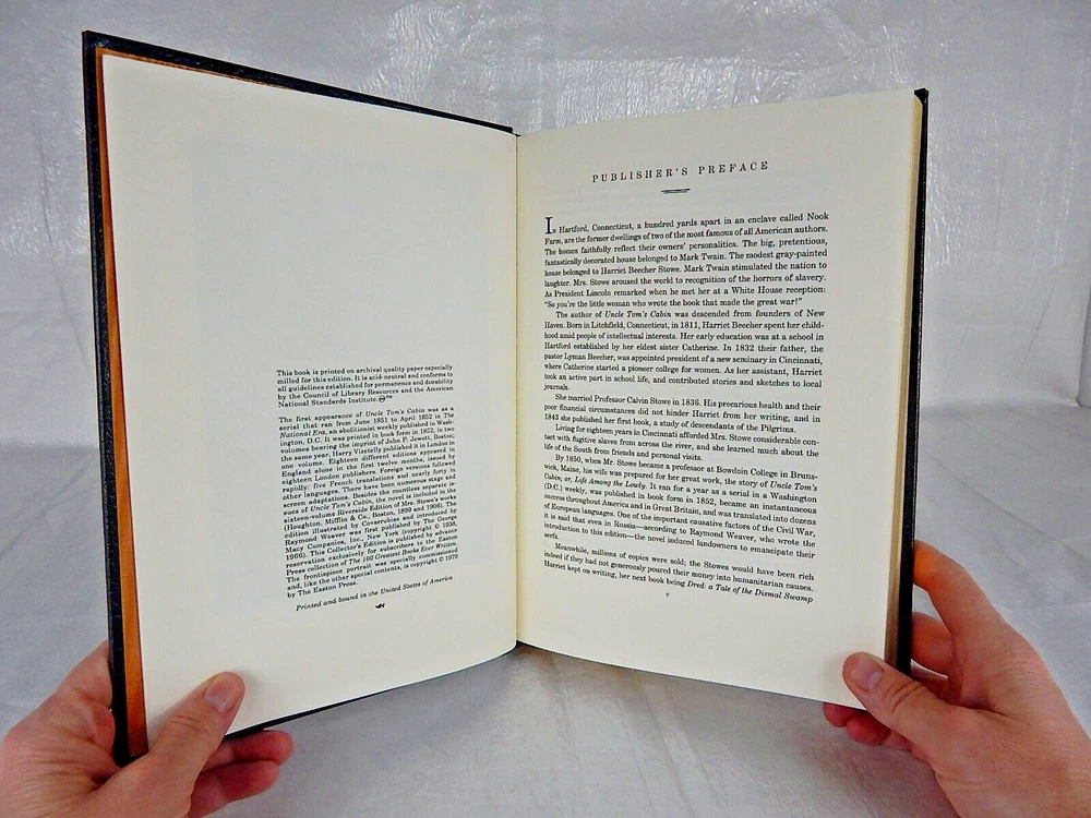 UNCLE TOM’S CABIN or LIFE AMONG THE LOWLY The 100 Greatest Books Ever Written Collector’s Edition Harriet Beecher Stowe The Easton Press The advertised price is only $48.88 + shipping, applicable taxes/fees (buyer pays). Please ask any questions, look at all of the actual photos provided and read all of the information/ description before purchase. (actual photos)