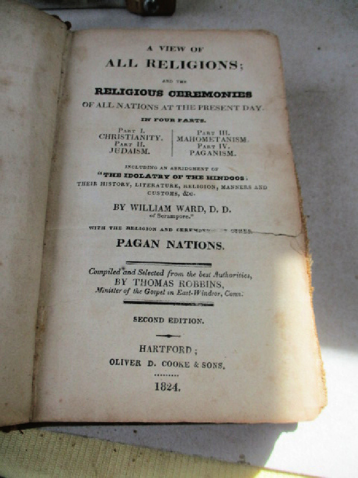 i 697. Including Pagan Nations, Compiled & Selected by Thomas Robbins, Minister of Gospel in East Windsor, CT. Published by Oliver D.Cooke & Sons, Hartford, CT., 1824, Second Edition. Plus, William Ward D.D. and his "Idolatry of The Hindoos". 12mo, 249 pages, index; 191 page appendix, full calf covers. Illustrated in black & white.......may be wood block engravings. Fragile pages with several tears. Front hinge is cracked. Acceptable condition. Do not hesitate to e-mail with any questions. As Always, Satisfaction Guaranteed! I expect to receive payment within 10 days, unless we have made other arrangements. Shipping will be USPS Media mail or Priority, if requested. I'm glad to combine multiple purchases in order to minimize shipping costs. I WILL SHIP INTERNATIONALLY, and I try to be as economical as possible with the shipping costs. RETURN POLICY: Satisfaction Guaranteed! Track Page Views With Auctiva's FREE Counter