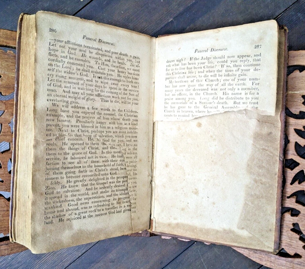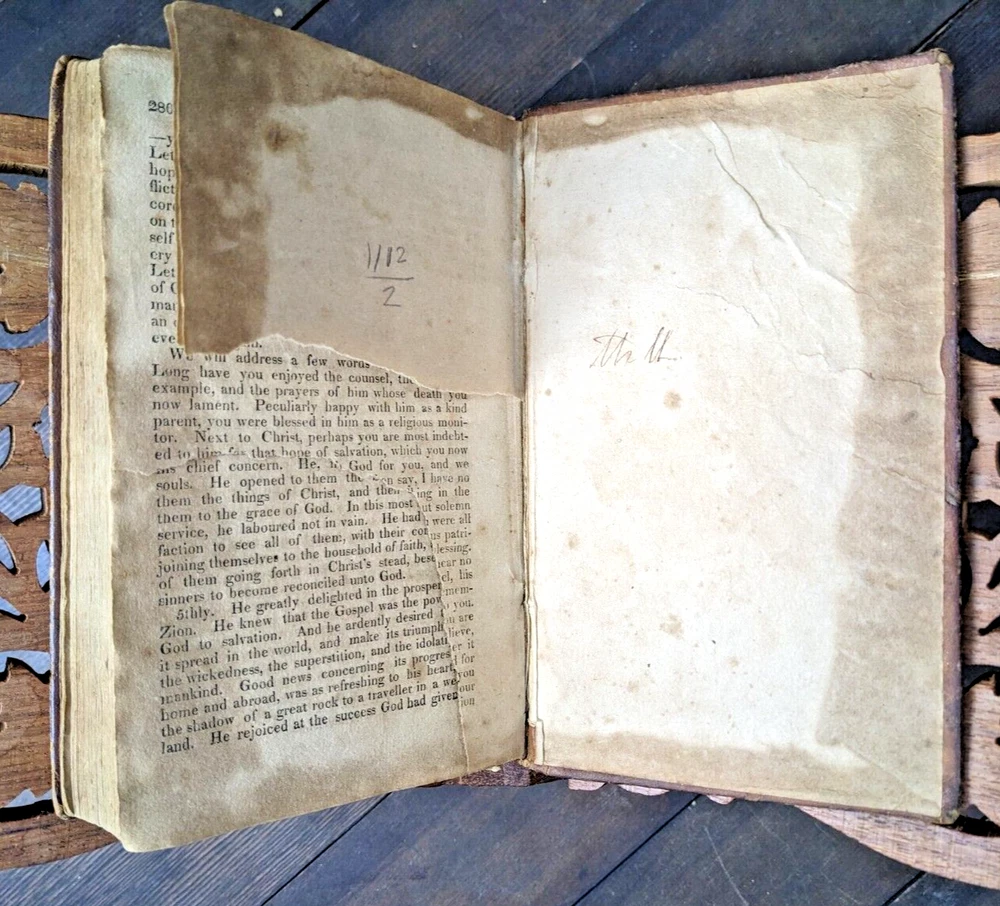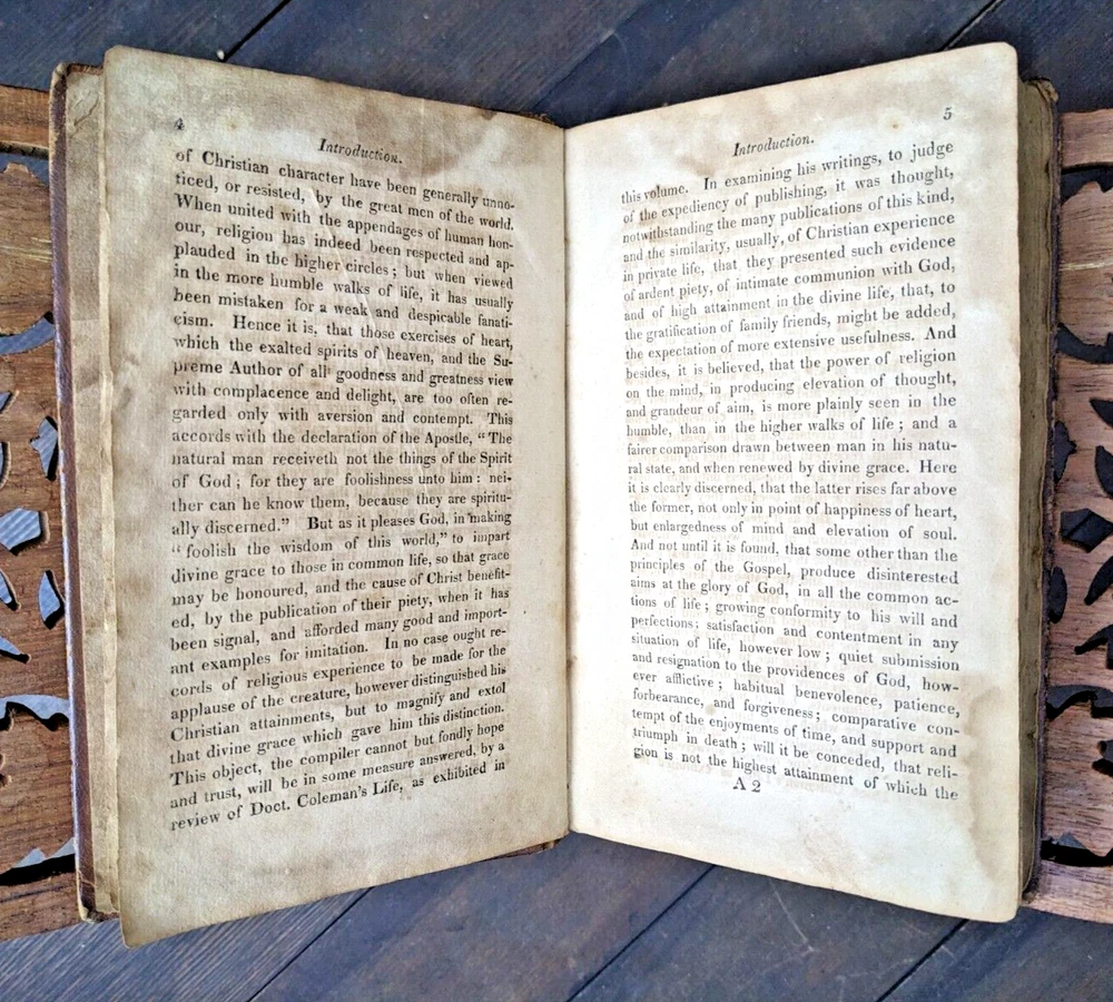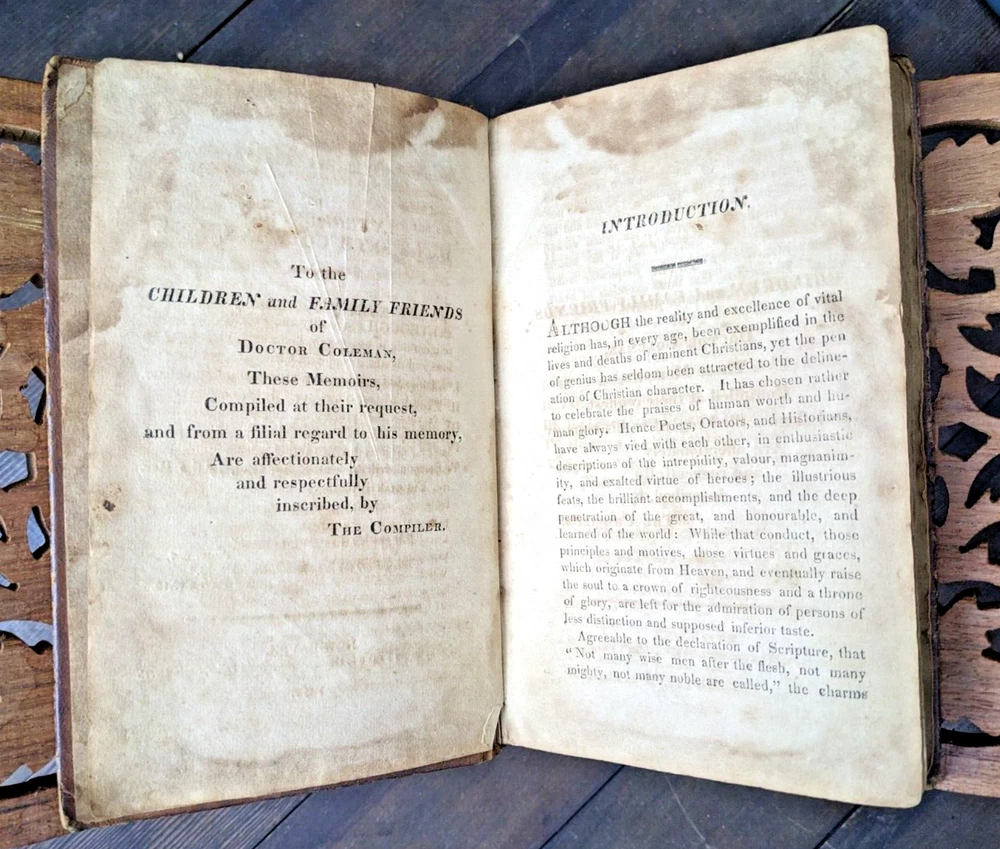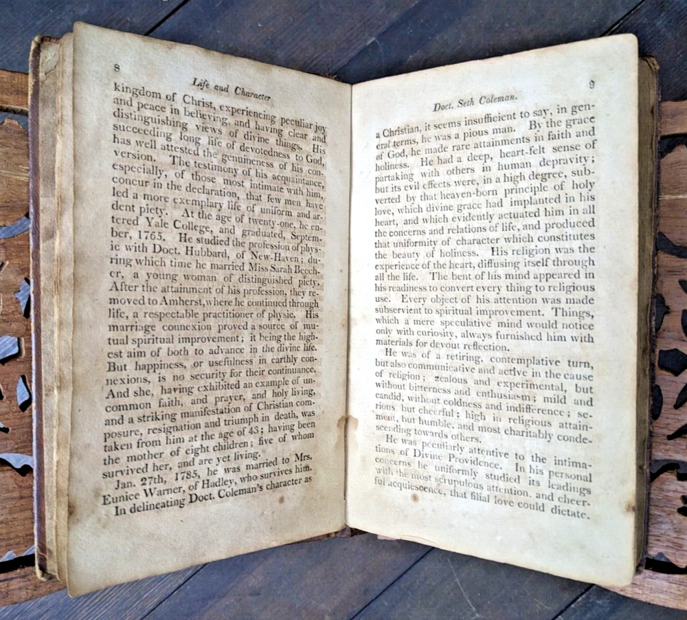 For your consideration is one of my better "local" pieces (being from western Mass): "Memoirs of Doctor Seth Coleman, A.M. of Amherst, (MASS)". Despite the doctor title, this book seems to focus more on his religious life. Very interesting! This is a first edition printed in 1817. 288 pages, 7" x 4.5". Being over 200 years old, it has some condition issues but is still structurally sound. Most notably the last two pages have a large portion torn out. Otherwise the book has the expected tanning/foxing, some spots heavier than others but nowhere does it impede readability. It really just adds character to a book that's actually over 2 centuries old. FULL leather binding is well intact and the covers are very well attached for the book. Hinges are very strong. The binding is very strong with no loose or missing pages. The leather on the cover shows age appropriate wear and patina. A really, really great piece. FREE shipping to the USA and I'm happy to ship internationally at cost. Thanks for looking!