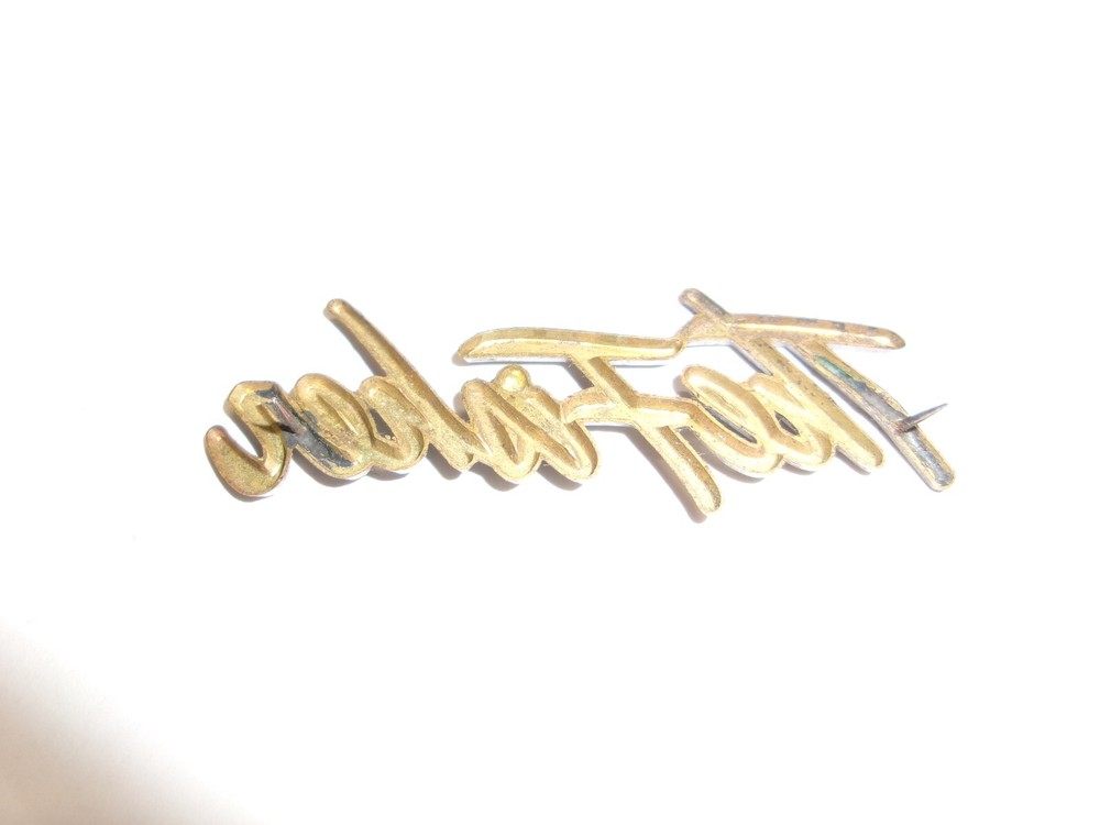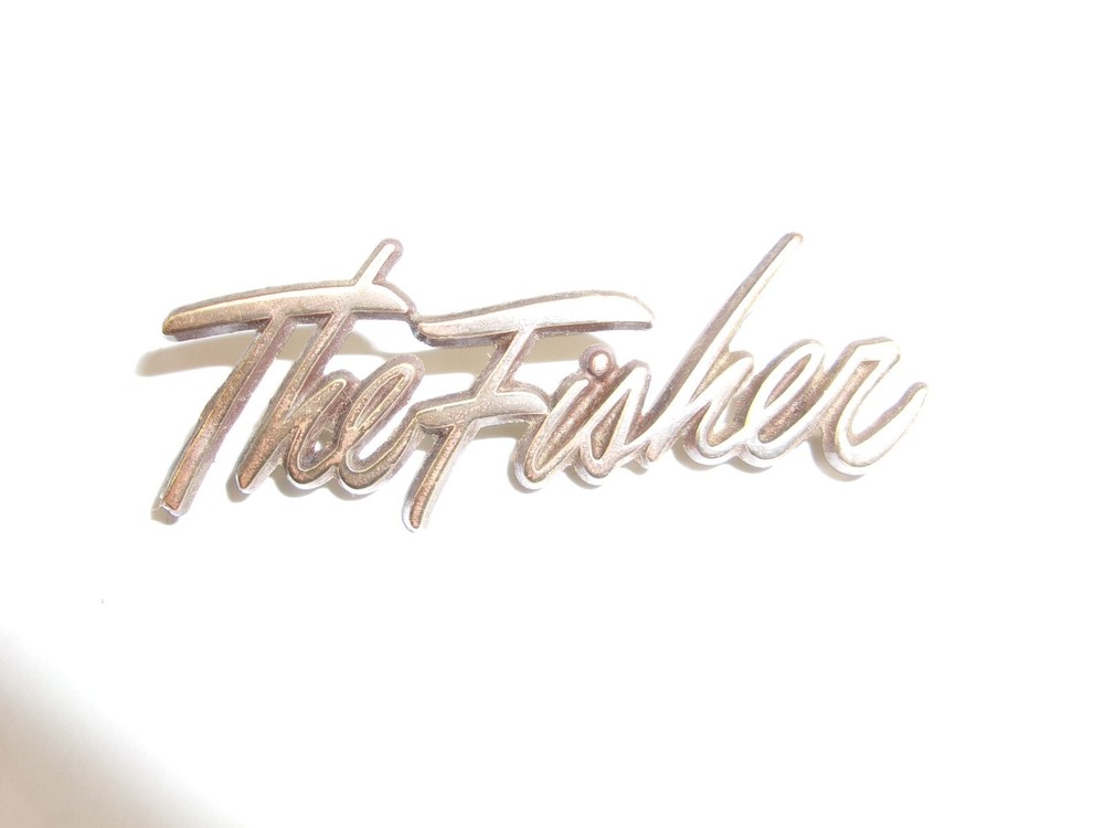 HERE IS A VINTAGE "THE FISHER" METAL EMBLEM. THESE WERE USED ON SOME OF THEIR SPEAKERS FOR SURE. PROBABLEY ON OTHER THINGS TOO. VERY COOL GOLD PLATING. THIS ONE IS VERY NICE CONFITION. NO FLAKING ON PLATING. HAS 2 BRADS ON THE BACK. COOL VINTAGE EMBLEM. 2 1/2" LONG. APPROX 1' TALL. BUYER PAYS SHIPPING.