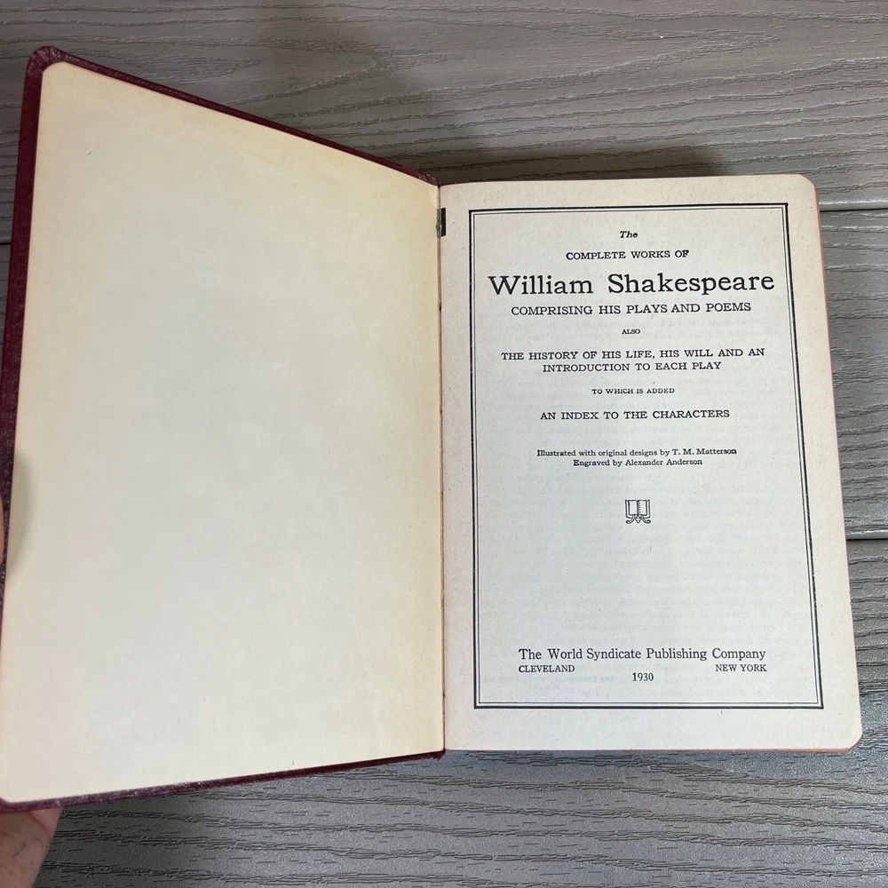 The complete works of William Shakespeare, comprising his plays and poems also the history of his life, his will and an introduction to each play to which is added an index to the characters. Illustrated with original designs by T. M. Matterson. Engraved by Alexander Anderson. The world Syndicate Publishing Company, Cleveland & New York 1930. Made in U.S.A. Book is great shape for its age with some signs of use. Cover has some surface and edge wear from use/storage. Inside is clean and very usable. Spine seems to be holding up well. Please see pics for details. THANKS for browsing my humble shop! Check out my other listings for an eclectic mix of books, dvds, vhs, cds, board games, and other funky finds. 15% Off : On orders of 3+ qualifying items (see my store page.) ENVIRONMENTAL PLEDGE : I do my best to package & ship as sustainably as I can by reusing packaging and using reusable and home compostable mailer bags when possible. Cheers , -EcoThrift NC 32