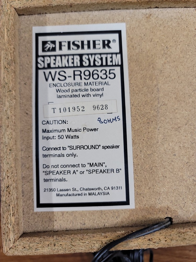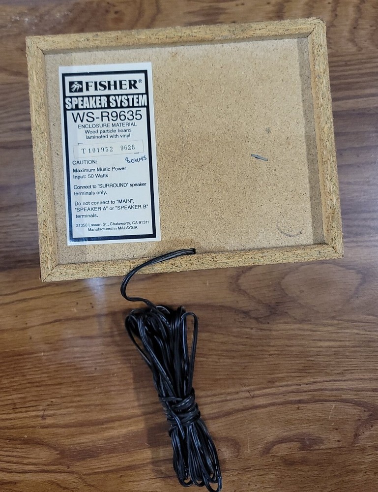 Vintage Fisher Speaker System. WS-R9635. (1) Surround Speaker. Maximum Music Power input : 50 Watts. Oak Wood Grain Cabinet. Good condition. Tested and working. 1 speaker only. With speaker wire....
