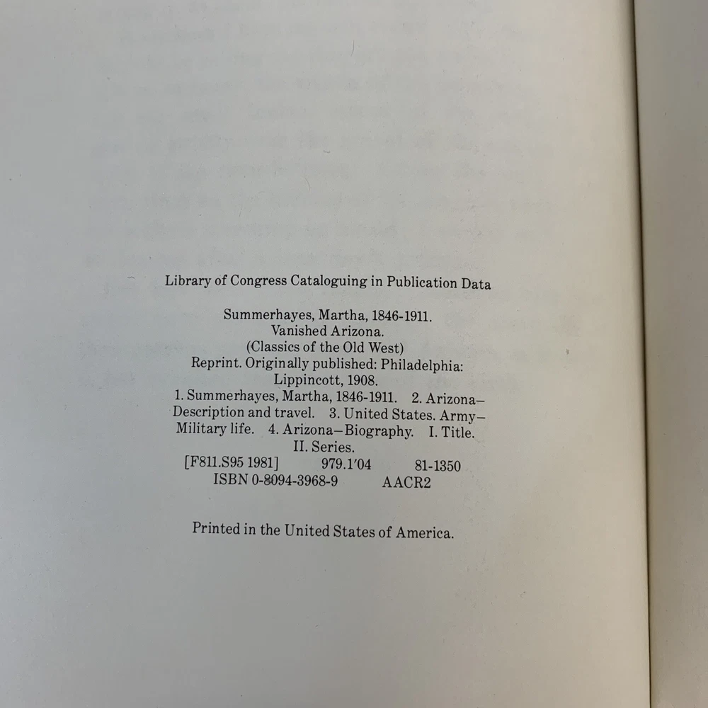 VANISHED ARIZONA: RECOLLECTIONS OF MY ARMY LIFE CLASSICS By Martha Summerhayes. Amazing condition...