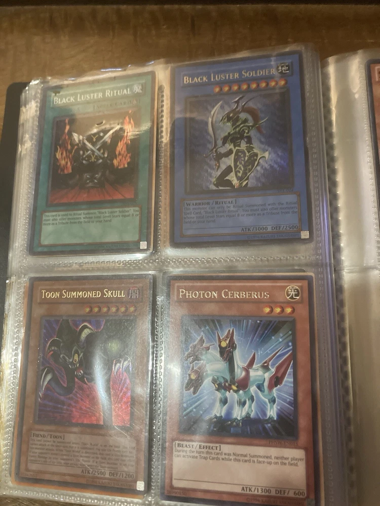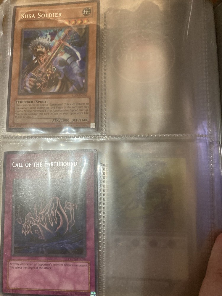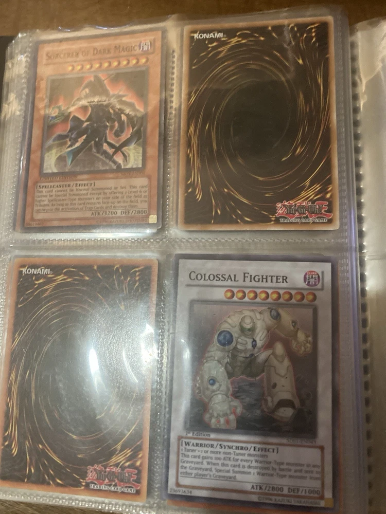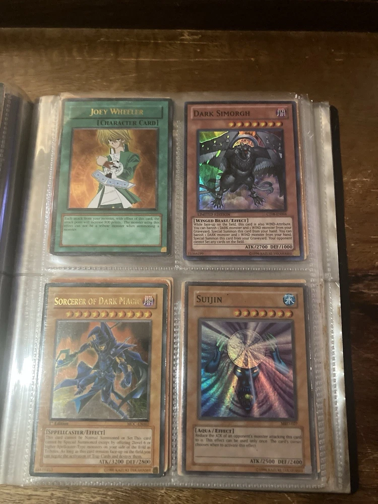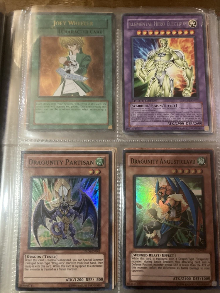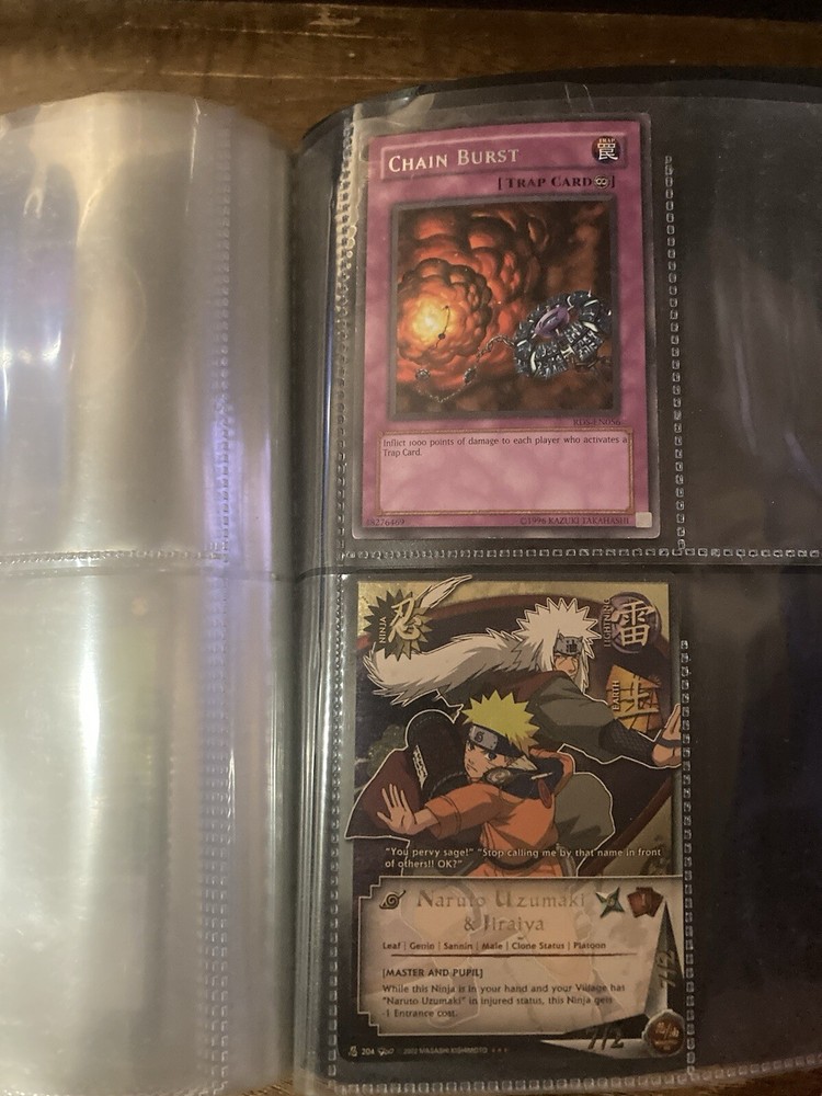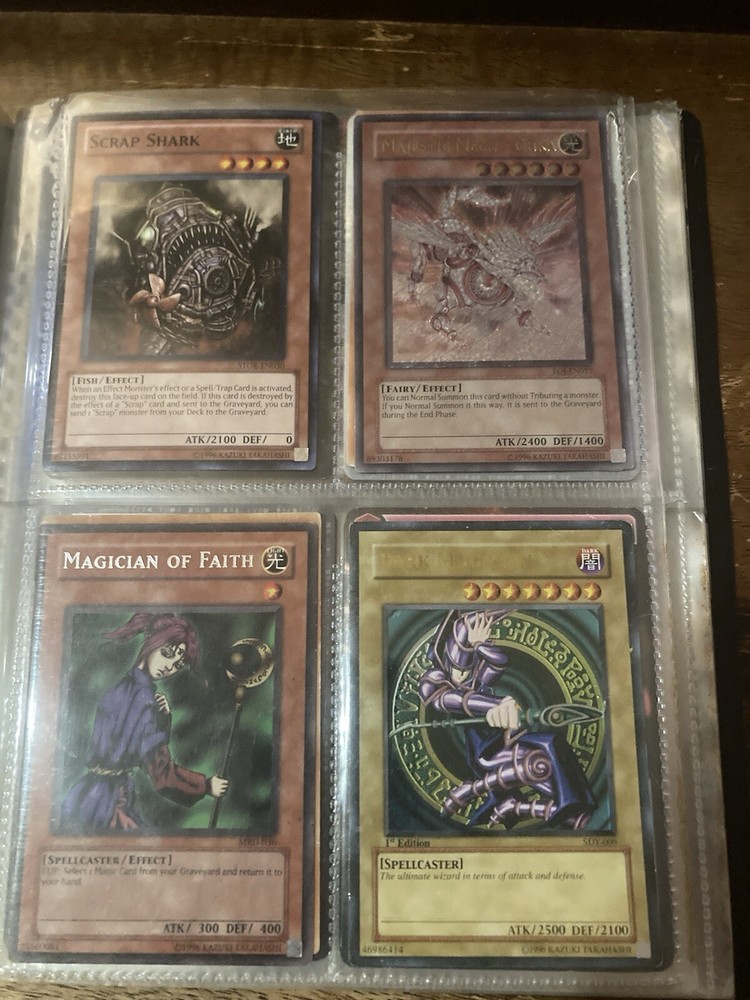 This Yu-Gi-Oh! folder contains 56 cards I have no idea about these cards so getting rid of them. I know some have some potential but my loss is your gain: A small card folder with: Elemental hero aqua neos Cyber twin dragon Elemental hero plasma vice Crab turtle Destiny hero dreadmaster Cyber dark dragon Blowback dragon Peten the dark clown Dragunity partisan Elemental hero electrum Dragunity angusticlavii Genex ally squad Fairy meteor crush Stygian street patrol Sorcerer of dark magic x2 Dark simorgh Suijin Blade knight Dd Traphole Queen of thorns Scapegoat Junk warrior Raviel lord of phantasms Zia Riryoku Obelisk the tormentor Obelisk the tormentor (proxy) Lava golem Majestic mech oh ka x2 Scrap Kong Dark resonator Summoned skull Black luster ritual Toon summoned skull Black luster soldier Photon Cerberus Scrap shark Magician is faith Dark magician Susa soldier Call of the earthbound Chain burst Chaotic cards: Cyclance Power pulse Song of asperity Fortissimo Orb of foresight Song of geonova Viperlash Klasp Naruto collectible card game: Naruto uzumaki & jiraiya