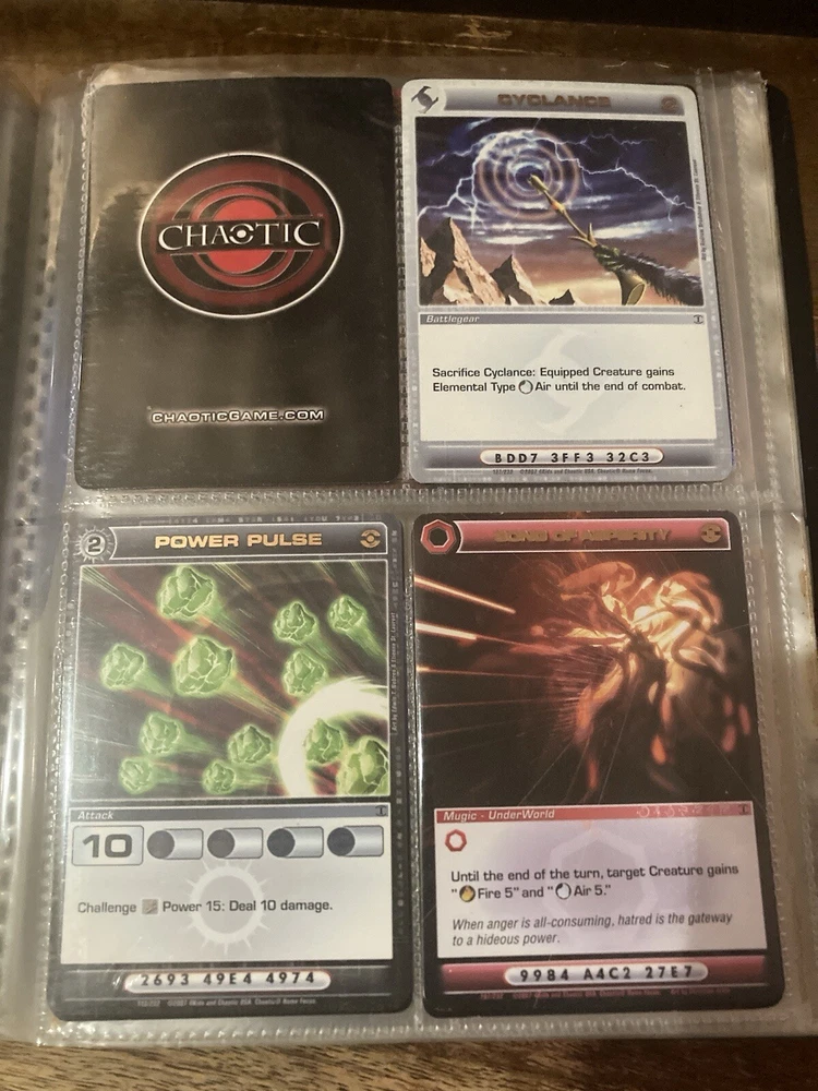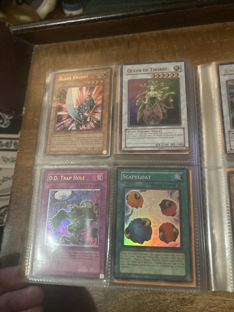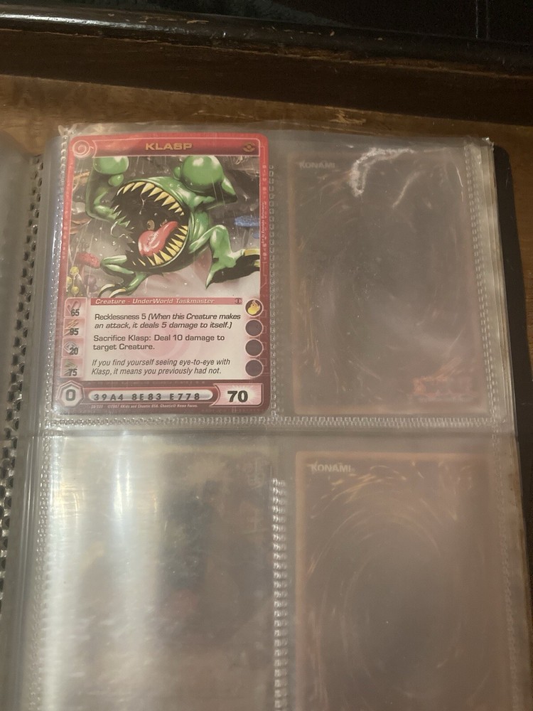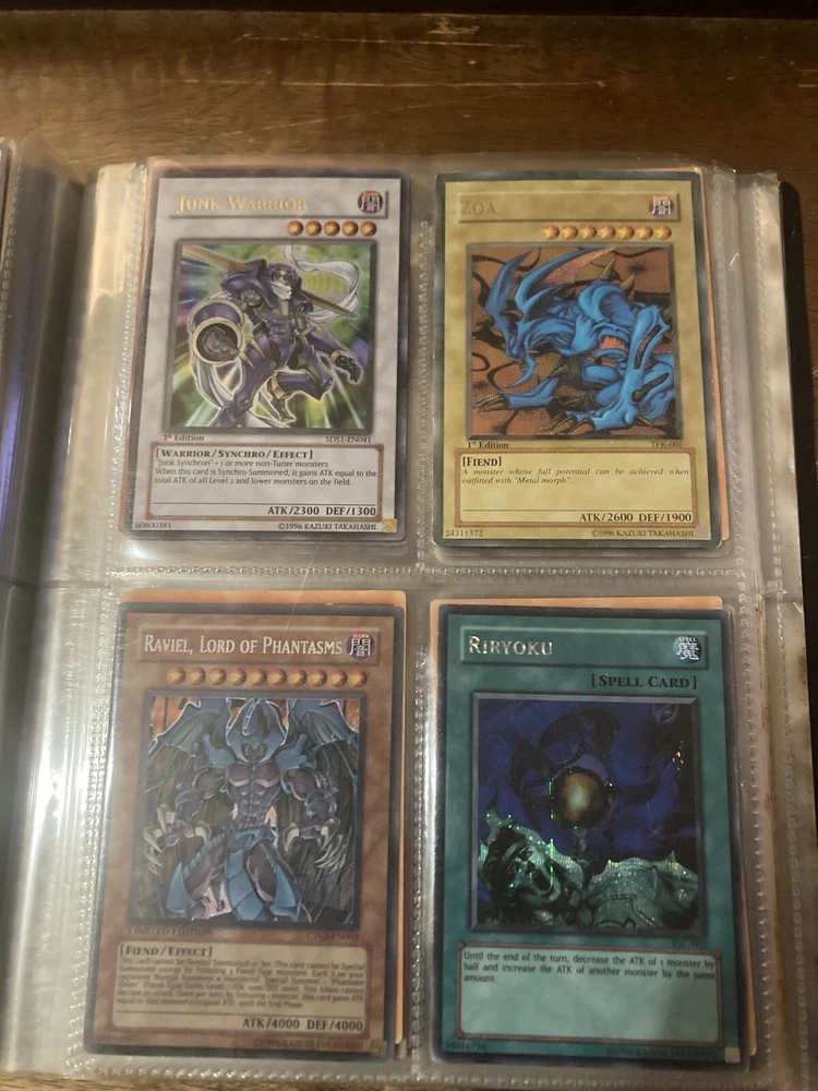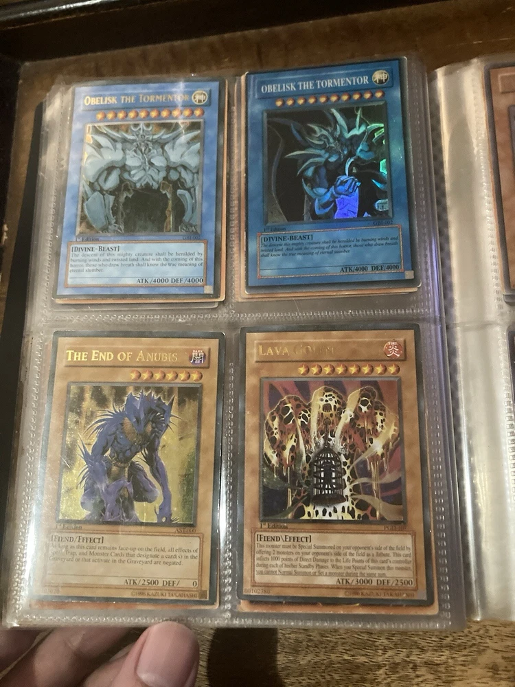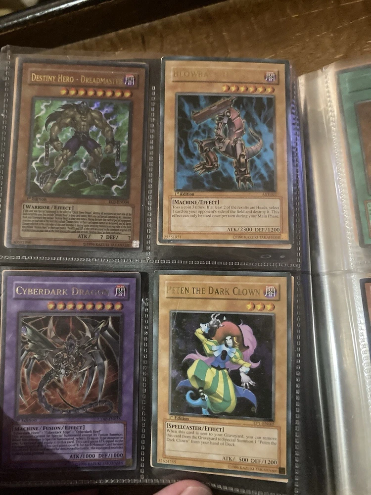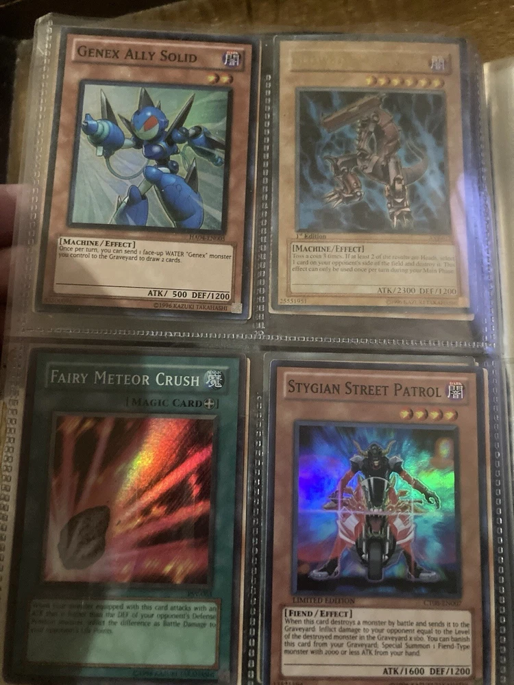 This Yu-Gi-Oh! folder contains 56 cards I have no idea about these cards so getting rid of them. I know some have some potential but my loss is your gain: A small card folder with: Elemental hero aqua neos Cyber twin dragon Elemental hero plasma vice Crab turtle Destiny hero dreadmaster Cyber dark dragon Blowback dragon Peten the dark clown Dragunity partisan Elemental hero electrum Dragunity angusticlavii Genex ally squad Fairy meteor crush Stygian street patrol Sorcerer of dark magic x2 Dark simorgh Suijin Blade knight Dd Traphole Queen of thorns Scapegoat Junk warrior Raviel lord of phantasms Zia Riryoku Obelisk the tormentor Obelisk the tormentor (proxy) Lava golem Majestic mech oh ka x2 Scrap Kong Dark resonator Summoned skull Black luster ritual Toon summoned skull Black luster soldier Photon Cerberus Scrap shark Magician is faith Dark magician Susa soldier Call of the earthbound Chain burst Chaotic cards: Cyclance Power pulse Song of asperity Fortissimo Orb of foresight Song of geonova Viperlash Klasp Naruto collectible card game: Naruto uzumaki & jiraiya