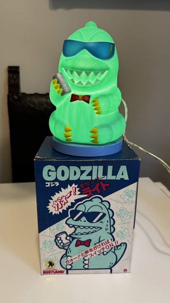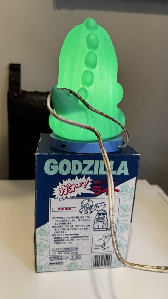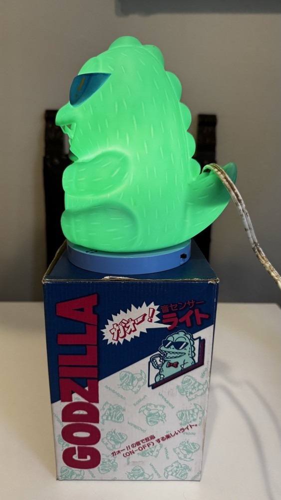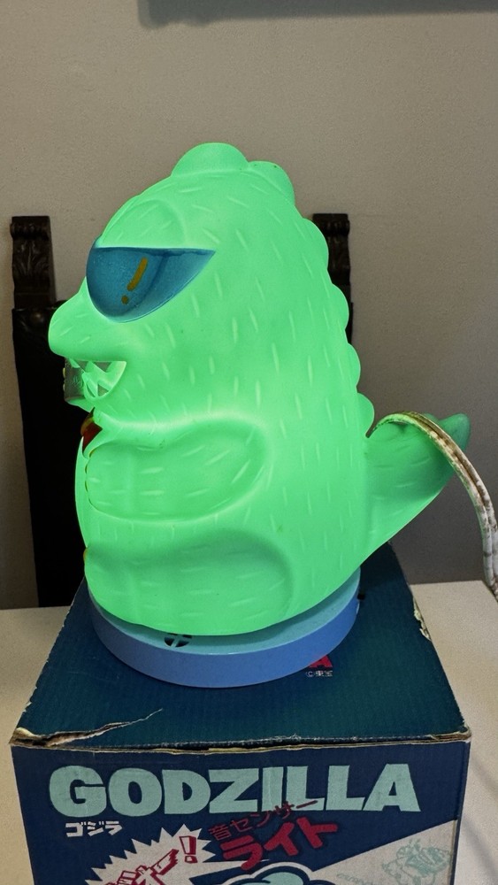 This vintage 1980s Godzilla green lamp light figure is a collectible piece featuring the iconic character from the anime and manga series. Produced by TOHO, this PVC figurine captures the essence of Godzilla from the popular franchise. Packaged in its original box, this piece is a must-have for fans of the Godzilland TV show and enthusiasts of retro animation merchandise. Perfect for adding a touch of nostalgia to any collection, this working lamp light figure is a unique and sought-after item for any Godzilla fan. Free shipping