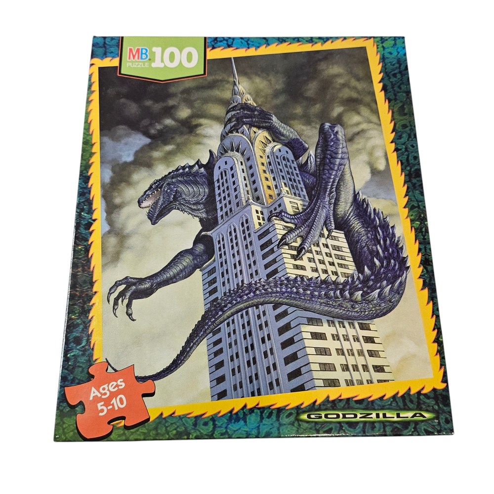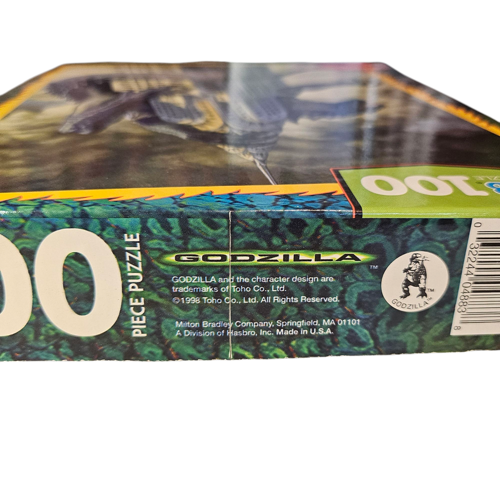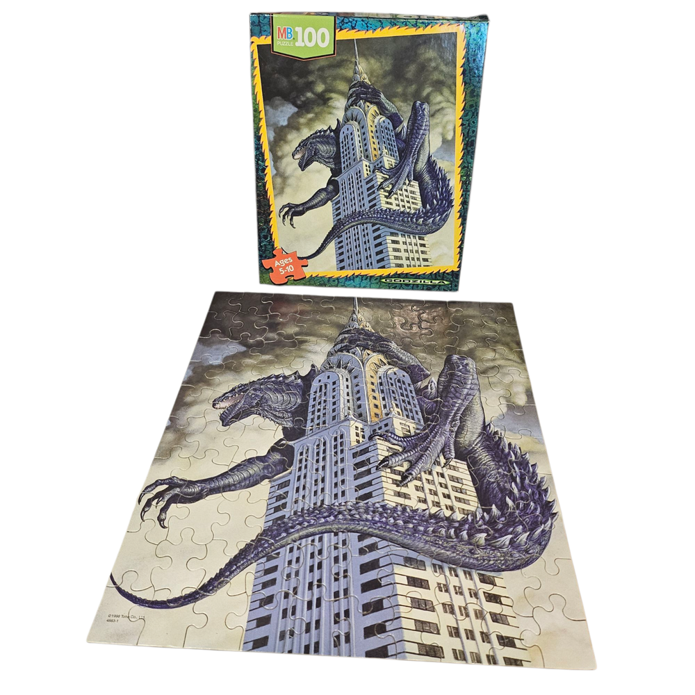 Vintage 1998 Godzilla 100 piece Milton Bradley puzzle Complete puzzle in great condition. The box is in fair condition. The lid has one corner lifting up and the bottom has separated from the sides in places. See photos for condition details. Measurements: 12.5x15in Ages: 5 to 10