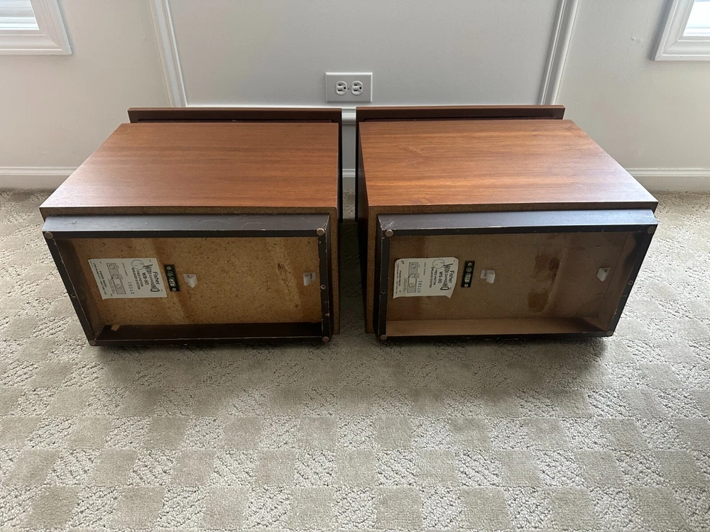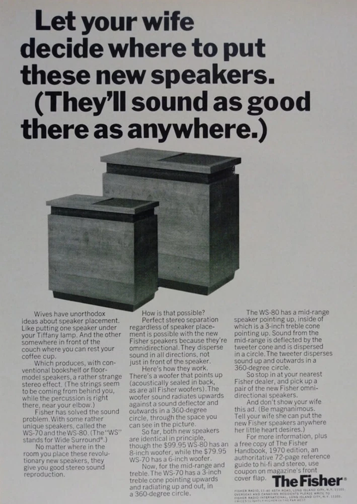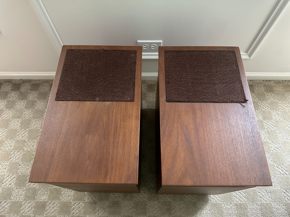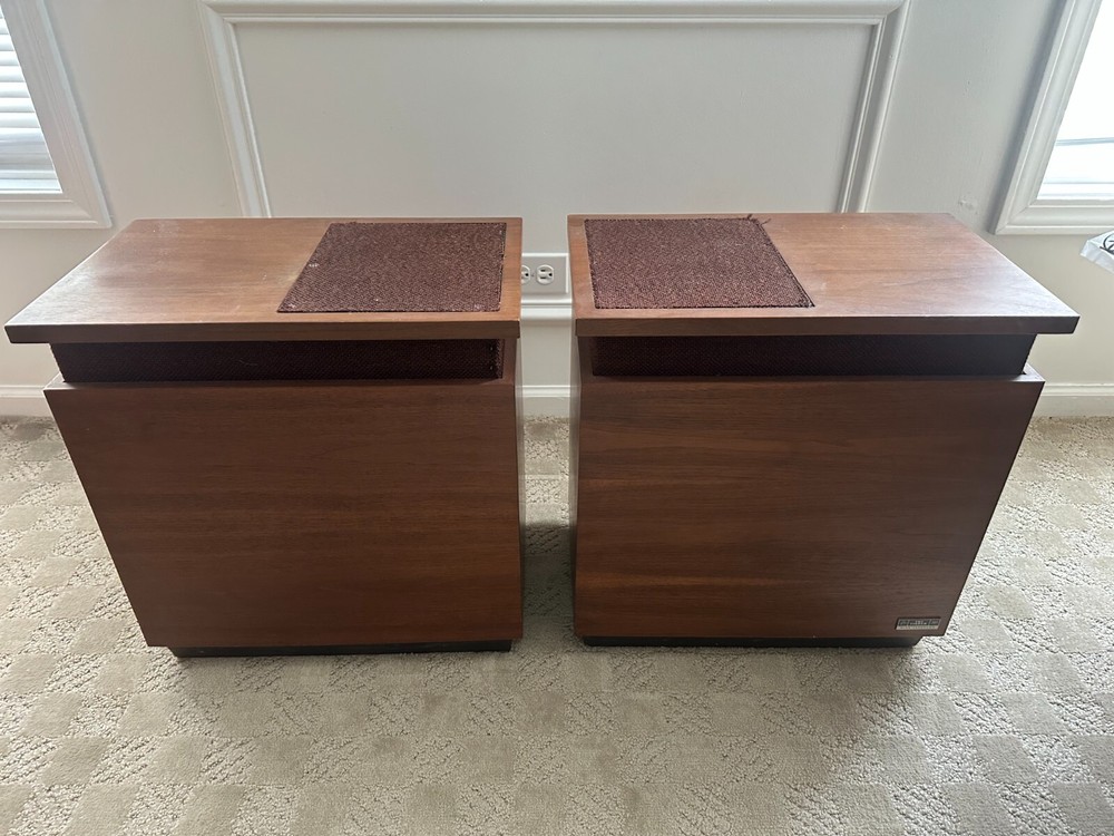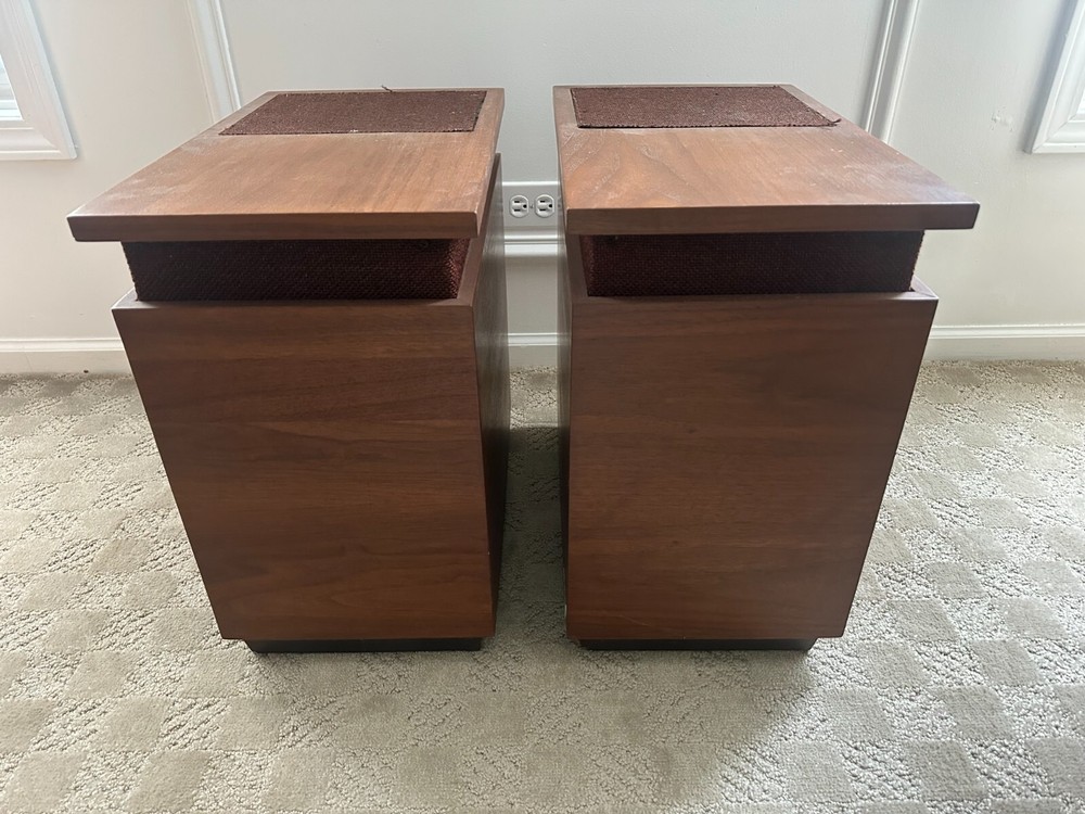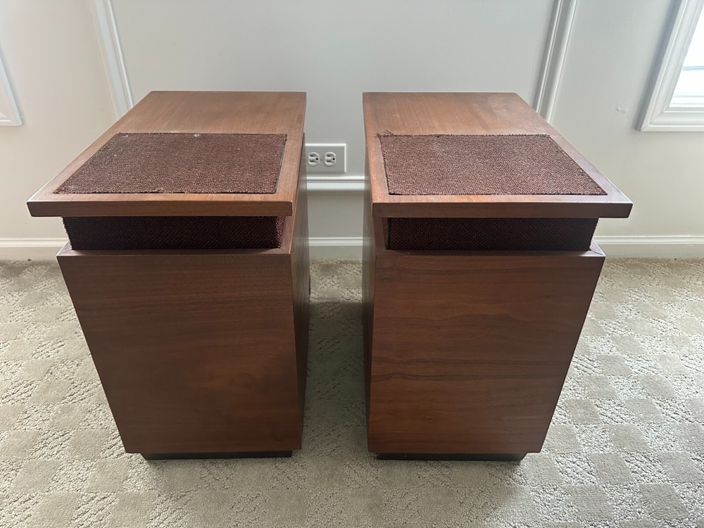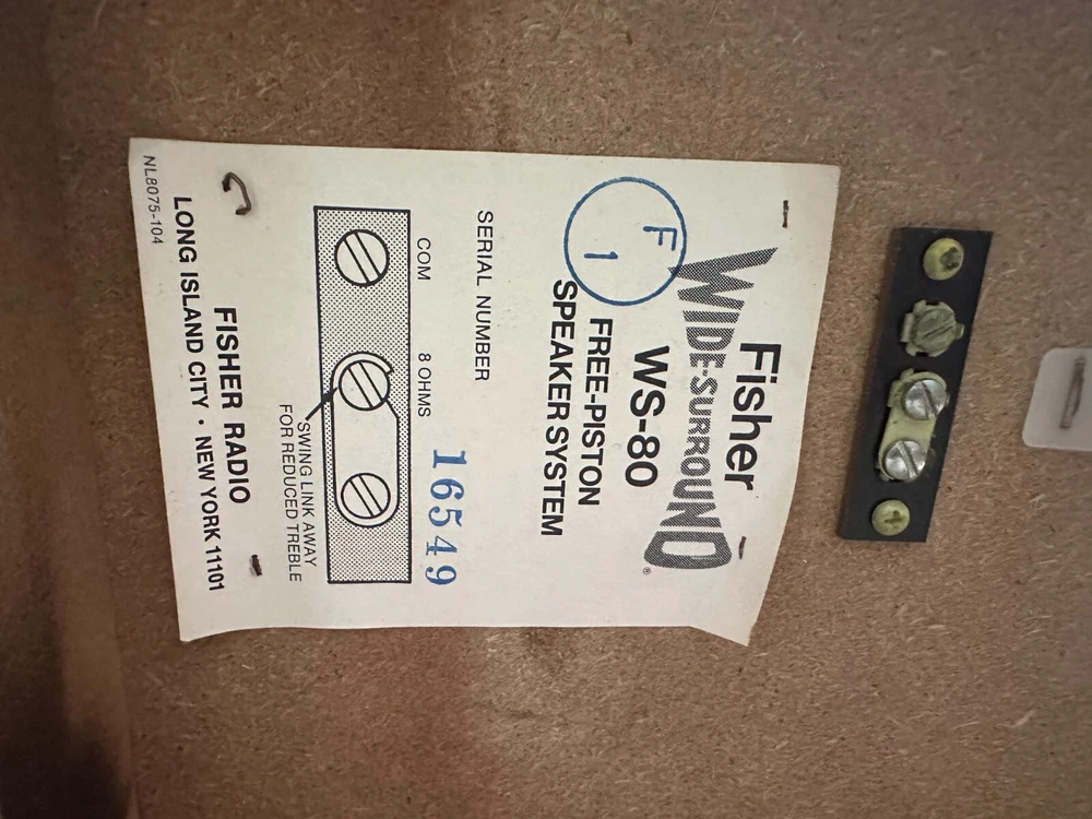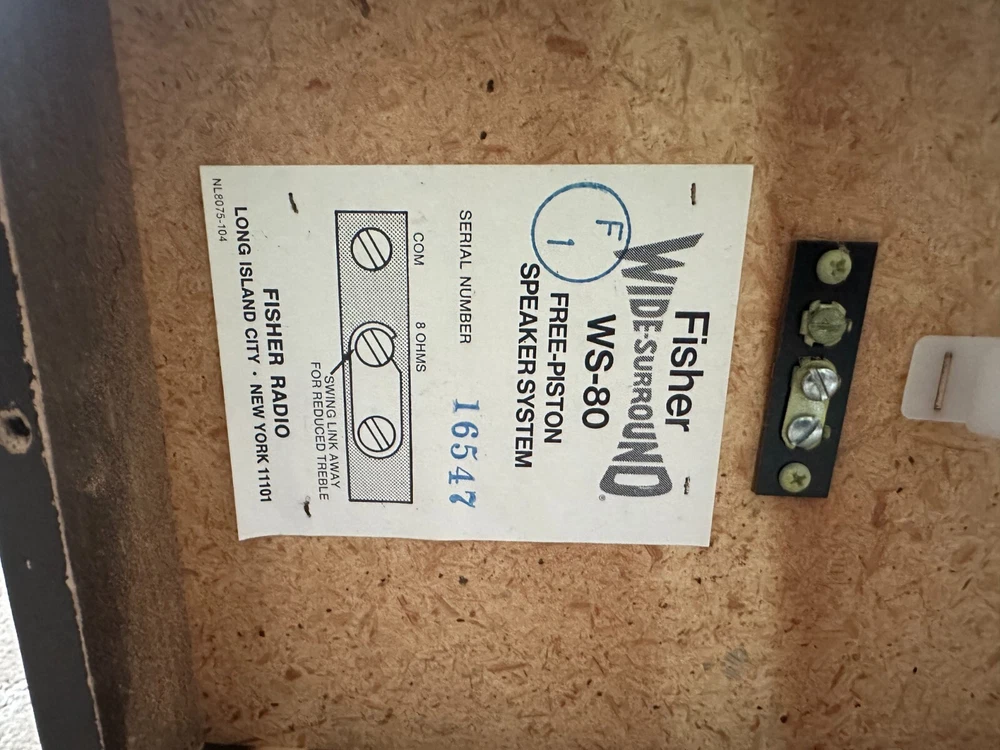 Fisher Omnidirectional Speakers Model WS-80 (the larger/better model). WS stands for Fisher's foray into Wide Surround working to design a speaker that changed traditional bookshelf speaker placement into a room-integrated item. Some used these for side-tables on each side of the couch, placing lamps on top. Condition notes: These are in super cosmetic condition with only very minor blemishes on the REAL WALNUT VENEER cabinets. BOTH speakers have the original Fisher "badges" on them (often these are missing). The speaker/drivers may need some restoration of the drivers or crossovers internally. These WS-80 speakers are ORIGINAL. This is the perfect project for the Fisher vintage audio collector. The speakers themselves are UNTESTED. These speaker designs came from the mind of Avery Fisher BEFORE the sell-out to Sanyo. Please examine the pictures, they are part of the description. Yes, shipping is expensive. But you want these to arrive in good condition, and they will be packed properly. Each speaker weights 25 pounds. Each speaker is 17.5"d x 11"w x 18.5"h. I will pack them in a FedEx 24"x24"x24" Double-Wall box, with solid styrofoam packing to protect them in transit. The total weight will be over 60lbs. Shipping will exceed $100 to the lower 48 states for that size and weight. I'm going to charge $99 for shipping, flat rate. Anything over that amount I will eat out of the sale proceeds after eBay takes their double-digit percentage. (I've a lot of experience in shipping and pricing shipping - but feel free to check me by doing your own pricing with your FedEx local office.) I am happy to arrange for local pickup, if you are in the Chicago-land area - there was a glitch in the website when I listed these - so send an eBay message to me if you want to pick-up and I will start a support call with eBay to find out why the local pickup was not offered when I listed this. From the marketing ad for them (I've included an image of a magazine ad in the images): "Perfect Stereo Separation regardless of speaker placement is possible with the new Fisher speakers because they're omnidirectional. They disperse sound in all directions, not just in front of the speaker. Here's how they work. There's a woofer that points up (acoustically sealed in back, as are all fisher woofers). The woofer sound radiates upwards against a sound deflector and outward in a 360 degree circle through the space you can see in the picture (below the top, and the sides). [...] The WS-90 has a mid-range speaker pointing up, insede of which is a 3 inch treble cone pointing up. sound from the mid-range is deflected by the tweeter cone and is dispersed in a circle. The tweeter disperses sound up and outwards in a 360 degree circle." SHIPPING: I typically ship same or next day. Packing and shipping electronics is expensive and I am not Amazon Prime, so shipping is not free. And you don't want shipping to be free as price is inversely commensurate with likelihood of shipping damage. Shipper is my choice of FedEx or USPS. My flat rate shipping fee covers packing and appropriate packaging materials. This ensures the item you buy will arrive in the condition described and shown in photos of this listing. See my feedback, I am recognized for my packing to ensure safe arrival of vintage electronics. Shipping to USA lower-48-states addresses only. BEFORE YOU BUY, READ CAREFULLY: Selling AS IS. No Warranty is expressed or implied. NO Returns or refunds for any reason. No after-market product support is implied or offered. Buyer accepts all responsibility to research and follow installation and operating instructions which may or may not be included and may also be available online. User error in connection and/or operation of this unit may damage it. The unit is not warranted for user error or for any other reason. By purchasing this item, you understand vintage audio requires service from time to time. This unit is sold AS IS and you accept responsibility for servicing and maintaining it from the purchase date forward. Why? Because I cannot assess buyer's skill level in understanding vintage audio, connections, etc. Also, there is too much fraud on eBay where buyers buy something, damage it due to user error, or worse, harvest the unit for parts, then try to return it for a refund.