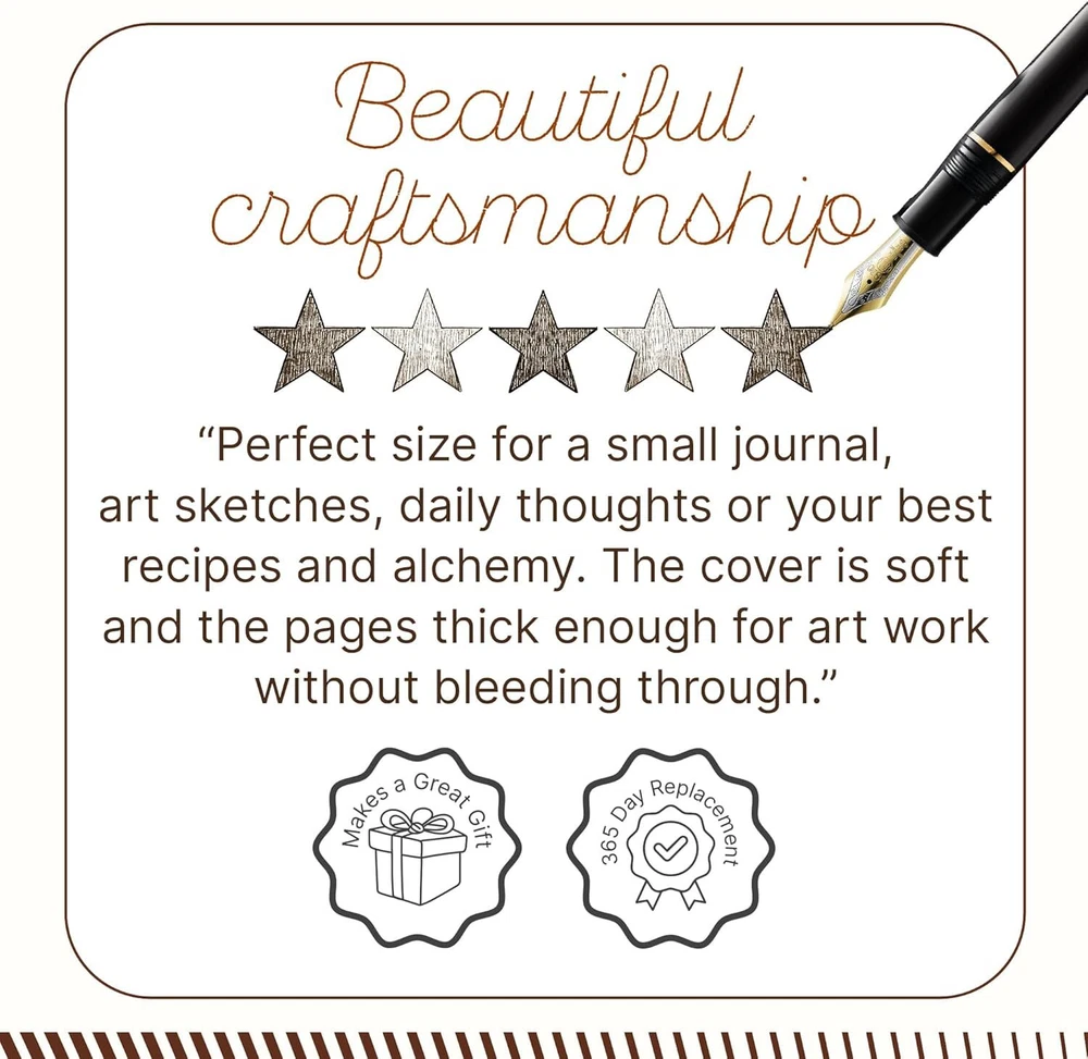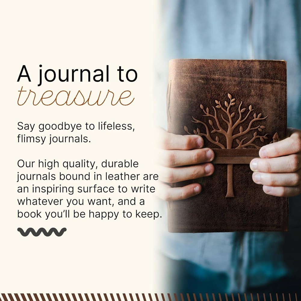 About this item UNIQUE HANDMADE VINTAGE PAPER - This Vintage Journal is made with 240 pages of Antique Paper that looks like it was pulled from history. You will fall in love with the antique handmade cotton paper which is very unique to this vintage journal. ANY KIND OF PEN - Sketch, doodle, write on your leather bound journal with a calligraphy pen, fountain pen, brush pen, ball pen, acrylic colors, watercolor, and many more. EXQUISITE & UNIQUE EMBOSSED TREE DESIGN - The leather bound journal is made from thick dark brown water buffalo leather which is soft and supple to the touch. Extra care is taken to ensure the emboss is perfect on every piece. The leather is tanned with a special oil that allows you to create your own distressed style if you fold the leather. These journals are made by gifted artisans using the best genuine leather available. STURDY BINDING AND LEATHER WRAPAROUND - Sturdy hand-stitched binding ensures that no paper comes loose from your vintage notebook. The leather wraparound keeps the papers safe and secure. Product dimensions: 9.72 x 7.76 x 1.97 inches