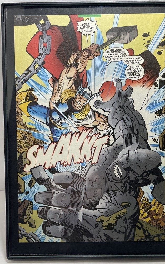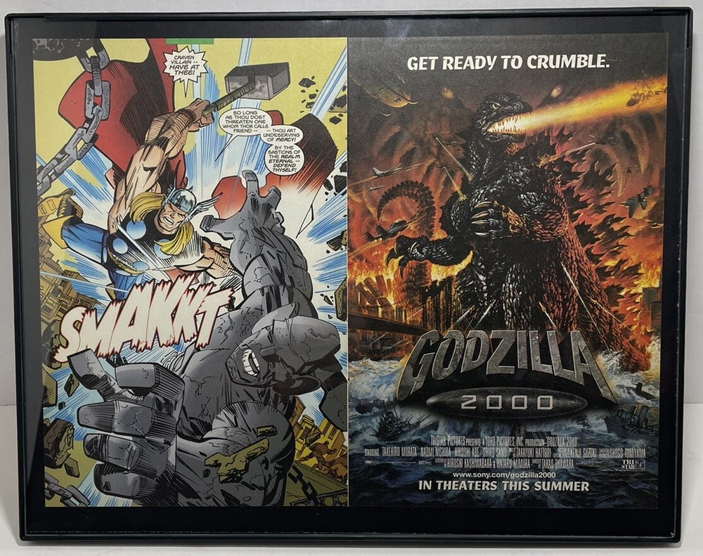 This hang-able Vintage Nintendo Ad is the perfect gift for Gamers, Streamers, Comic Enthusiast, and Collectors alike. Looks amazing in game rooms, streamer nooks, pod cast booths and personal office set-ups. Gives off nostalgic decor vibes for bedrooms and get away homes. Looks great almost anywhere! Left side: features full colored page of Thor in action dropping the Hammer on an enemy. Right side: features full color page ad for the movie Godzilla 2000.