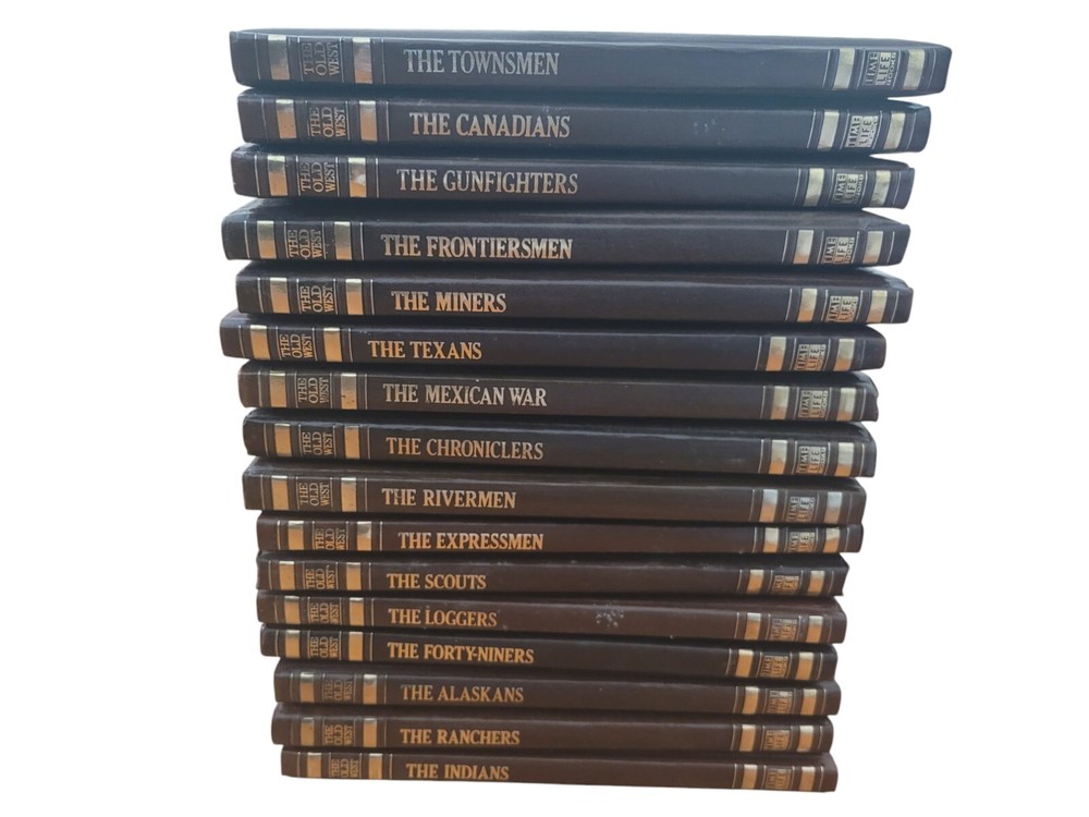 The product is a vintage set of 16 volumes from the Time Life Books series "The Old West," published in 1978. The books are nonfiction narratives on American history, specifically focusing on the Western genre. They are illustrated and bound in faux leather, making them a visually appealing and informative collection for young adults and adults interested in Western history and culture. The titles include: The Townsmen, The Canadians, The Gunfighters, The Frontiersmen, The Miners, The Texans, The Mexican War, The Chroniclers, The Rivermen, The Expressmen, The Scouts, The Loggers, The Fourty-niners, The Alaskans, The Ranchers, and The Indians.