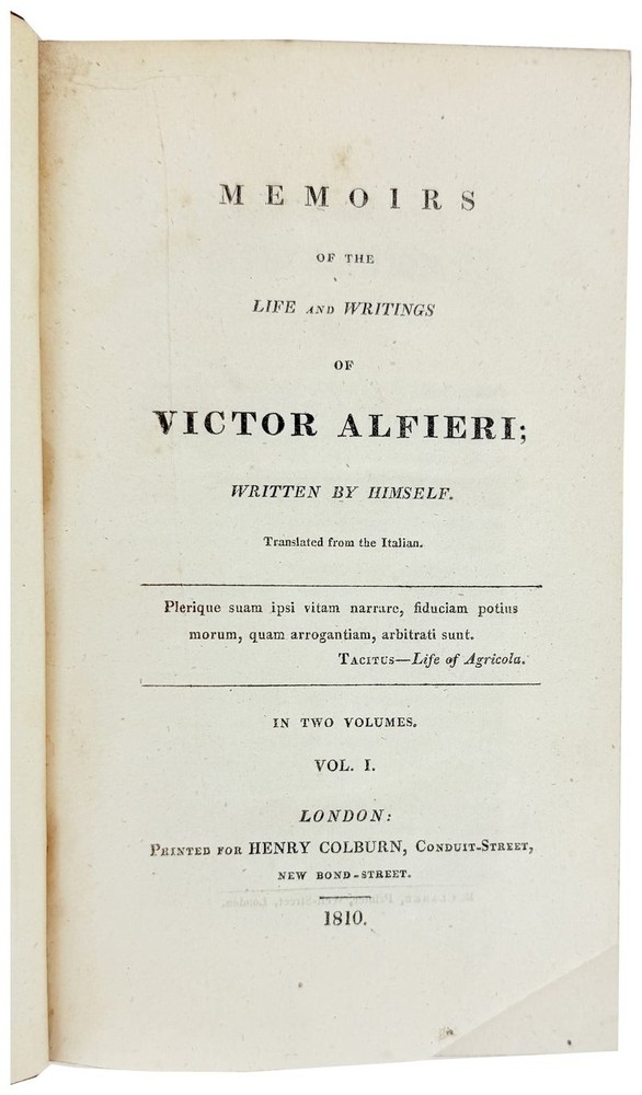 Memoirs of the Life and Writings of Victor Alfieri [Two Volumes] Author: Vittorio Alfieri Title: Memoirs of the Life and Writings of Victor Alfieri [Two Volumes] Publication: London: Henry Colburn, 1810 Description: Very Good. London: Printed for Henry Colburn, Conduit-Street, New Bond-Street, 1810. First English Edition. Two volumes; octavos; contemporary calf over marbled boards, gilt-lettered spines, all edges speckled blue; x,286,[2]; [2],328pp. Leather a bit dried and starting to flake, bottom fore-edge corner of first fourteen leaves of Vol. I clipped but not approaching text, both volumes bound without half title pages, though Vol. I retains publisher's advertisements in rear; a Very Good, sound set overall. First appearance in English of the late Italian dramatist and poet's memoirs in which Alfieri gives glimpses of the development of his brilliant but difficult character: a large inheritance, ill health, being forced to wear a nightcap to mass as a form of punishment, etc. An uncommonly forthright self-examination by one of the most influential Italian dramatists of the 18th century. Seller ID: 32777 Subject: 18th Century, 19th Century, Biography / Memoir, Drama / Performing Arts, Italy / Italian Writers, Poetry Capitol Hill Books is a used bookstore located on historic Capitol Hill in Washington DC, with three floors of quality used books, first editions, and rare books. [Note: Our online inventory is stored and managed at a separate location from at our brick and mortar shop. If you have a question about an item listed online, please send a direct message here rather than calling the store so that we can make sure someone familiar with the item in question can respond.] Terms Books described only as First Editions are First Printings unless otherwise specified. All items are guaranteed to be as described or they may be returned within 30 days of receipt for a full refund. All orders ship within two business days. Standard mail is USPS Media Mail. Expedited and international shipping are also available (please contact for estimates). We offer combined shipping on multiple orders. This listing was created by Bibliopolis.