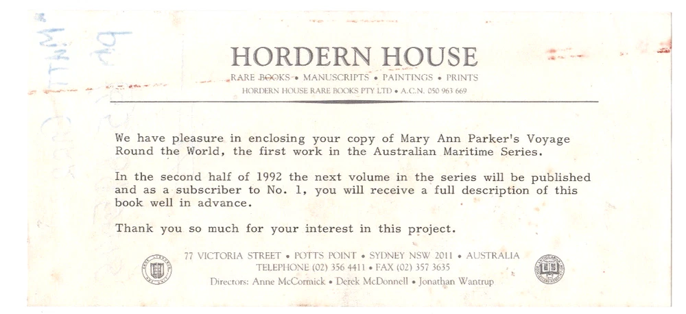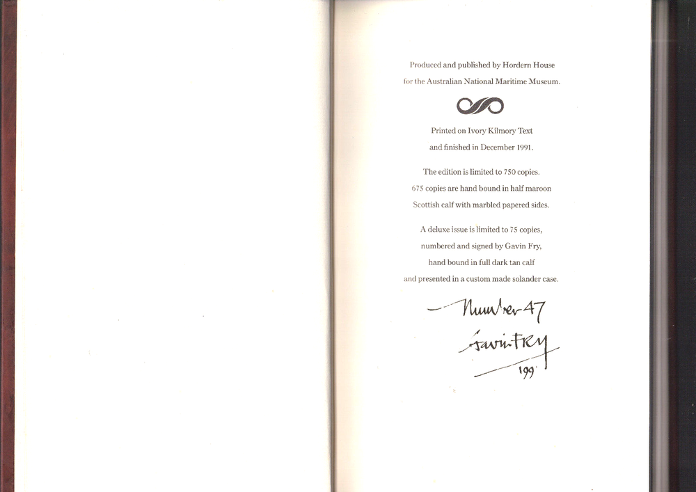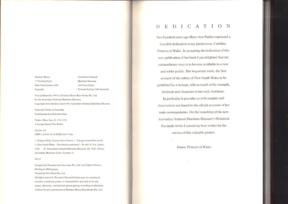 Bookrespect We classify our books...FINE/VERY GOOD/GOOD/FAIR/READING COPY ONLY (+ or -) RARE Edition "A Voyage Round the World" by Mary Ann Parker Facsimile Edition Publisher: First Published by Hordern House Rare Books P/L for the Australian National Maritime Museum, 1991 1st published in 1795, reissued with a commentary by Gavin Fry of The Australian Maritime Museum in 1991. This edition is limited to 750 copies of which this delux issue is limited to 75 copies, numbered and signed by Gavin Fry, who wrote the commentary. Hand bound in full dark tan calf and presented in a custom-made solander case witha removal red ribbon in situ. Dedicated, with permission to Her Royal Highness, Diana The Princess of Wales on the launching of the Australian Maritime Museum's Historical Facsimile Series, as the original edition had been dedicated to Caroline, Princess of Wales in 1795. Illustrated: with a b/w frontispiece, an aquatint by Robert Dodd and facsimile reproduction of the text. Condition: Crisp calf leather-bound hardcover with impressed gilt title to spine and a compass blindstamped to the front cover, STRAIGHT, TIGHT & CLEAN in LIKE NEW CONDITION with limited edition inscription, in a custom made solander case in VERY GOOD CONDITION with very minor sunfade, removal ribbon in situ. Printed on Ivory Kilmory Text. POSTAGE: Postage is free within Australia and includes Australia Post tracking and insurance. Orders are posted within 1 business day. Mary Ann Parker completed the fifteen month return voyage to New South Wales with her husband, Captain John Parker, of the frigate HMS Gorgon , in 1791-2. She had previously travelled with her parents, in Europe, in 1775-82. Living in Spain and Italy, and travelling home through France. Three years after the landing of the First Fleet at Sydney Cove, Mary Ann Parker became Australia's first tourist. Her description of Port Jackson is the first published description by a woman of an Australian colony. Mary Ann Parker made the voyage for her own interest and her husband's company. Her account provides important insight into the life and interests of a woman undertaking what was then the longest and most dangerous voyage on earth. Very Scarce, one of 75 issued.