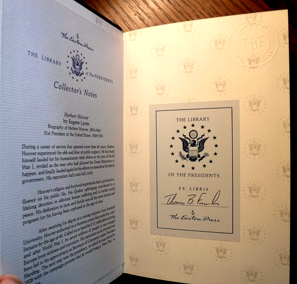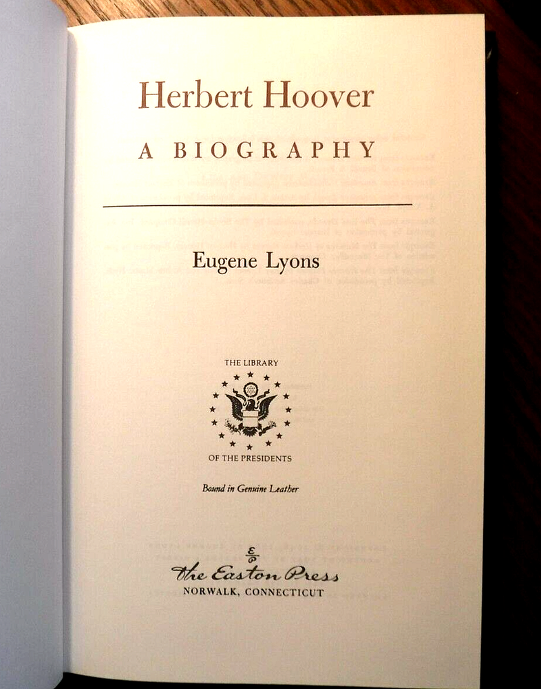 This is a vintage leather-bound collector's edition of Eugene Lyons' HERBERT HOOVER, published by Easton Press. The book is a biography and autobiography about the 31st President of the United States, covering his life and career in politics and government. It is written in English and is an original copy, not a facsimile. The book is in excellent condition and would make a great addition to any collection of antiquarian or collectible books.
