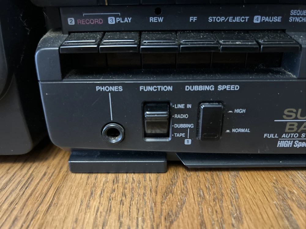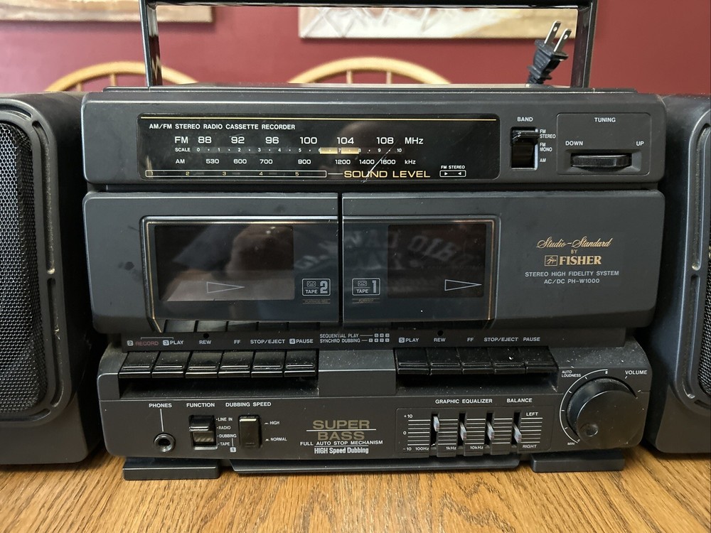 Take your music on-the-go with this vintage Fisher PH-W1000 AM/FM portable boombox stereo. This classic black unit is perfect for any music lover and features detachable speakers for a versatile listening experience. The boombox is designed for cassette tape playback and has a built-in AM/FM tuner for those who prefer to listen to radio. The Fisher PH-W1000 is a high-quality unit that is perfect for both home and outdoor use. It is a great addition to any music collection and is sure to impress with its impressive sound quality. This unit is a must-have for anyone who loves music and wants to enjoy it in style. Includes 33 cassette tapes One side of cassette plays both speakers and the other only one. Sounds great