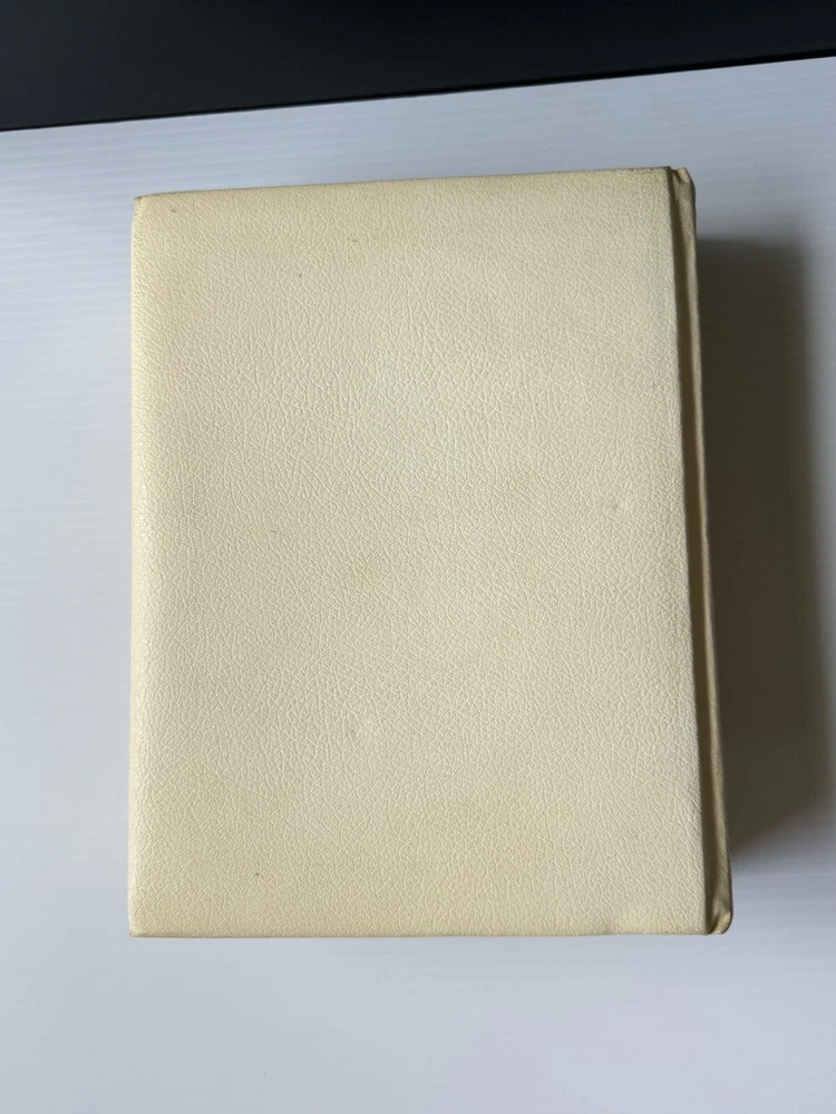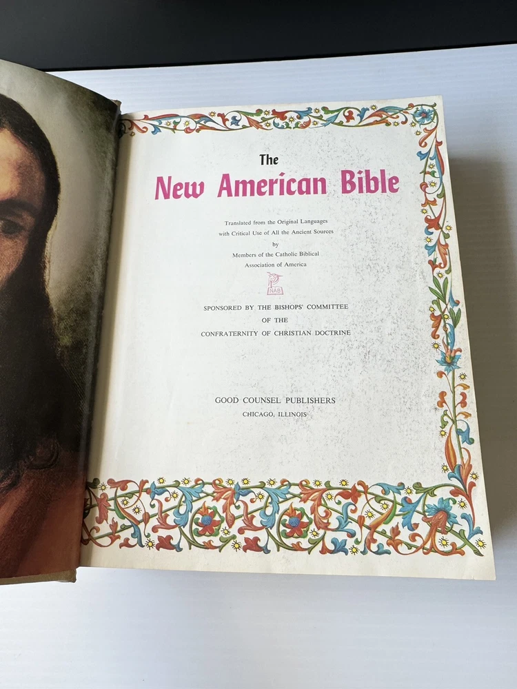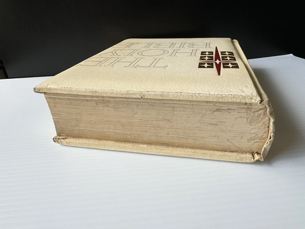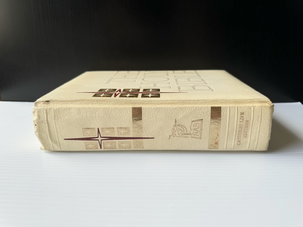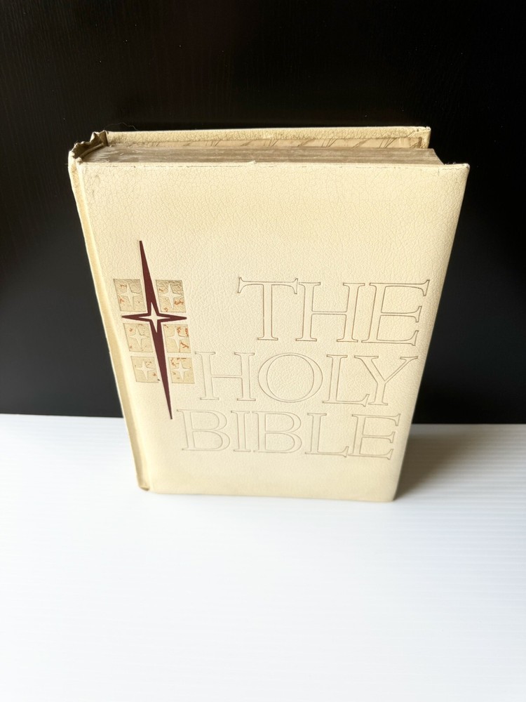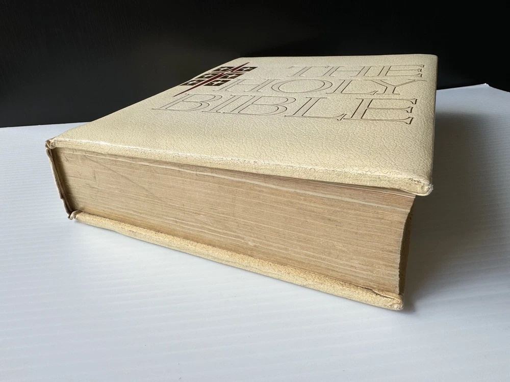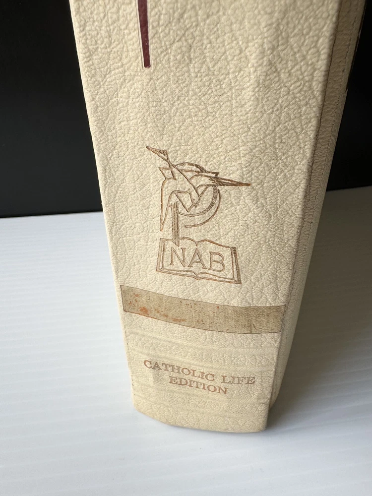 This item is a vintage 1965 Holy Bible Catholic Life Edition. It is The New American Bible. It is in used vintage condition. The cover is a cream leather with padding. The ownership page has not been used. This Bible has 300 pages and measures 11” x 8.5” x 2.5”. The pages are in good condition. This Bible is heavy and weighs 6 lbs. The majority of the age wear is on the covers and the outside of the pages. Please see all photos before purchasing as they are part of the item description.