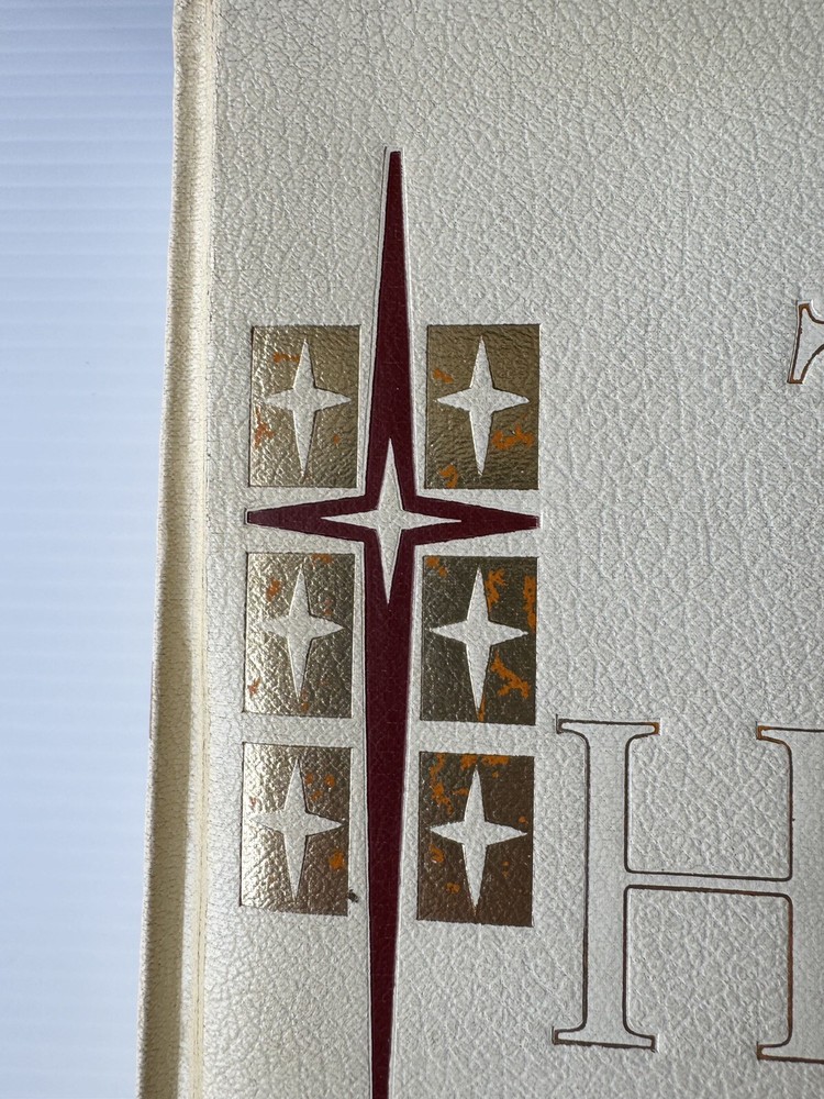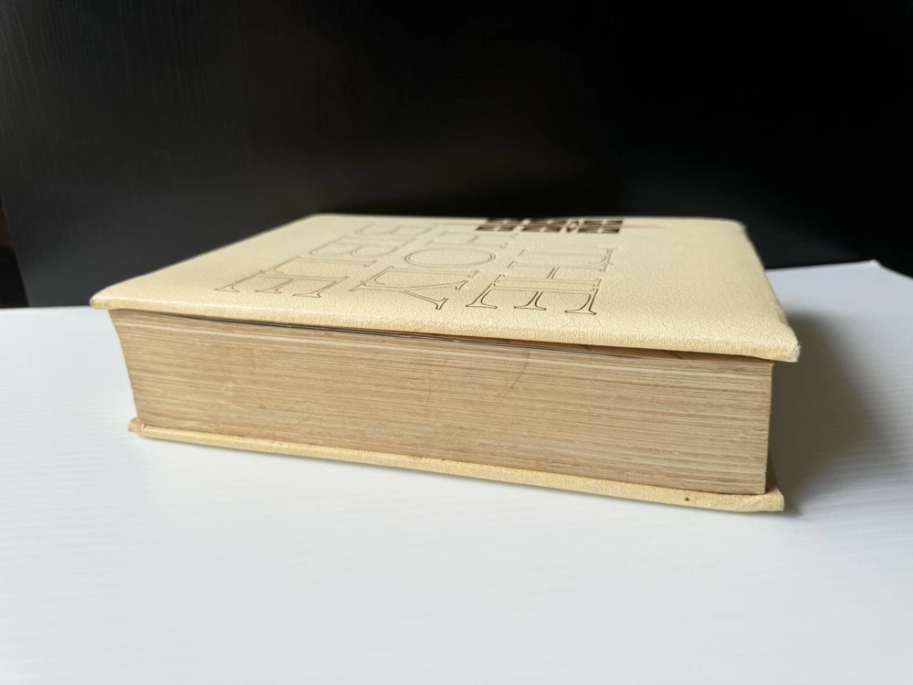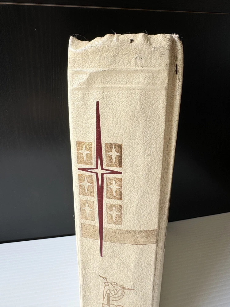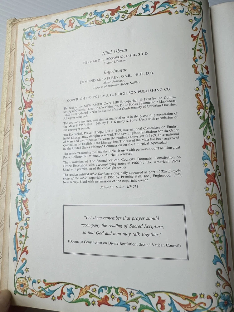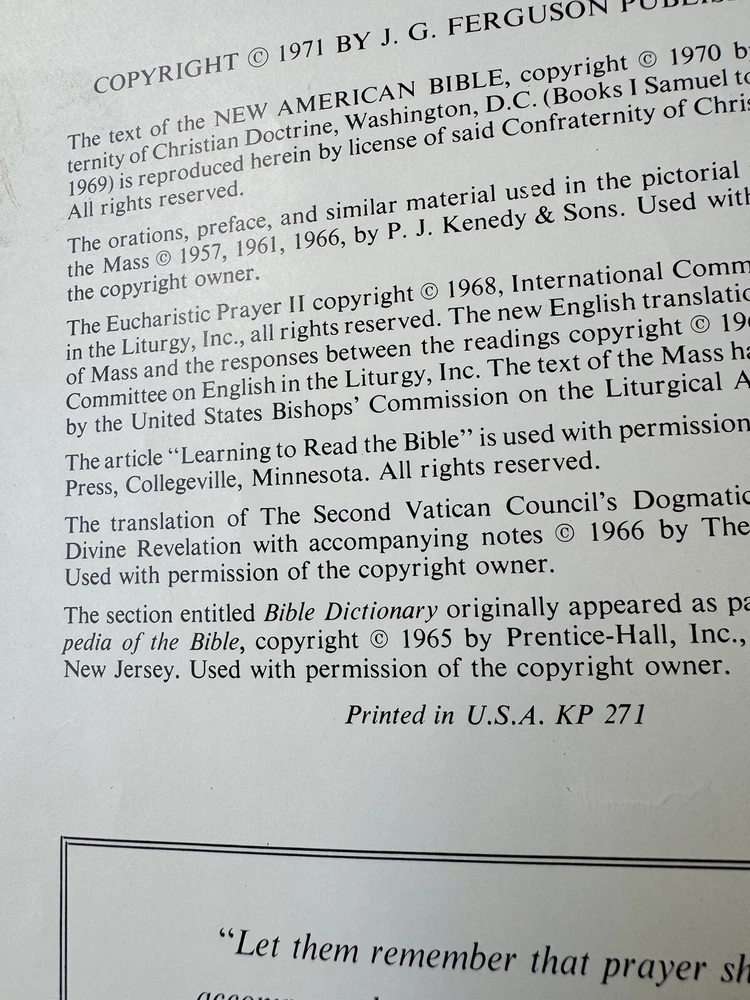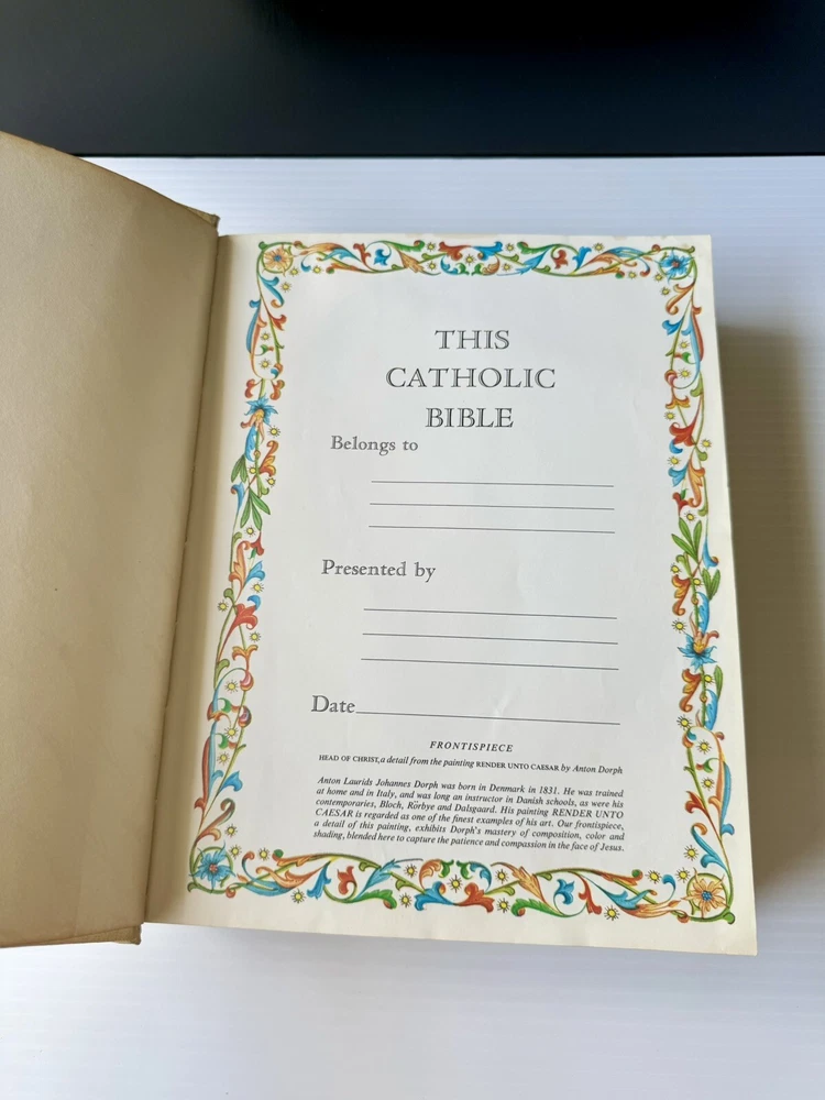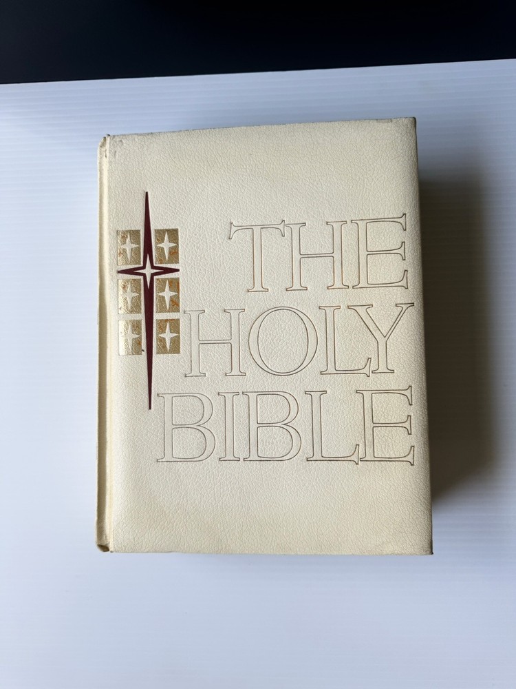 This item is a vintage 1965 Holy Bible Catholic Life Edition. It is The New American Bible. It is in used vintage condition. The cover is a cream leather with padding. The ownership page has not been used. This Bible has 300 pages and measures 11” x 8.5” x 2.5”. The pages are in good condition. This Bible is heavy and weighs 6 lbs. The majority of the age wear is on the covers and the outside of the pages. Please see all photos before purchasing as they are part of the item description.