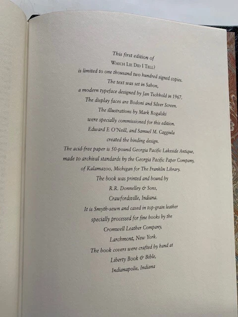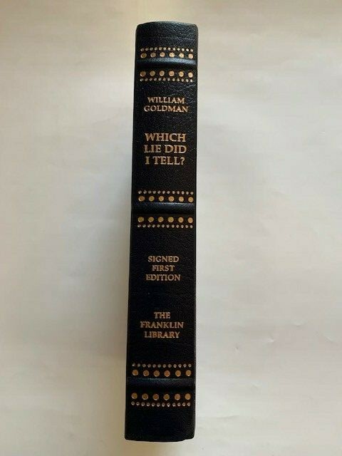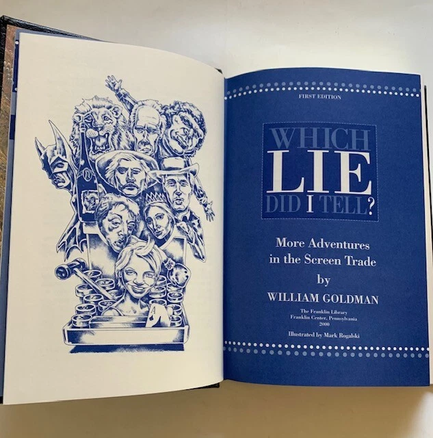 William Goldman. (Text) Mark Rogalski. (Illustrations) " WHICH LIE DID I TELL? MORE ADVENTURES IN THE SCREEN TRADE ." Franklin Library. Franklin Center (2000) SIGNED limited edition. Fine in black leather binding with gold decorations & titles, without dust jacket as issued. (489pp.) (6 1/2" X 9 1/2")