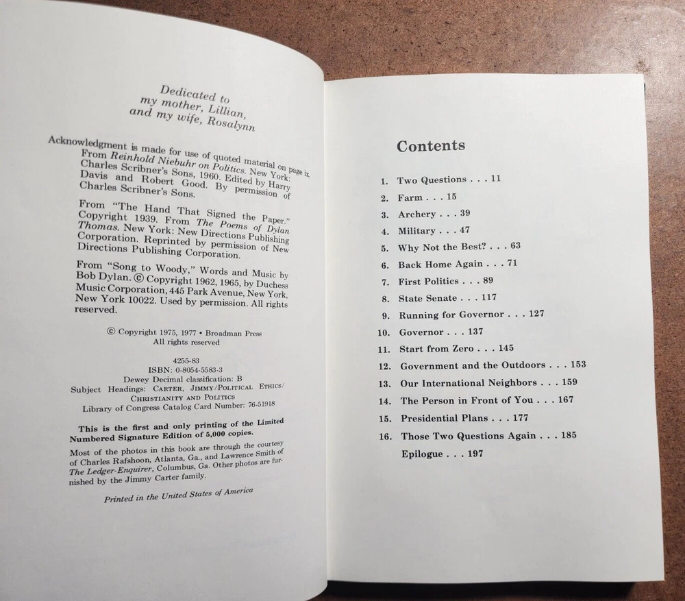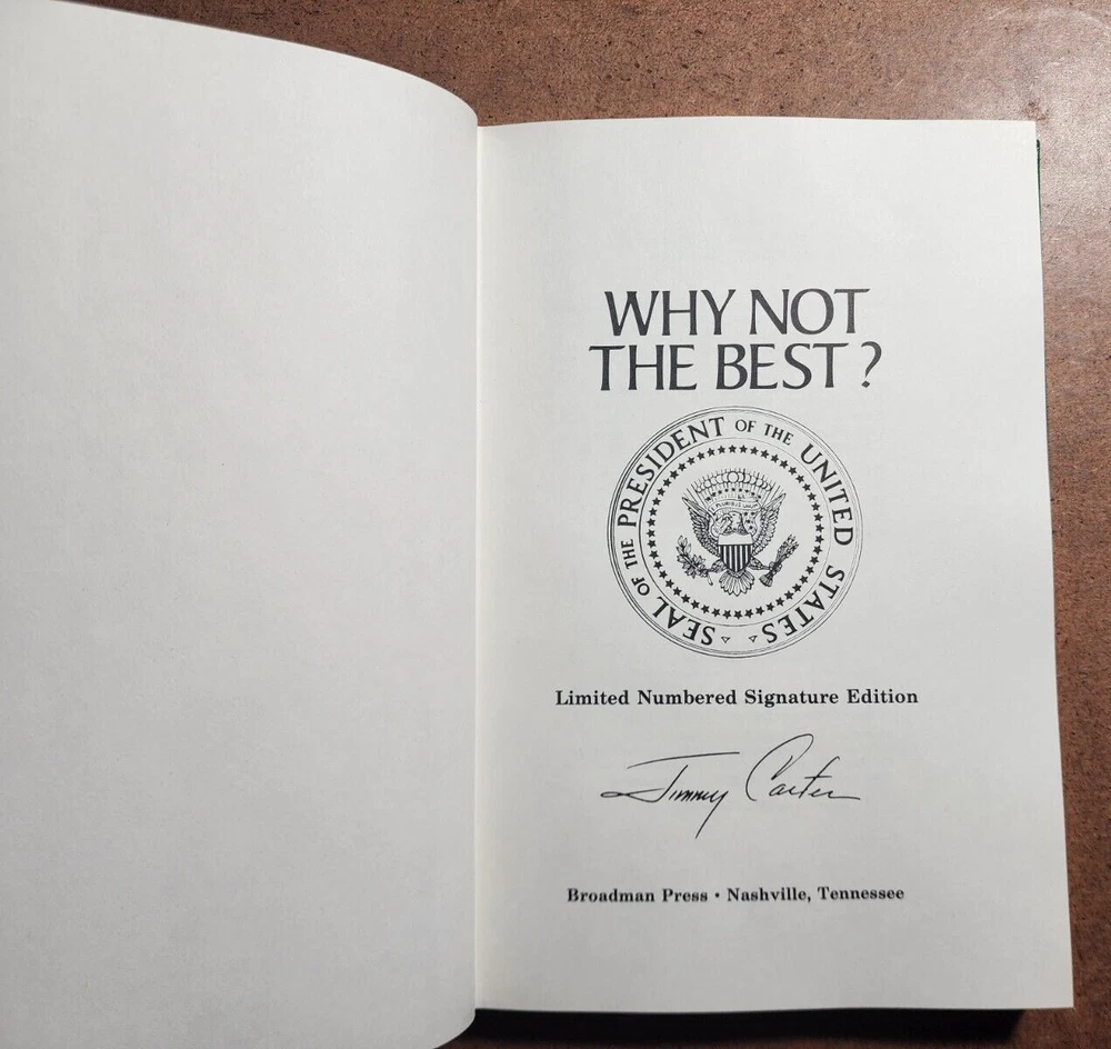 WHY NOT THE BEST? SIGNED by JIMMY CARTER Limited Numbered Signature Edition w/bx This book is in very good condition. All pages are intact. NO rips or damage. This book has been hand SIGNED by former President JIMMY CARTER. No other markings. Limited Edition #337 Comes with the original box as pictured. Please see pics. We have been selling books online since 2003. Our book stock covers a wide range of subjects such as First editions, Signed editions, Fiction, History, and many more. Our Guarantee Any purchase can be returned for any reason; we will fully refund the purchase price if notified within 30 days of receipt and the book(s) is returned in the same condition as sent. Shipping charges will also be refunded if the book has been incorrectly described. Shipping All books shipped to US destinations are sent US Post Office Media Mail. Faster shipping is available, please ask before paying. We will combine shipping on items purchased at the same time. International Buyers - Please Note: Import duties, taxes, and charges are not included in the item price or shipping cost. These charges are the buyer's responsibility. Please check with your country's customs office to determine what these additional costs will be prior to bidding or buying.