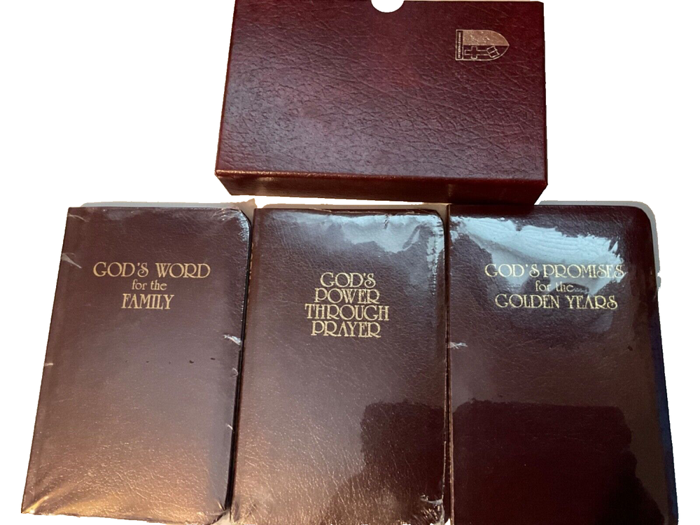 This set of 3 leather bound book is an awesome set. They are bound in genuine leather. They come in a box set. A great item. The set is not sealed but the books are all factory sealed. It would be a great addition to your library. Thanks for looking. It includes the following. 1. GOD’S PROMISES FOR THE GOLDEN YEARS. 2. GOD’S WORD FOR THE FAMILY 3. GOD’S POWER THROUGH PRAYER.