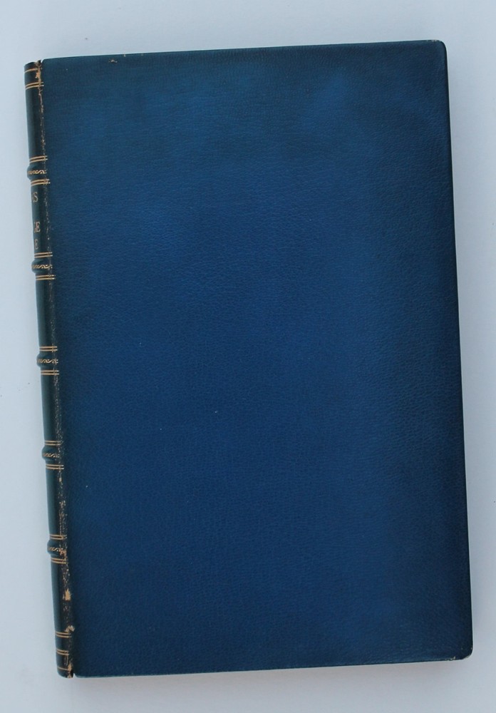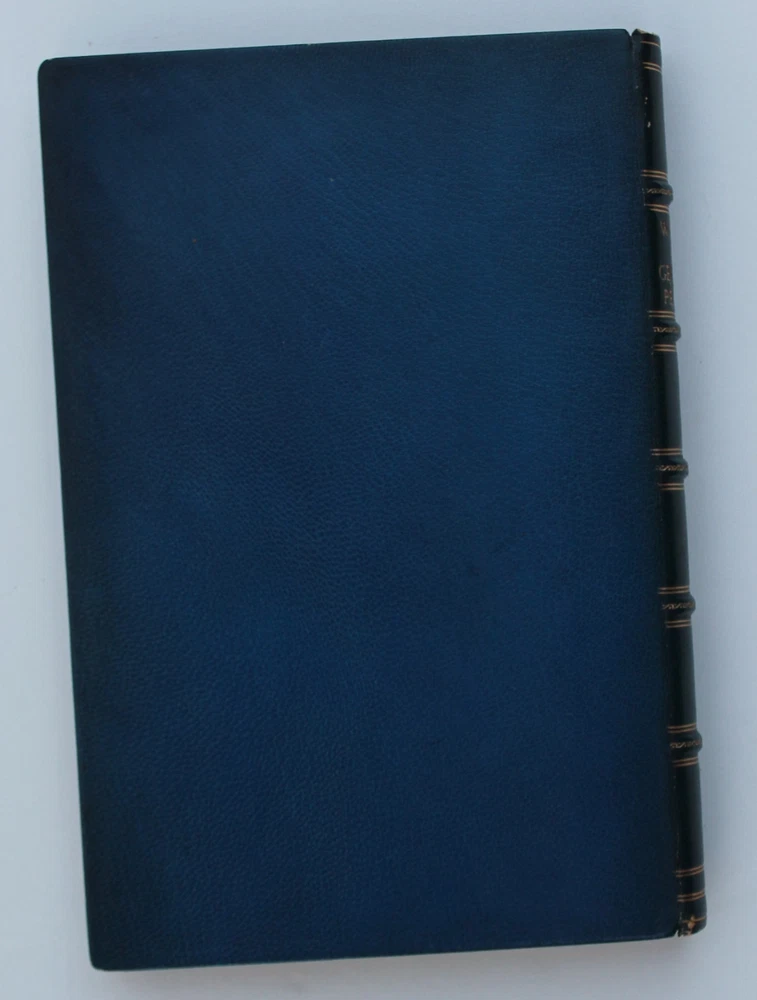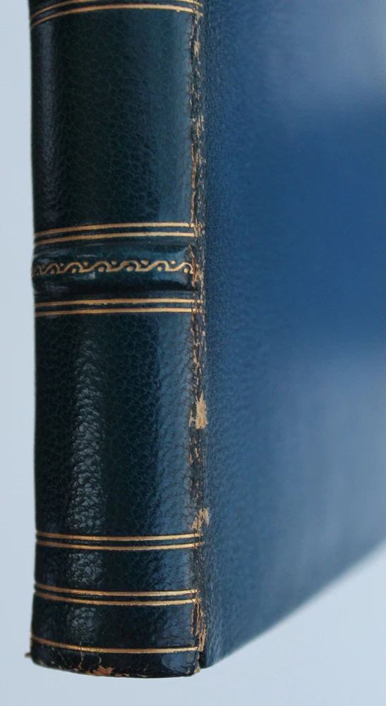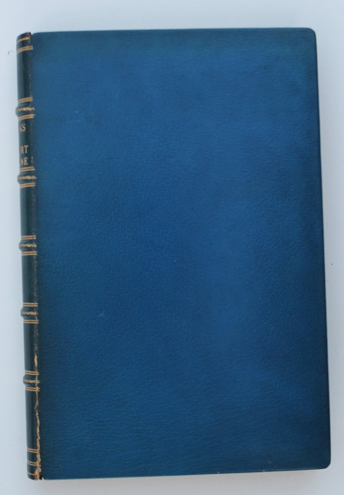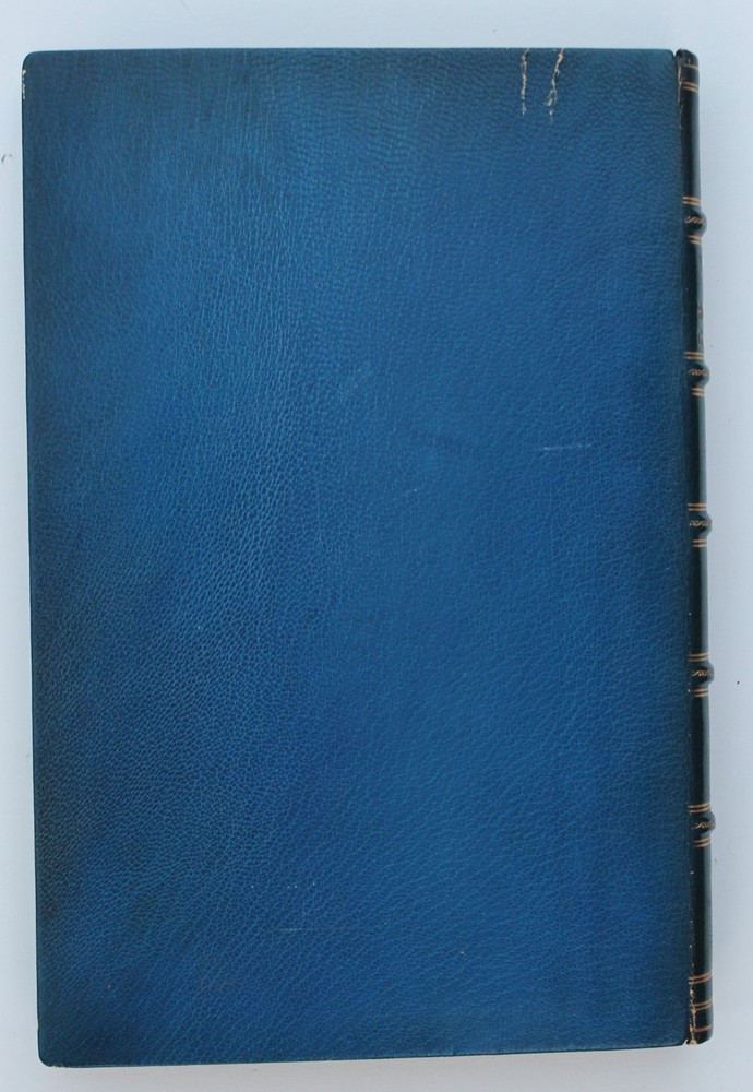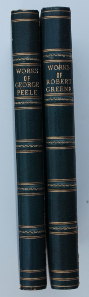 WORKS OF ROBERT GREENE AND GEORGE PEELE IN FULL MOROCCO BINDINGS Dyce, Rev. Alexander (editor). The Dramatic and Poetical Works of Robert Greene and George Peele, with Memoirs of the Authors and Notes . London: George Routledge and Sons, no date. Two vols., 9 1/4" x 6 1/8", viii,320;[321]-624pp. (through-numbered); blue full morocco, spines gilt in six compartments, the morocco turn-ins gilt, marbled paper endpapers (lowermost 2 3/4" of Volume [One's] front outer hinge strained, the narrowest of splits to the bottom 3/4"; two 3/4"-long scratches to the upper edge of this volume's rear cover, a 1/2"-long scratch to the rear cover's center spine edge, superficial cover wear elsewhere; the first 3 preliminary leaves (pp.(i)-vi, following the two binder's leaves) in this volume sprung as a unit, from the cords; Volume [Two's] front outer hinge rubbed a little only, the crown of the spine shaved, two rubbed spots at the foot of the spine; lower edges of both volumes' covers rubbed, adjacent to the outer corners). The volume titles are, "The Dramatic and Poetical Works of Robert Greene" (following the general title-leaf cited here), "The Works of Robert Peele" (without the general title-leaf). Dyce's undated "Notice" in Volume [One] cites his earlier editions of George Peele's works (1828 (two vols.), 1839 (a third volume)) and Robert Greene's (1831, two vols.); he informs the reader that the present two-volume set "...contains the whole of the above-mentioned editions...important alterations, corrections, and additions having been made throughout."