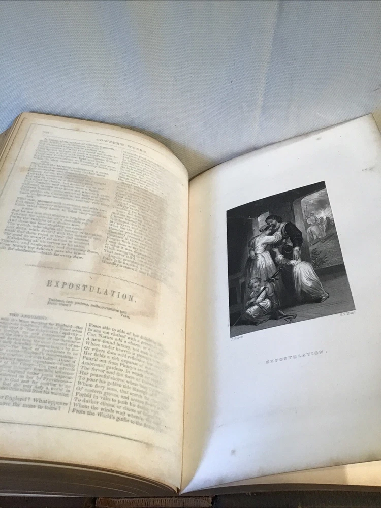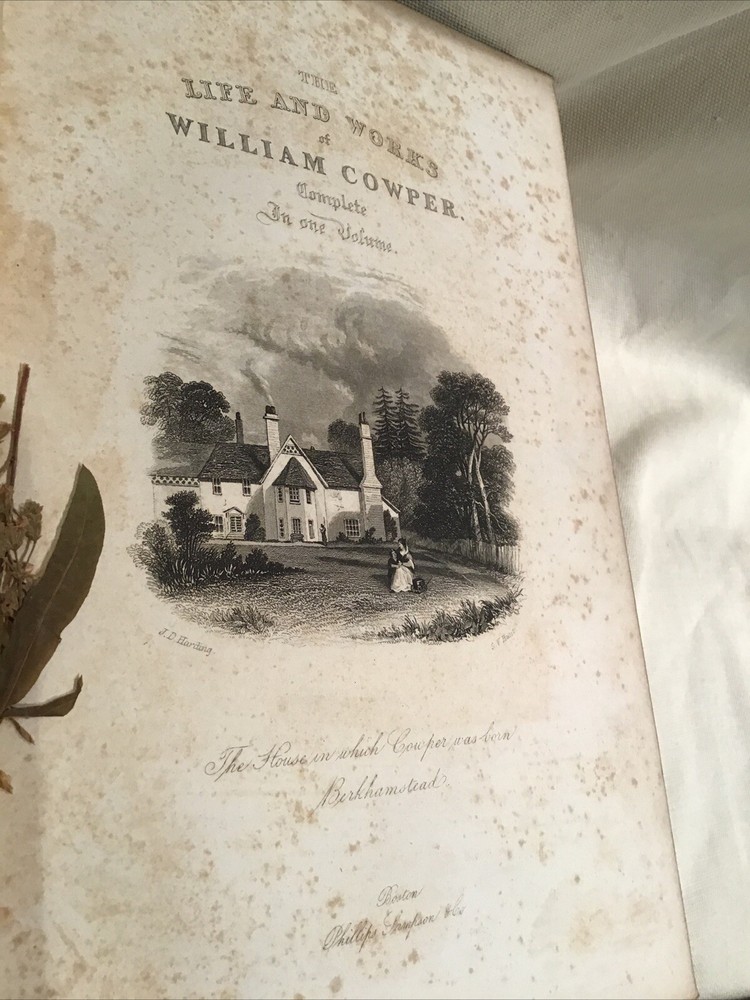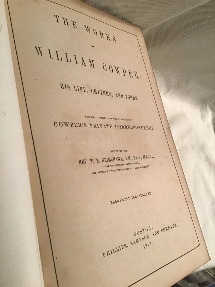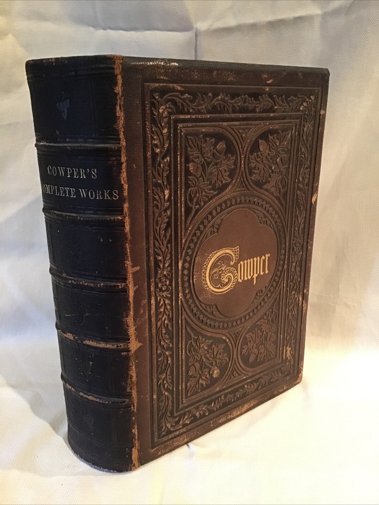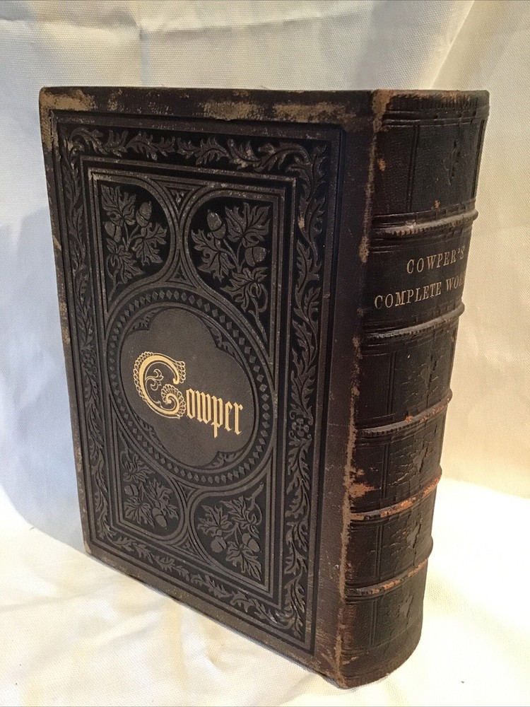 This is an antique embossed leatherbound book titled in gold with the name Cowper on the covers both front and rear. The title page reads The Works of William Cowper His Life Letters and Poems Now First Completed with Cowper's Private Correspondence Edited by Rev. T.S. Grimshawe. The book has beautiful illustrations. It is a gorgeous book with leather covers embossed with oak leaves and acorns. The book is in excellent condition with some scattered foxing. There are 749 pages.