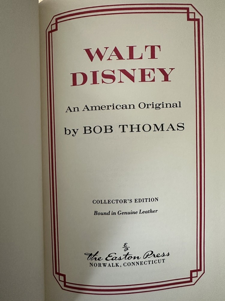 Thank you for checking out my store! Here is a rare opportunity to own a first edition copy of “Walt Disney and American Original,” by Bob Thomas (January 26, 1922 - March 14, 2014), published by the Easton Press in 1997. This limited edition book is bound in leather with gilded edging, and would make an excellent addition to any book collector’s library. Easton Press books are known for their high-quality, collectible editions, and this book is no exception. Modified to enhance its value and appeal, it is a one-of-a-kind item. These limited edition books are a great investment and will continue to increase in value for years to come. Easton Press books are also known for the following distinctive qualities: • Premium leather • Silk Moire end leaves • Distinctive cover design • Hubbed spine • 22KT gold accents • Satin ribbon page marker • Gilded page edges • Long-lasting, high quality acid-neutral paper • Smyth-sewn pages for strength and durability Note - This is a 27 year old book that has never been read. The book is in near mint condition. Please see pictures. Expedited shipping available. Please feel free to reach out with any questions! I have hundreds of Franklin Library and Easton Press books for sale. Do not hesitate to ask for a specific title.
