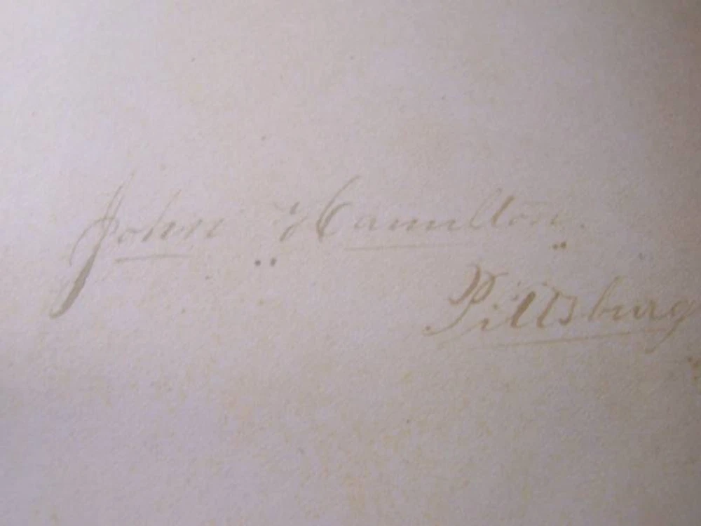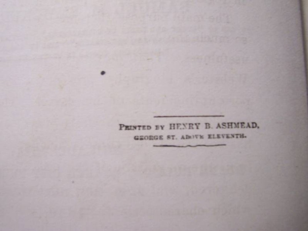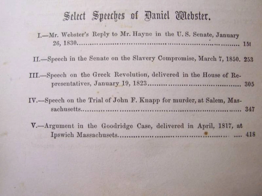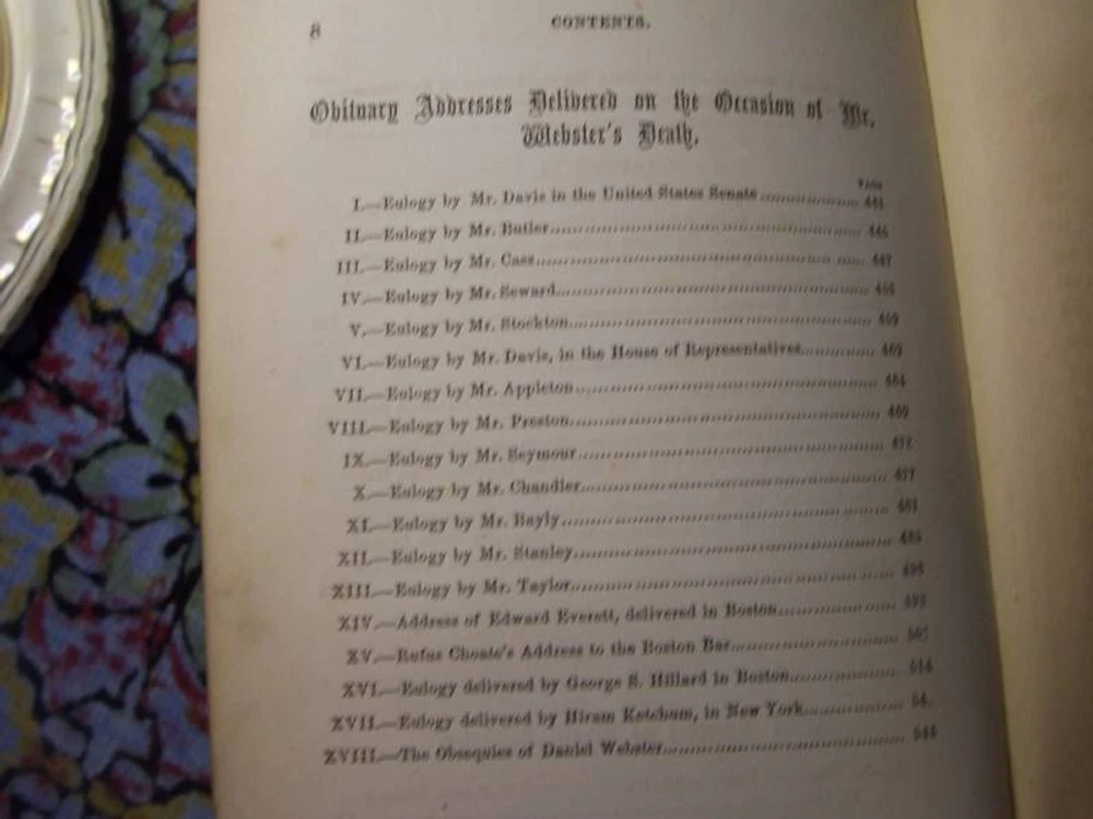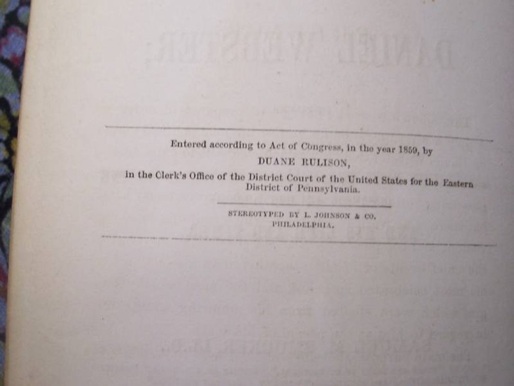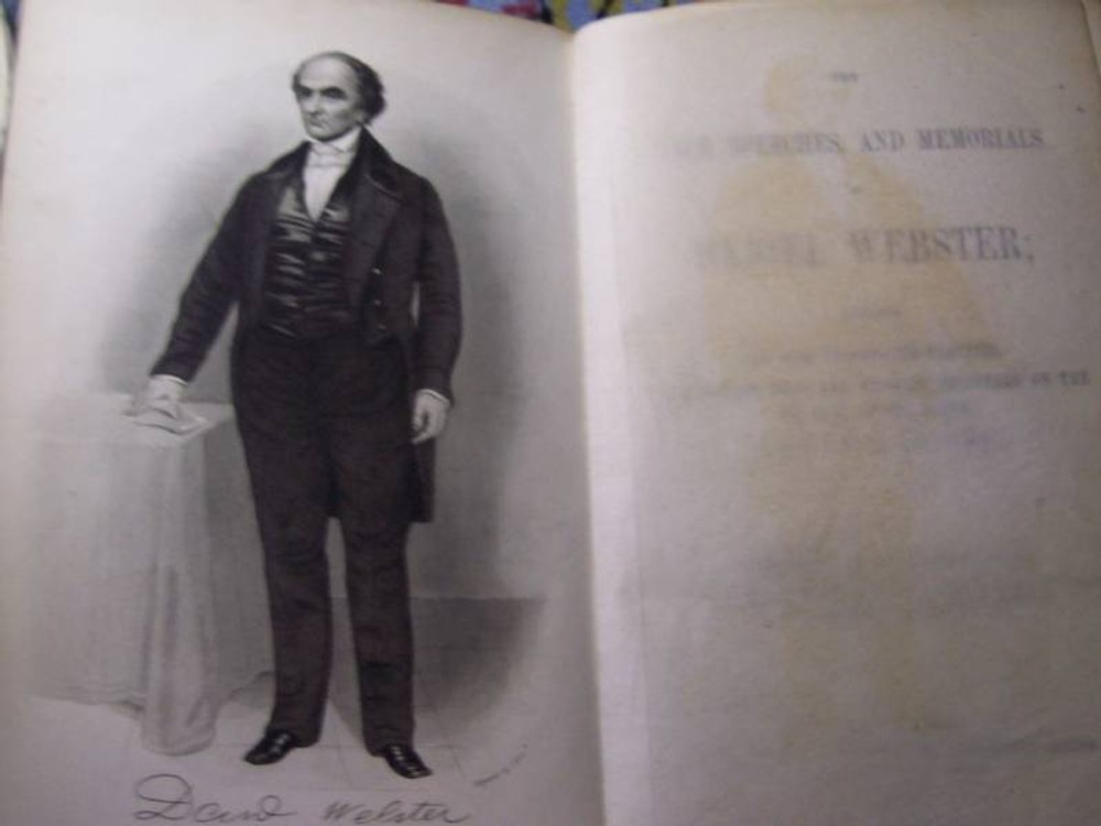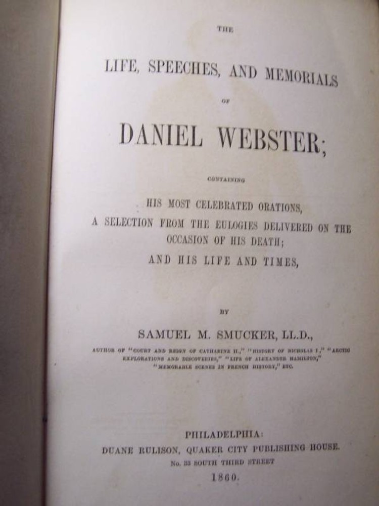 Up for a 5 Day Auction is this book: "WEBSTER" The Life, Speeches, and Memorials of containing His Most Celebrated Orations, a Selection from the Eulogies Delivered on the Occasion of His Death; And His Life and Times. It was written by Samuel M. Smucker, LL.D. It was published by Duane Rulison, Quaker City Publishing House, Philadelphia, in 1860. The date of copyright is 1859. It may well be a first edition but not a first printing. It is 52 pages in length. It is leather bound with embossed scrollwork on the boards and WEBSTER in gold leaf. There is an owner's name beautifully inscribed at the front of the book, but faded. The name is John Hamilton, Pittsburgh, Pa. This is a veritible treasure trove of the early history of our country. As can be seen from the photos, there is deep wear to the edgings of the boards and the spine. The lower part of the spine is missing a piece of the cover, again photographed. The hinges are compromised but the binding of the body of the book is quite tight. There is offsetting of the pictures. There is some foxing but overall the pages are free of it to a great degree. The front board has a crease close to the inside lower corner. This book is just a joy!