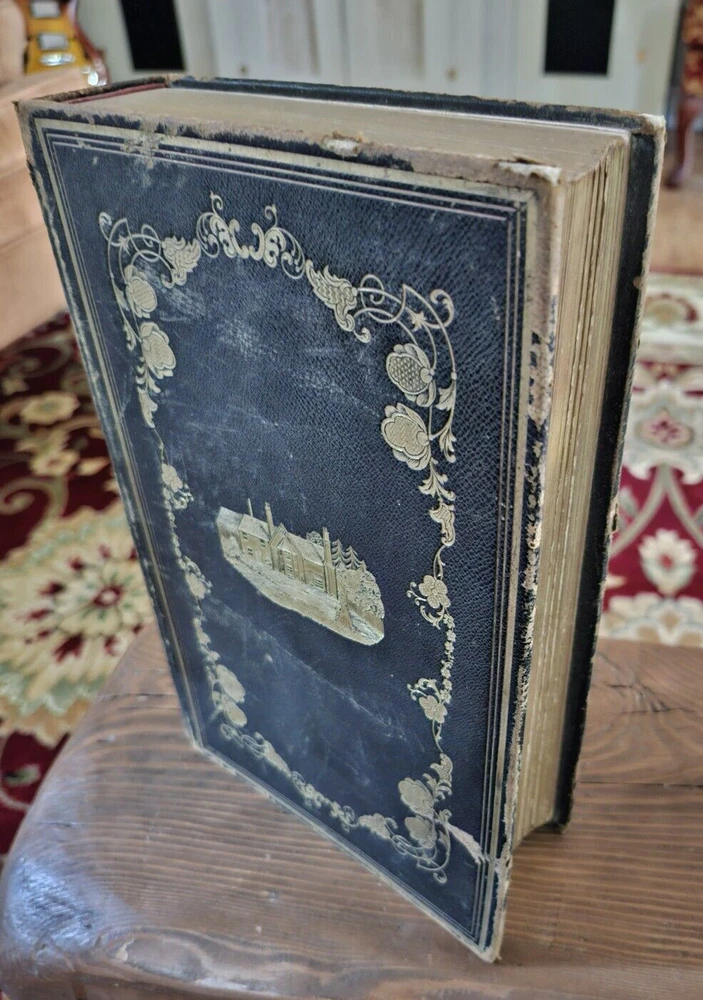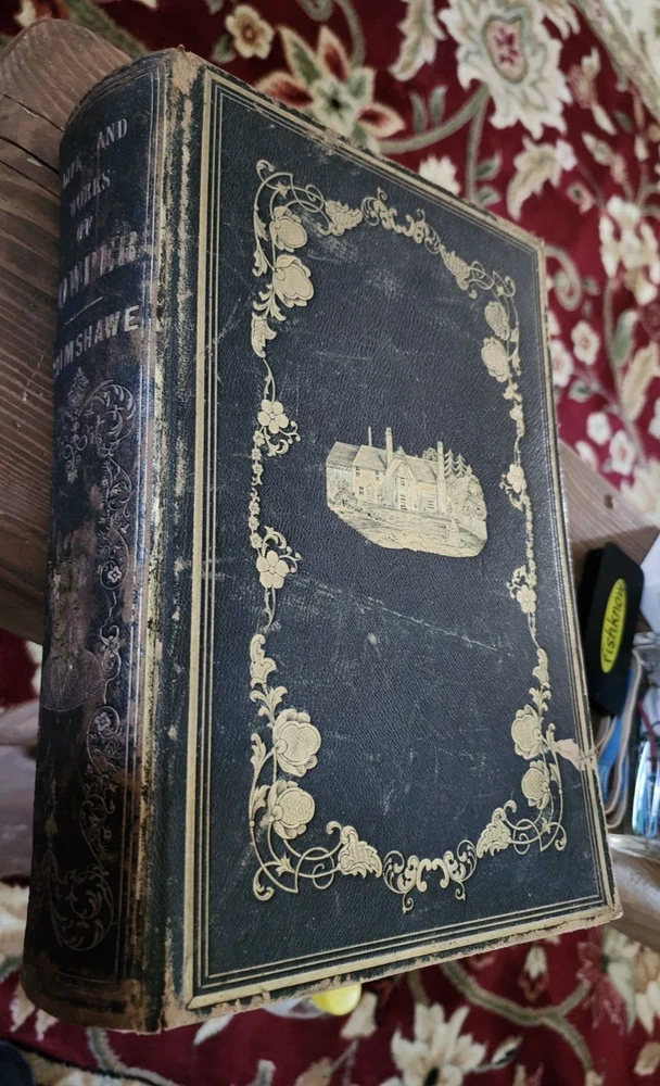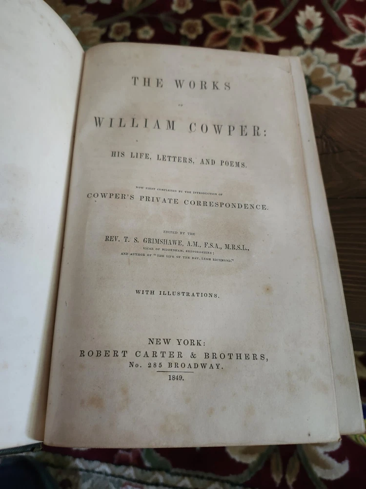 HB book, "The Life and Works of William Cowper: His life, letters, and poems", edited by Rev. Grimshawe, "with Illustrations", "complete in one volume",by Robert Carter and Brothers, 1849 date, 749 pages with a couple pages of ads in the back. Book is in decent shape, leather, gilt/embossed cover design, some moderate wear (especially on the edges), gilt page ends, binding is partially cracking in the front, has small owner sticker in front, some foxing and yellowing, clean pages. A quality book!