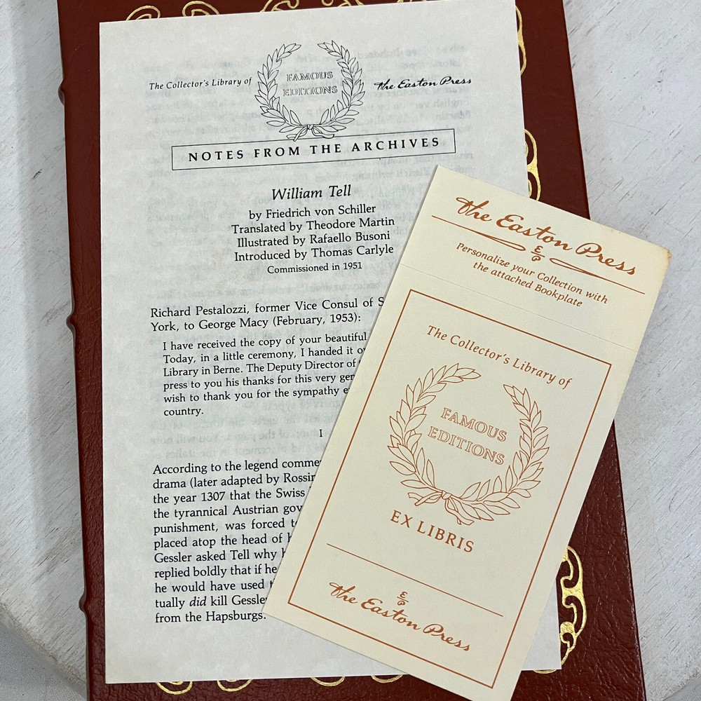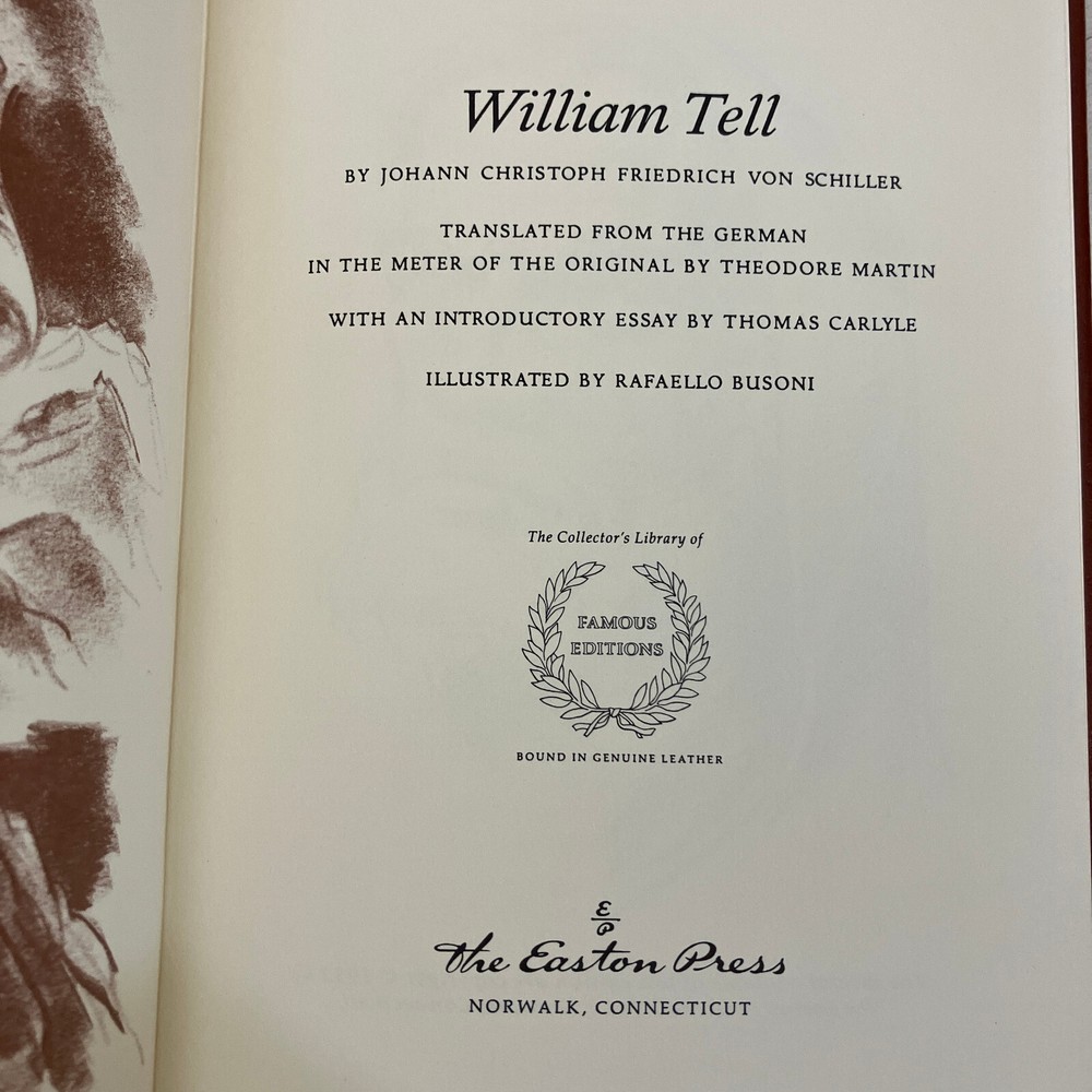 William Tell by Friedrich Schiller Easton Press Famous Editions Library 1952 HC This is a used book with general edge and shelf wear, some fading to the covers and spotting on gilded page edges. Binding is intact, no writing, stains, or unusual smells. See pictures for overview of condition. We are BrightLight Books. We have sold tens of thousands of items online since 1998. Money Back Guaranteed! For Local Pickup in our Fern Park, FL store, please message us! 10-43 (6051507) 11/9/2024 AH