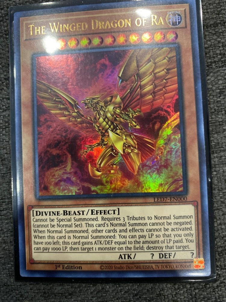 The Winged Dragon of Ra 1st Edition Alternate Art LED7-000 from the Legendary Duelists: Rage of Ra set is a highly sought-after Yu-Gi-Oh! TCG card. This Monster card features 0-0-0 with a unique design, making it a valuable addition to any player's collection. The card is in excellent condition, ideal for both collectors and competitive players looking to enhance their deck with a rare and powerful card.