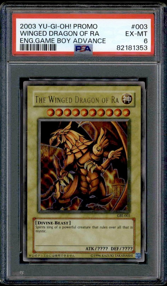 Winged Dragon of Ra GBA 2003 #GBI-003 (PSA 6) Winged Dragon of Ra GBA 2003 #GBI-003 (PSA 6) Enhance your collection with a graded 2003 Yu-Gi-Oh! The Winged Dragon of Ra card. Enjoy the prestige of owning this iconic piece, #GBI-003, graded PSA 6. This Yu-Gi-Oh! card, from 2003 is part of the Yu-Gi-Oh! card set. The Winged Dragon of Ra is featured and has a card number of GBI-003 . It is graded by PSA and has a numeric grade of 6 . About Us Welcome to Super Catch , your trusted source for authentic sports cards , video games , and autographed memorabilia . Based in Phoenix, Arizona , we’ve proudly served thousands of satisfied customers who share our passion for collectibles and gaming culture. At Super Catch , we specialize in a wide selection of graded sports cards , sealed video games , vintage titles , and certified autographs from your favorite athletes and entertainers. Whether you're a collector , a gamer , or searching for the perfect gift , we’re committed to offering high-quality items with fast shipping and top-rated customer service. We stock inventory from all major sports and gaming brands including Topps , Panini , Upper Deck , PlayStation , Xbox , Nintendo , and more. Each item is carefully inspected and packaged with care, ensuring it reaches you in great condition. Browse our store often—we’re always adding rare finds , limited editions , and exclusive collectibles you won’t want to miss. Thank you for choosing Super Catch . We appreciate your business and look forward to earning your trust as your go-to source for sports cards , games , and autographs ! Condition for Modern Cards (Post-1980) Modern cards are listed in Near-Mint to Mint condition or better unless otherwise specified. At first sight, a Near-Mint card could appear to be Mint, but closer study may reveal small print flaws (such as roller marks, print lines, or dimples), tiny scratches, slight edge wear, or slight corner wear. The card will be on center, unless otherwise noted. Condition for Vintage Cards (Pre-1980) Vintage cards are classified in Excellent condition or better unless otherwise stated. Cosmetic issues that may be present on an Excellent card: mild corner rounding, surface wear, print flaws, minor scratches, and minimal edge wear/chipping. The card will be on center, unless otherwise noted. Condition for Video Games Video games are classified in Good condition or better unless otherwise stated. Cosmetic issues that may be present on a good game: minor cosmetic flaws (scratches, discoloration, chips), Return Policy Only in the unlikely event that the item is not exactly as described are returns permitted. Please start the return procedure through eBay if you are returning something so that a mailing label may be made available to you. Prior to listing, our expert team carefully assessed this item to represent it accurately. Please review the description and high-definition images prior to purchasing to ensure this item meets your satisfaction. We welcome you to contact us if you have further questions about this item.