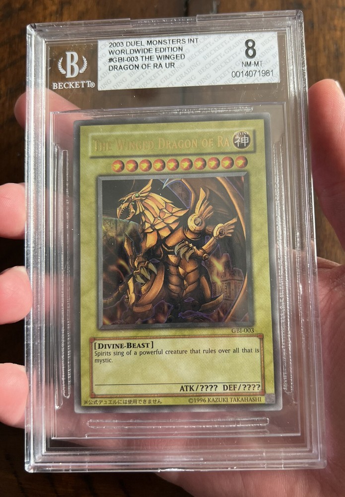 Winged Dragon of Ra GBI-003 (2003) BGS 8. Potentially Better PSA!. Selling my The Winged Dragon of Ra GBI-003 2003 Worldwide Edition UR card. The card was always kept in a top loader and sleeve, so I was surprised to only get an 8 from BGS. Maybe it would be better graded by PSA. If you have any questions, feel free to message me!