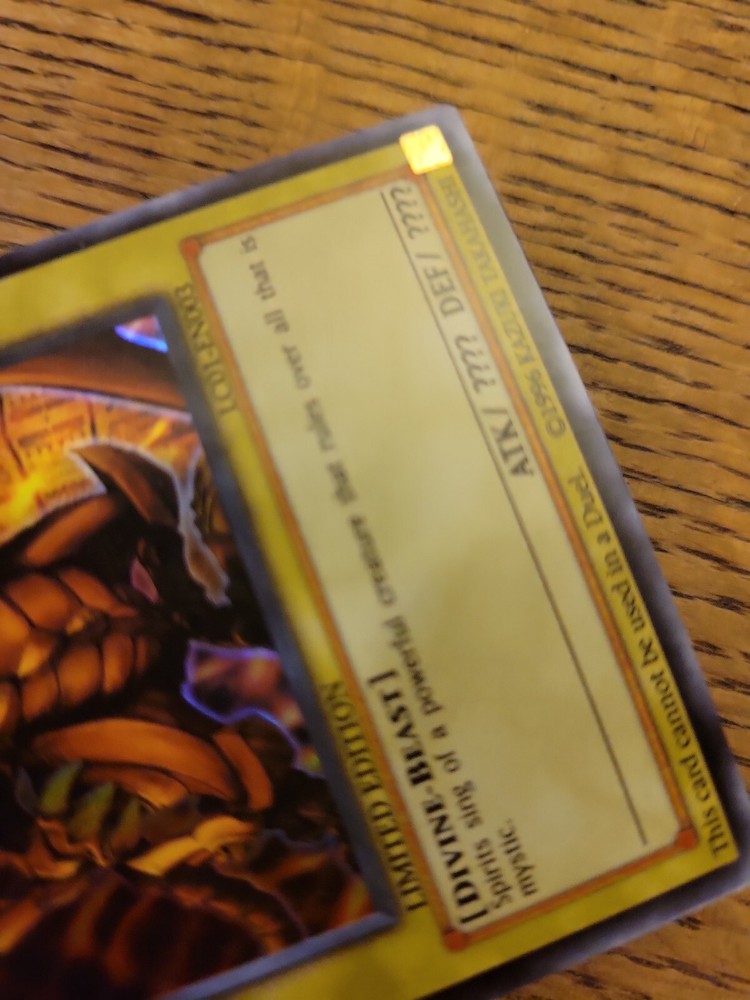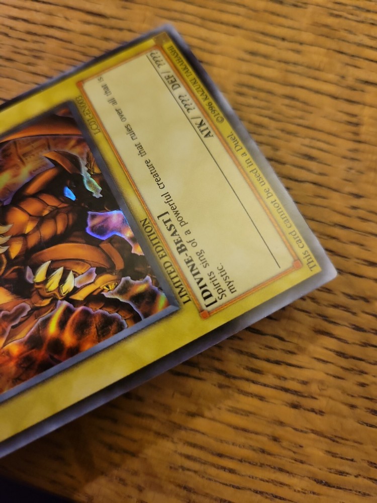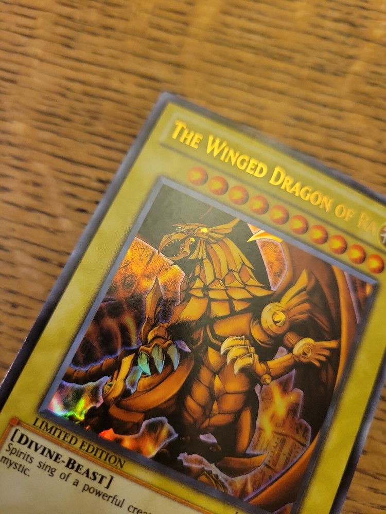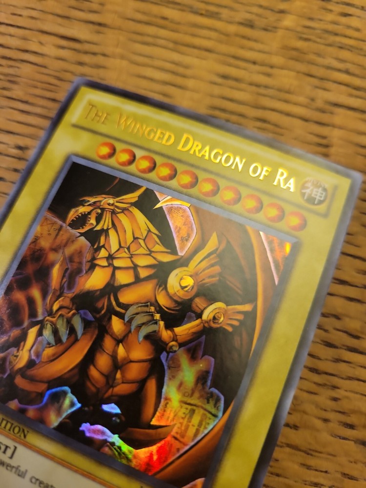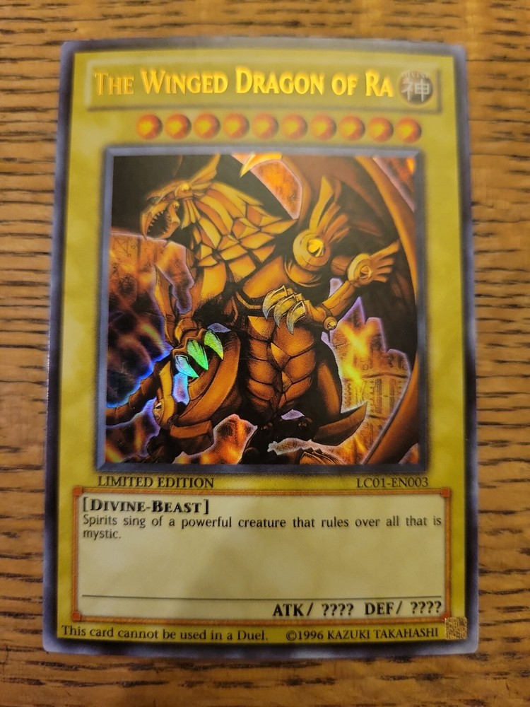 This Yu-Gi-Oh! TCG card is a limited edition Winged Dragon of Ra from the golden set that features exquisite foil finishing. It is an ultra-rare card with 10 stars for cost, a divine-beast creature type, and 4000 HP, defense, and attack power. The card is in near mint condition or better and bears the manufacturer name of Konami. The Winged Dragon of Ra is a standard-sized card with a card number of 3, written in English language, and has a color attribute of light. It also has an EX speciality, normal card type, and an autographed feature. This collectible card game item is perfect for enthusiasts and collectors who are looking to add a unique piece to their collection.