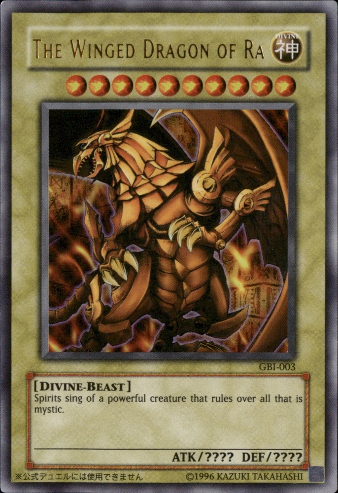 The Winged Dragon of Ra card in the Yu-Gi-Oh! TCG is a highly sought-after Ultra Rare collectable. As a Monster type card, it holds significant value for collectors and players alike. This Promo GBI-003 card is a must-have for fans of the game, showcasing the powerful and iconic Winged Dragon of Ra character in the popular Yu-Gi-Oh! franchise. With its rarity and ties to the game, this card is sure to be a prized possession for any collector of CCG individual cards.