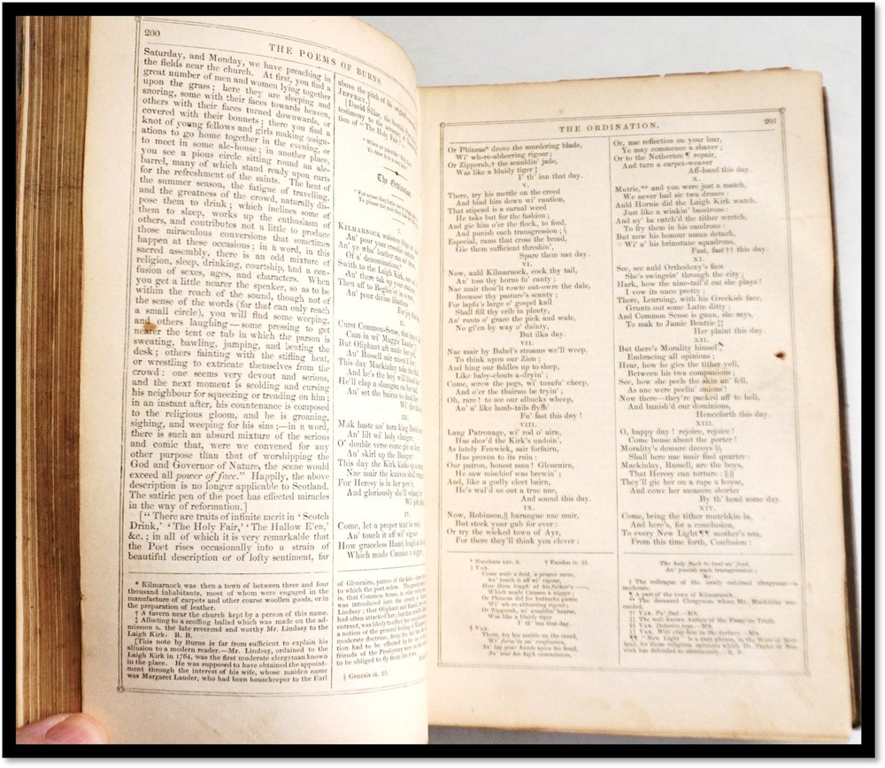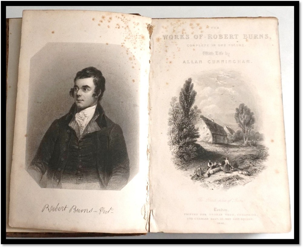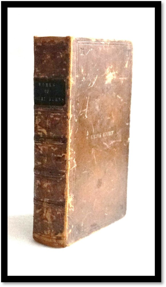 Building Your Great Collection; One Fine Book at a Time The Works of Robert Burns Complete in One Volume With Life By Allan Cunningham Burns, Robert (1759–1796) New York: T. Tegg, London, 1840 Full leather with 5 spine bands; all edges marbled; engraved title-page and frontispiece; 9.5 inches tall; 820 pages with a glossary, index of first line and general index. The spine and boards are worn with bumps and rubs; previous owners name embossed in gilt on the front board. Front free marbled endpage detached; early preliminaries are a bit weak to the signature that ends with page 46, remainder is tight, clean with a bit of expected age-toning Good / No Dust Jacket As Issued. Robert Burns was a Scottish poet and lyricist, widely regarded as Scotland’s national poet. Known for works like Auld Lang Syne and Tam o' Shanter, he captured Scottish folk culture, romance, and social themes in Scots and English. His poetry, rich in wit and humanity, inspired the Romantic movement. Despite a short life, his legacy endures, celebrated annually on Burns Night (January 25) with recitations, songs, and traditional Scottish festivities. And Check out our other items ! Member of ABAA [American Booksellers Antiquarian Association] FABA [Florida Antiquarian Booksellers Association] IOBA [International Online Booksellers Association] The Ephemera Society of America Terms Guarantee We tend to be conservative in our grading, but even the best booksellers make an occasional mistake. Our books, and ephemera are described using AB Bookman standards. Our Guarantee: All items will be received as advertised and in the condition described. Any item is returnable for any reason within 30 days of receipt (prior notice appreciated). If you have questions regarding our description of any item, we encourage you to contact us prior to buying. We are members of the ABAA (Antiquarian Booksellers Association of America) and the Independent Online Booksellers Association (IOBA), and we adhere to these associations' strict ethical guidelines and conditions of sale. Shipping Standard shipping is by USPS Media Mail. Delivery typically takes 4 – 8 days (and sometimes longer) depending upon destination. We are happy to upgrade shipping to Priority Mail or to arrange overseas shipping to most foreign countries. Please choose that at checkout. Feedback We leave feedback for buyers once they have posted feedback for us. If you are unhappy with any aspect of a transaction with us, please contact us immediately. Our priority is to make customers happy and to resolve problems as promptly as possible. This listing was created by Bibliopolis.