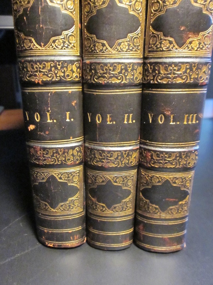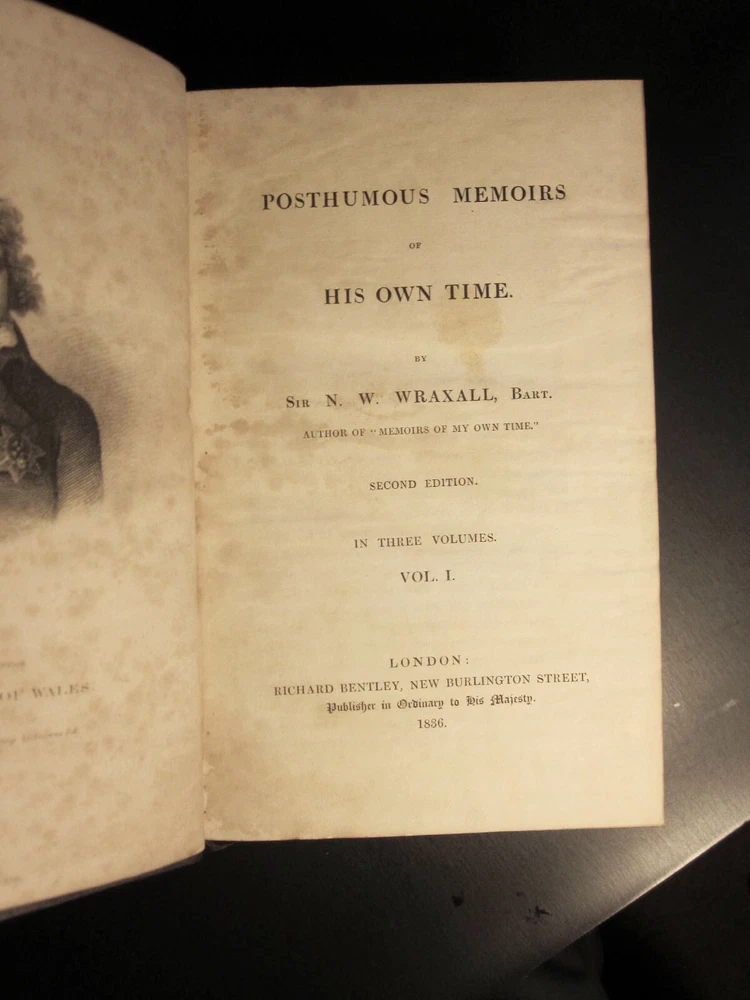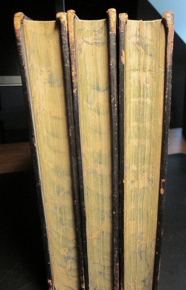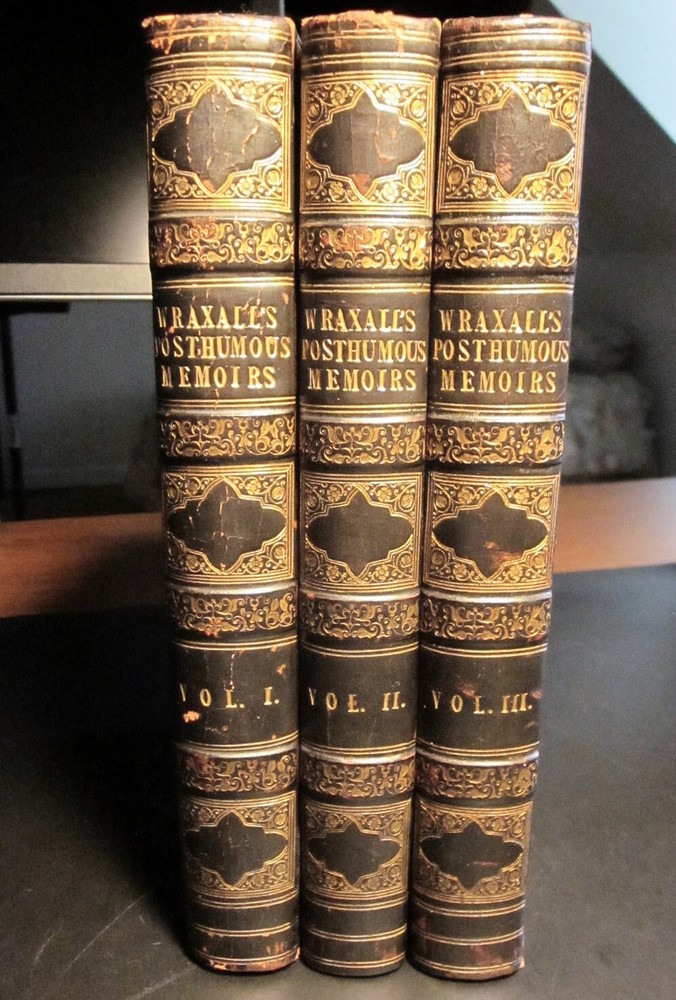 Wraxall, N.W. POSTHUMOUS MEMOIRS OF HIS OWN TIME. London: Richard Bentley, 1836. Second edition.Three volumes complete.1st Edition. . Complete with six engraved portraits. Bound in full black leather, gilt ruled , all edges marbled to match the interior marbled boards. 8vo ,about (6"x9").Gilt decorated spines. Leather covers have an embossed diamond imprint CONDITION: A very good set, complete and tightly bound. Scratches and minor wear (please see pics). Some foxing especially to title pages and portrait. TERMS: By bidding you are agreeing to settle the transaction within three business days. Shipping is free to U.S. bidders via media rate. Tracking will be provided. International bidders please use eBay's Global shipping program. Returns accepted within thirty days for any reason with prior approval. You must be pleased. The item in the photograph is the item you will receive.