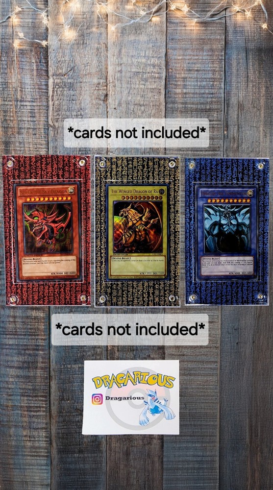 *Yugioh Cards Not included* X3 Yugioh Prismatic Hyrogliphics Egyptian Gods Case Slabs - Winged Dragon of Ra, Slifer The Sky Dragon, Obelisk The Tormentor Custom made prismatic yugioh hyrogliphics cases. Includes the exact cases and custom backgrounds pictured here. Does not include the card. The custom background is printed on a thick cardstock and makes a perfect extended artwork display of the card. It will come in a brand new official One-Touch Ultra Pro Case that has a recessed pocket for the card, so there is no damage to your card! Includes: X3 One-Touch Ultra Pro Screwdown Cases, Custom Backgrounds, perfect fit yugioh card sleeves, and perfect fit case sleeves. Will ship the same or next day secured in a small box! Check out all my other custom slabs. Let me know if you want anything custom made for any Pokémon or Yugioh card! I can make a custom bundle at a discount for you if you want multiple. I'm happy to work with you to give you the best price!