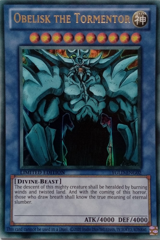 YGLD-ENG02 OBELISK THE TORMENTOR ULTRA RARE LIMITED EDITION ALL YU-GI-OH CARDS I SELL ARE KONAMI TOURNAMENT LEGAL. CARDS ARE ALL NEAR MINT TO LIGHTLY PLAYED CONDITION POSTAGE IS FREE SO YOU CAN BUY AS MANY CARDS AS YOU WANT FROM US AND NOT PAY A PENNY POSTAGE. IF YOU HAVE ANY QUESTIONS PLEASE FEEL FREE TO CONTACT ME. Track Page Views Wi4.9 Auctiva's FREE Counter