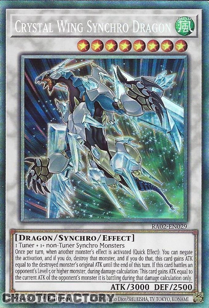 Collector's Rare RA02-EN029 Crystal Wing Synchro Dragon 1st Edition NM YU-GI-Oh! Product details (click to expand) Condtion Details NM Mint or Near mint LP Light Played, minor scatch or edge wear HP Heavy Played; very visible damages NOTE Refer to ebay's condition guide for further details Specifications (click to expand) SKU RA02-EN029-CR Model # Barcode # Brand YU-GI-Oh! Artist / Author Shipping Weight 0.0200kg Shipping Width 0.000m Shipping Height 0.000m Shipping Length 0.000m Shipping Cubic 0.000000000m3 Unit Of Measure ea Assembled Length 0.000m Assembled Height 0.000m Assembled Width 0.000m Type Format Delivery & Turn Around time (click to expand) Packing We always pack with toploader & soft sleeves Postage Method - Doemstic Standard Untracked Untrack letter post, delivery within 15 business days Domestic Tracked Tracked letter post, delivery within 15 business days with tracking Express Post Express Post; delivery after 2 to 3 business days after dispatch using AUSPOST's express network, exclusion applies; check auspost's website for details Turn Around time Dispatch 2 to 3 business days; which mean EXCLUDE WEEKEND © 2025 Chaotic Factory