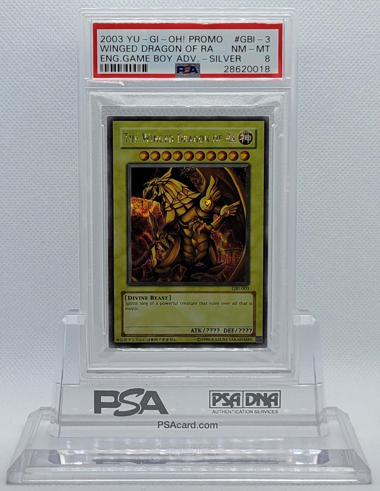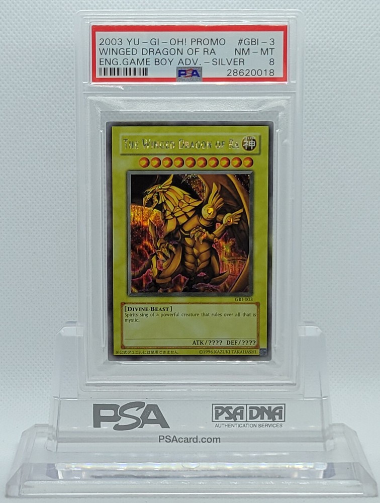 Description Condition: PSA 8 NM-MINT Availability: In Stock You are Purchasing YUGIOH GBI-003 THE WINGED DRAGON OF RA SECRET RARE HOLO FOIL PSA 8 NM-MT #* Professionally graded by Professional Sports Authenticator (PSA) *PSA CERTIFICATE NUMBER MAY VARY FROM PHOTO(S) >>MORE GRADED YUGIOH CARDS<< IG: CARD_RUSH_INC Payment Options Payment is expected within 7 days of your purchase date. We accept all forms of payments through Paypal. Shipping and Handling We ship to all U.S. states, U.S. territories, APO/FPO locations and any international countries listed under our "ship to" heading. Shipping and Handling is calculated based on the combined shipping weight of your item(s). Please use the shipping calculator to estimate your shipping and handling charges. In order to qualify for combined shipping terms, all items must be paid for in one payment; please do not pay until you are done bidding/shopping. Please contact us if you have any questions regarding our shipping and handling terms. Shipping and Delivery Packages are shipped out every Monday, Wednesday, and Friday. Domestic Packages take approximately 2-7 days to arrive. International packages may take a little longer to arrive, typically 1-4 weeks. Please allow ample transit times before inquiring about your package, thank you. Sales Tax Sales tax will be automatically collected by Ebay. Customer Service We will make every effort to get your purchase is mailed in a timely manner. Please contact us if you have any questions or concerns; we would love to hear any suggestions you have on how we can improve your eBay experience. Thank you for visiting us today.